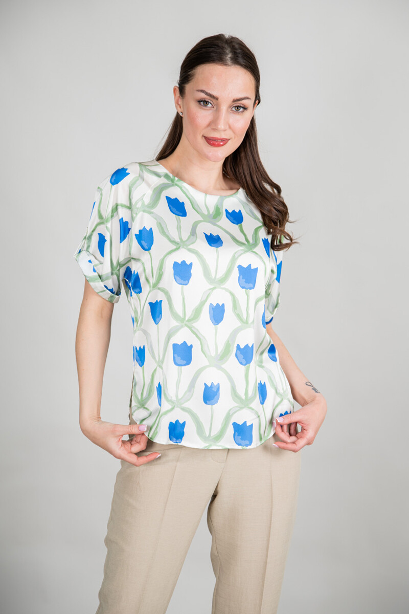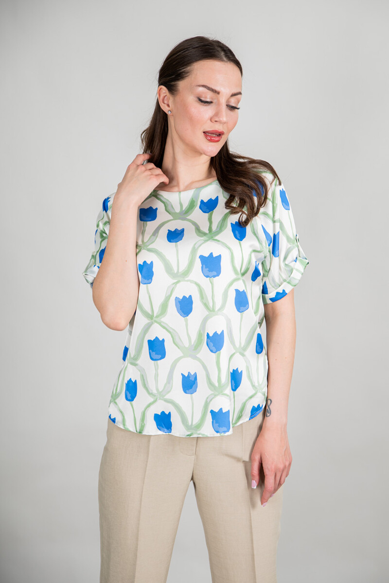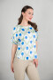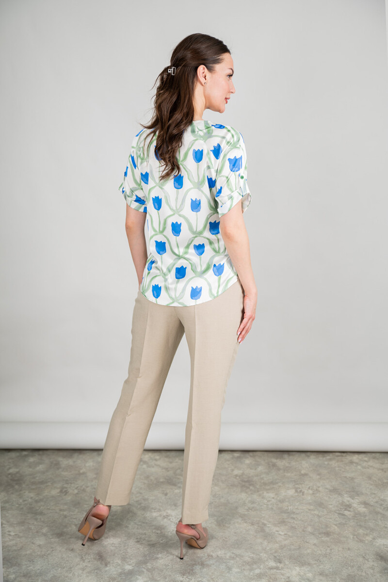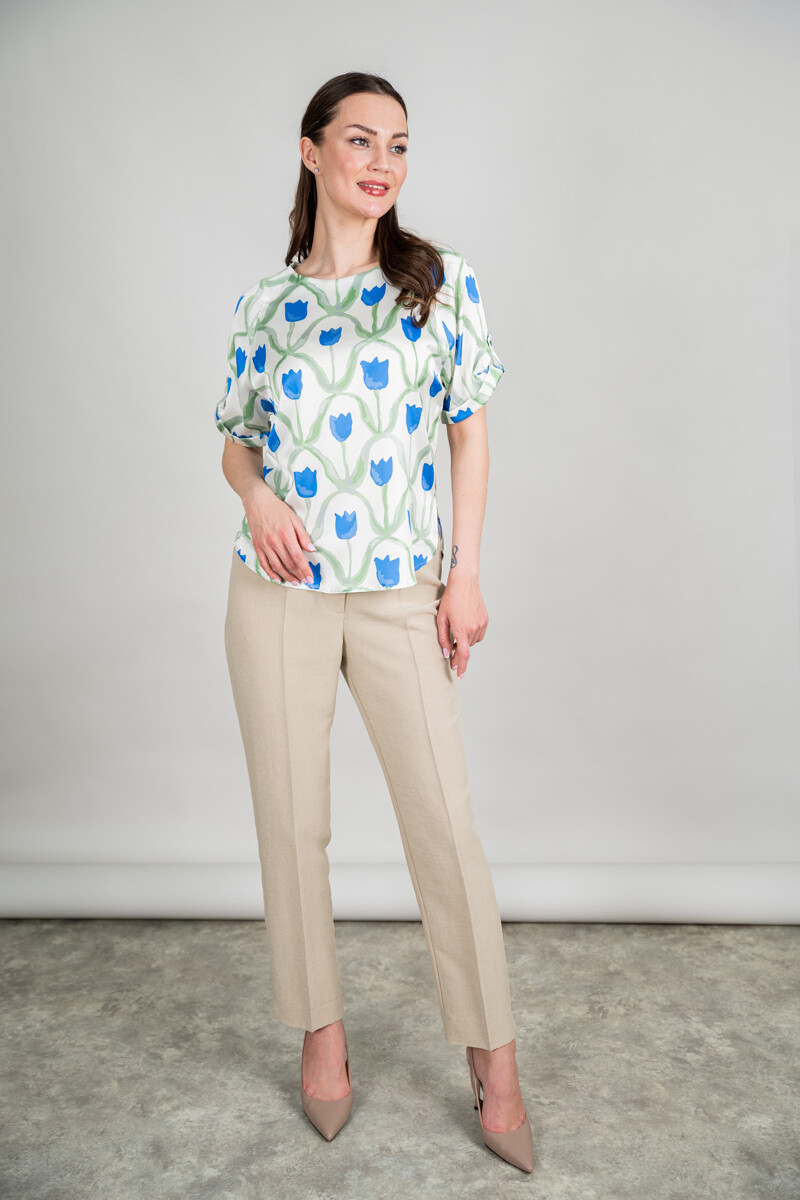 Блузка прямого силуэта. Цельнокроенный рукав с регулировкой на пату обработан отворотом. Боковые швы изделия обработаны разрезами.