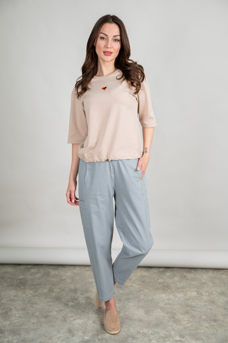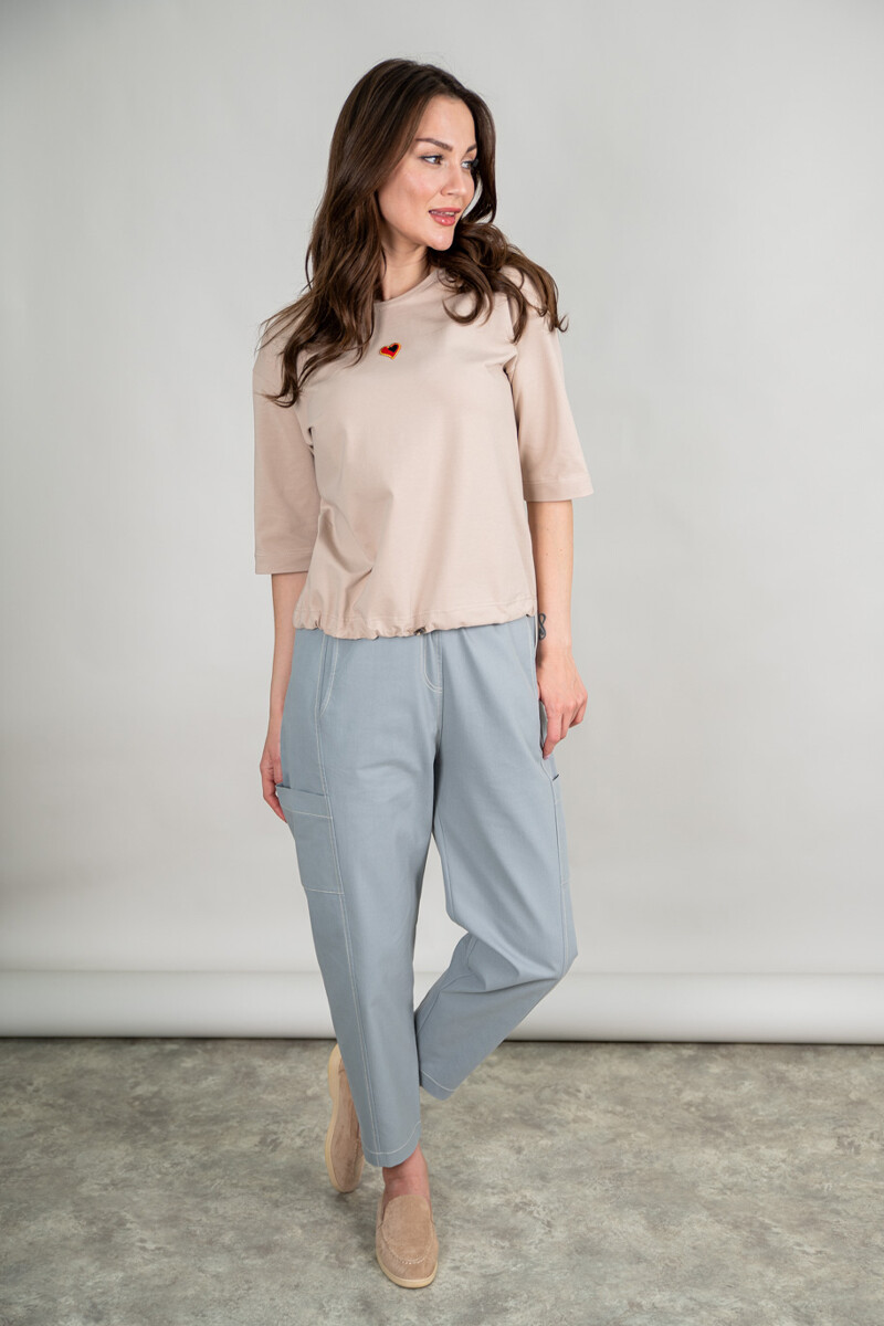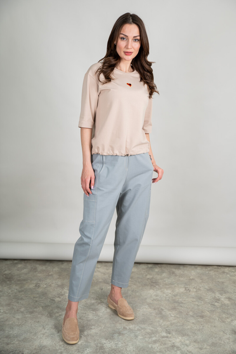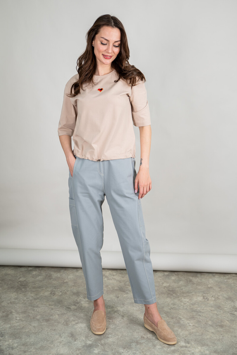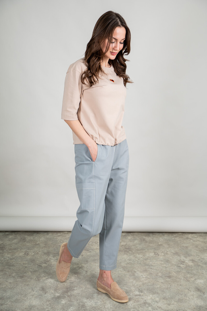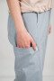 Брюки из джинсы свободного, чуть зауженного к низу силуэта. Накладные карманы, пояс на резинке со шнурком.