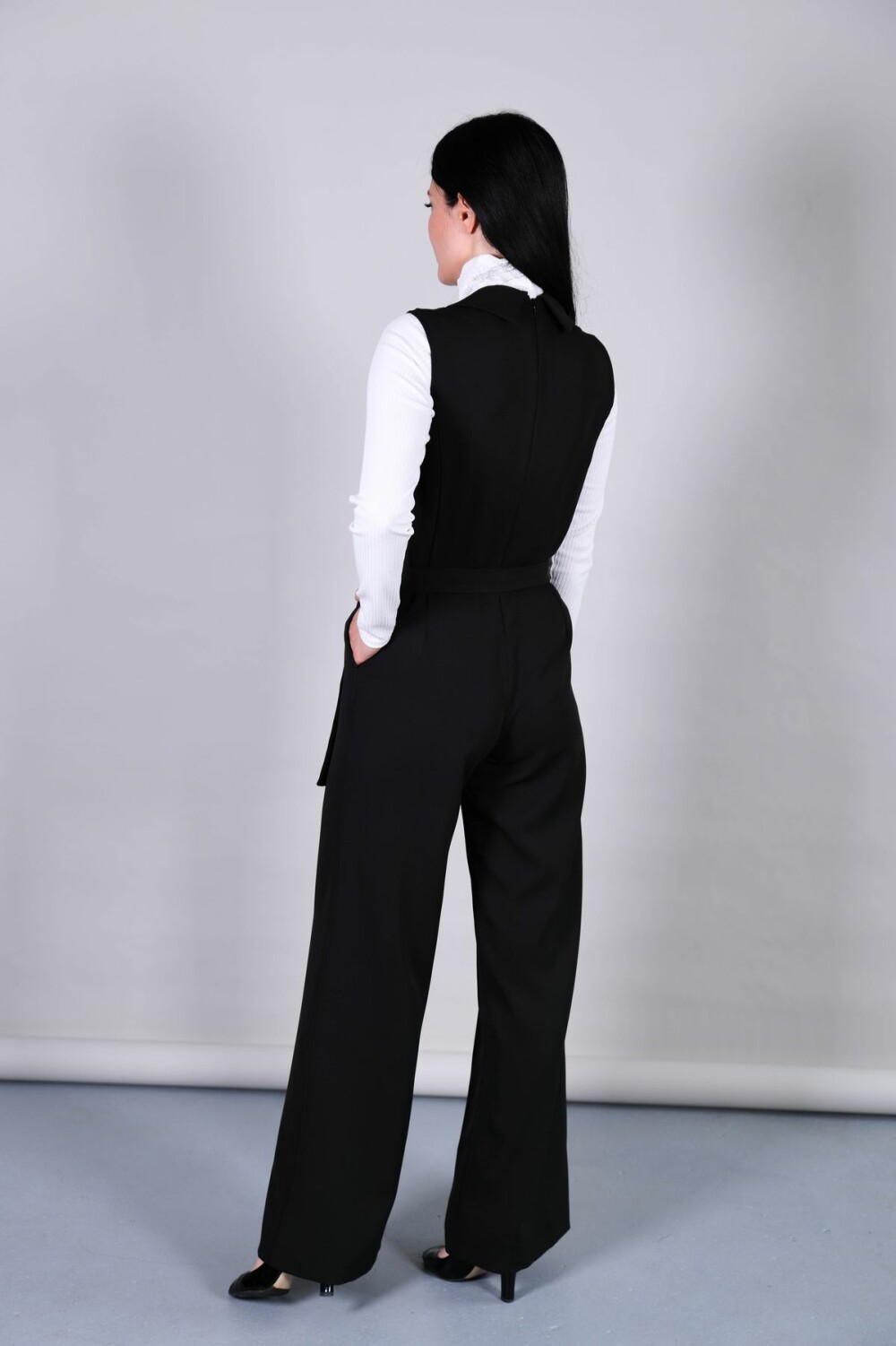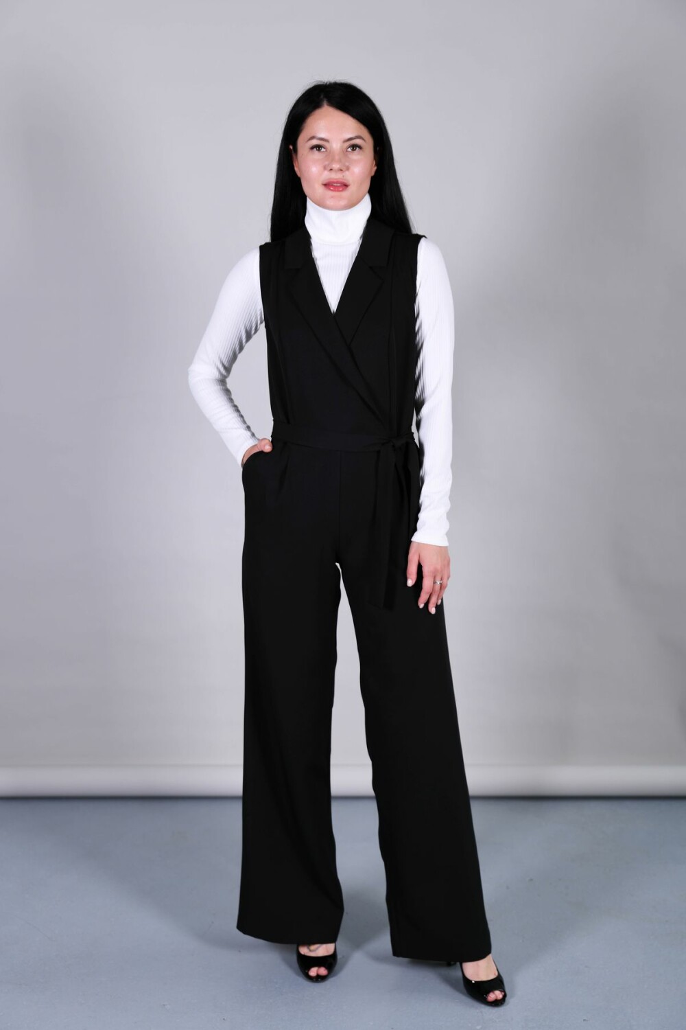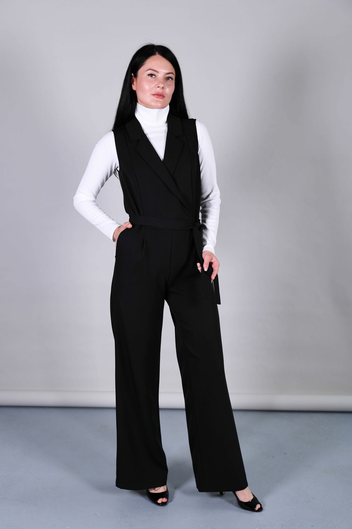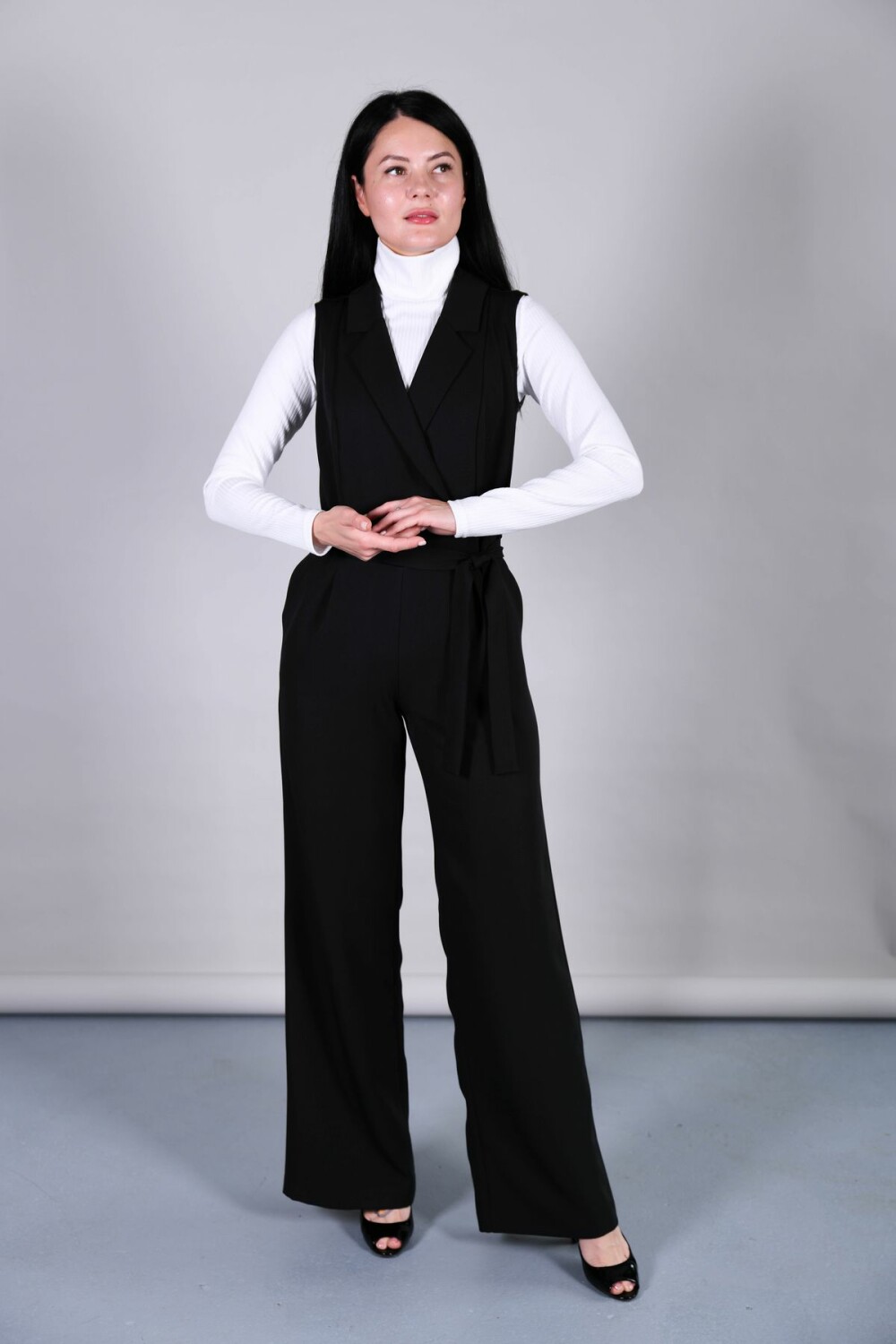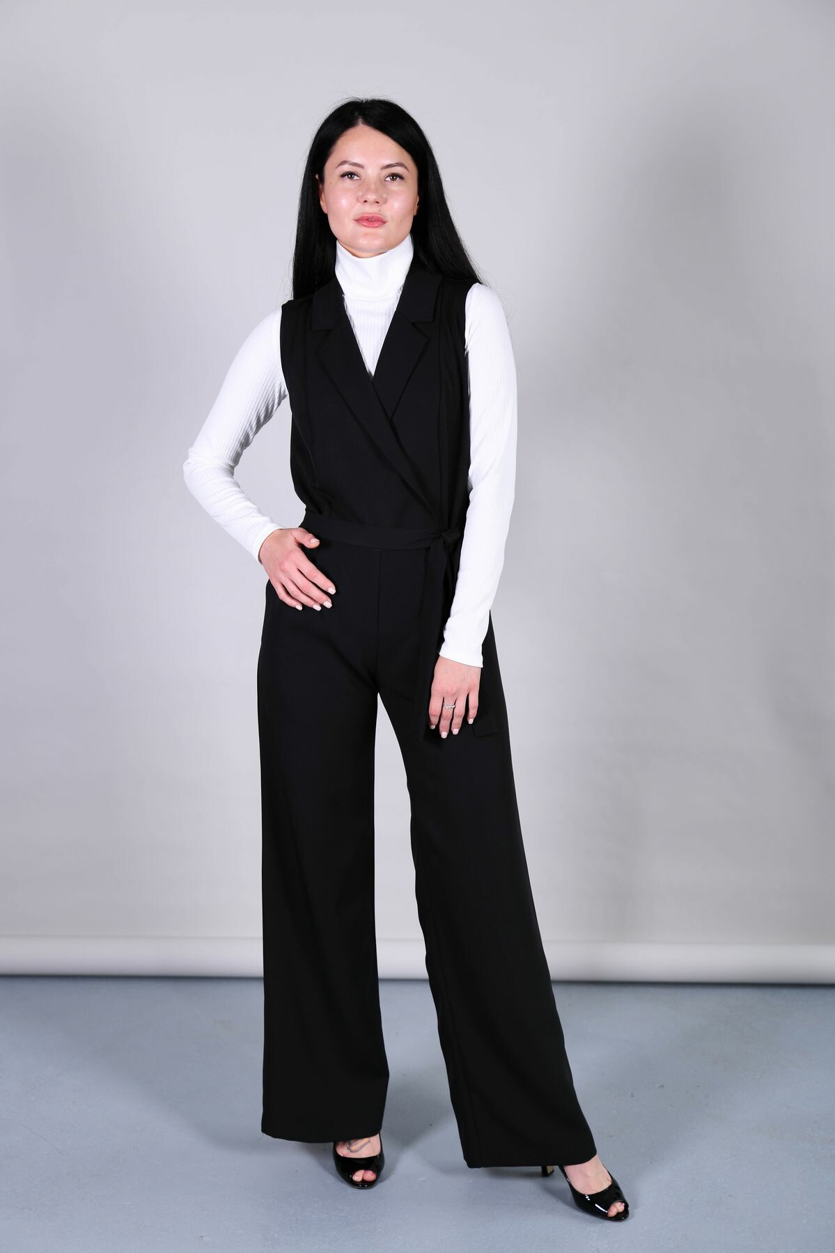 Комбинезон с широкими брюками. В комплекте пояс из основного полотна. Застежка на спинке, есть карманы.