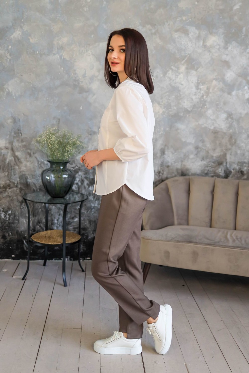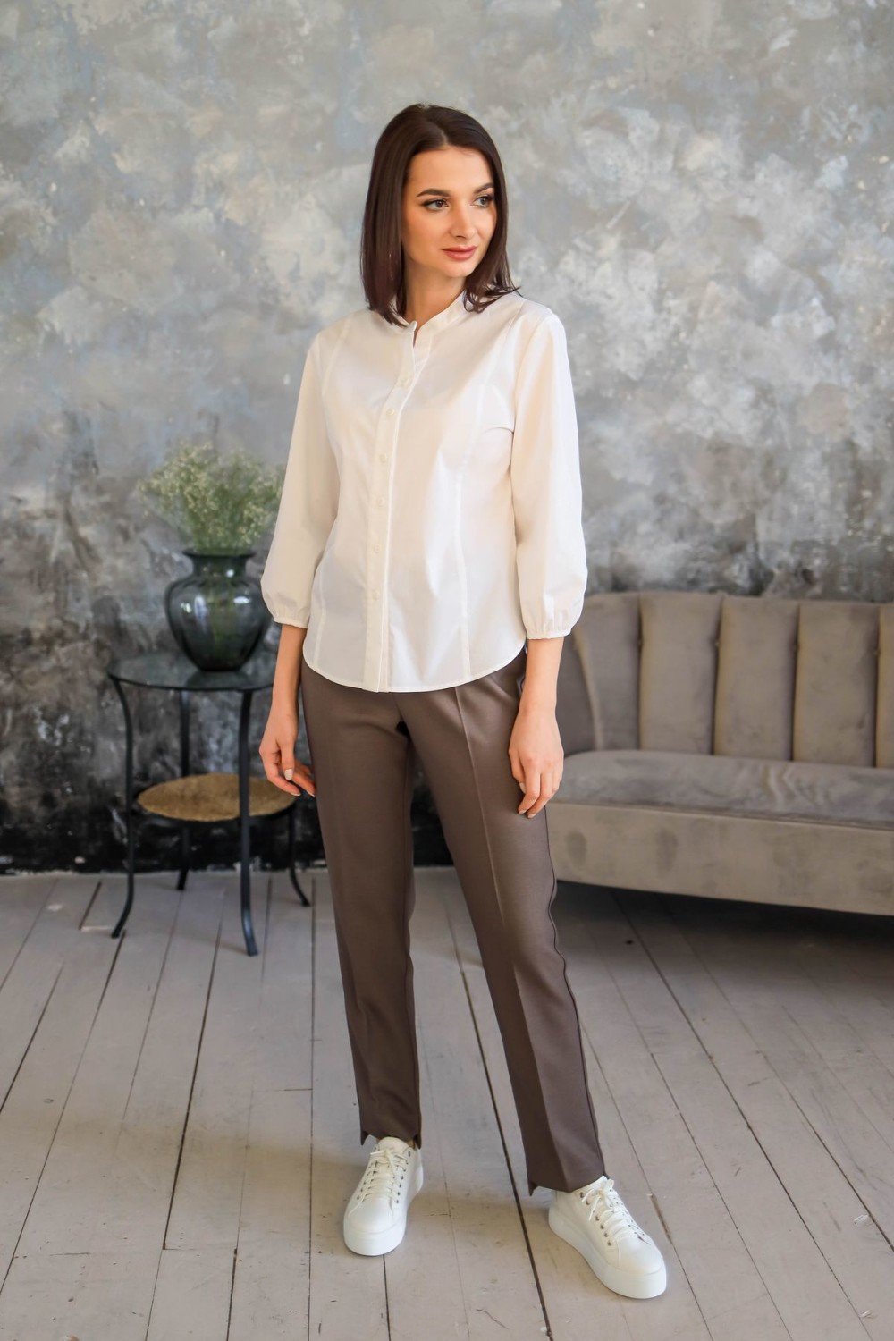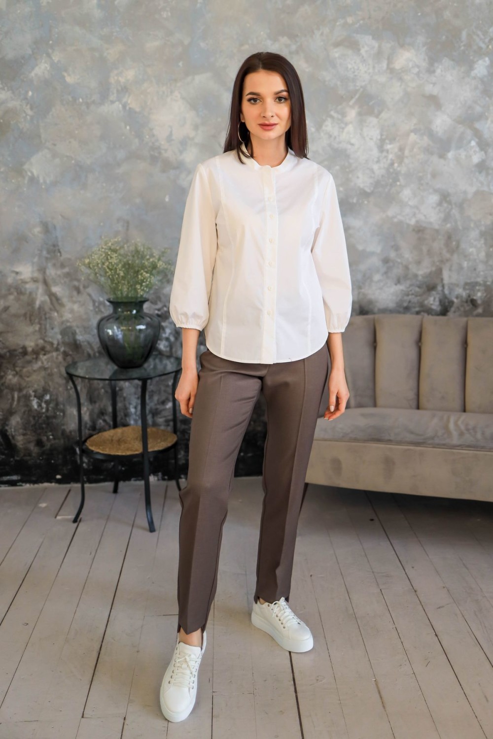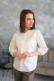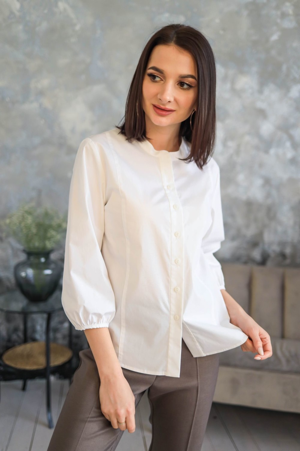 Женственная блузка с растительным принтом на пуговицах. Втачной рукав обработан манжетой. Воротник-стойка, низ изделия закруглен.
