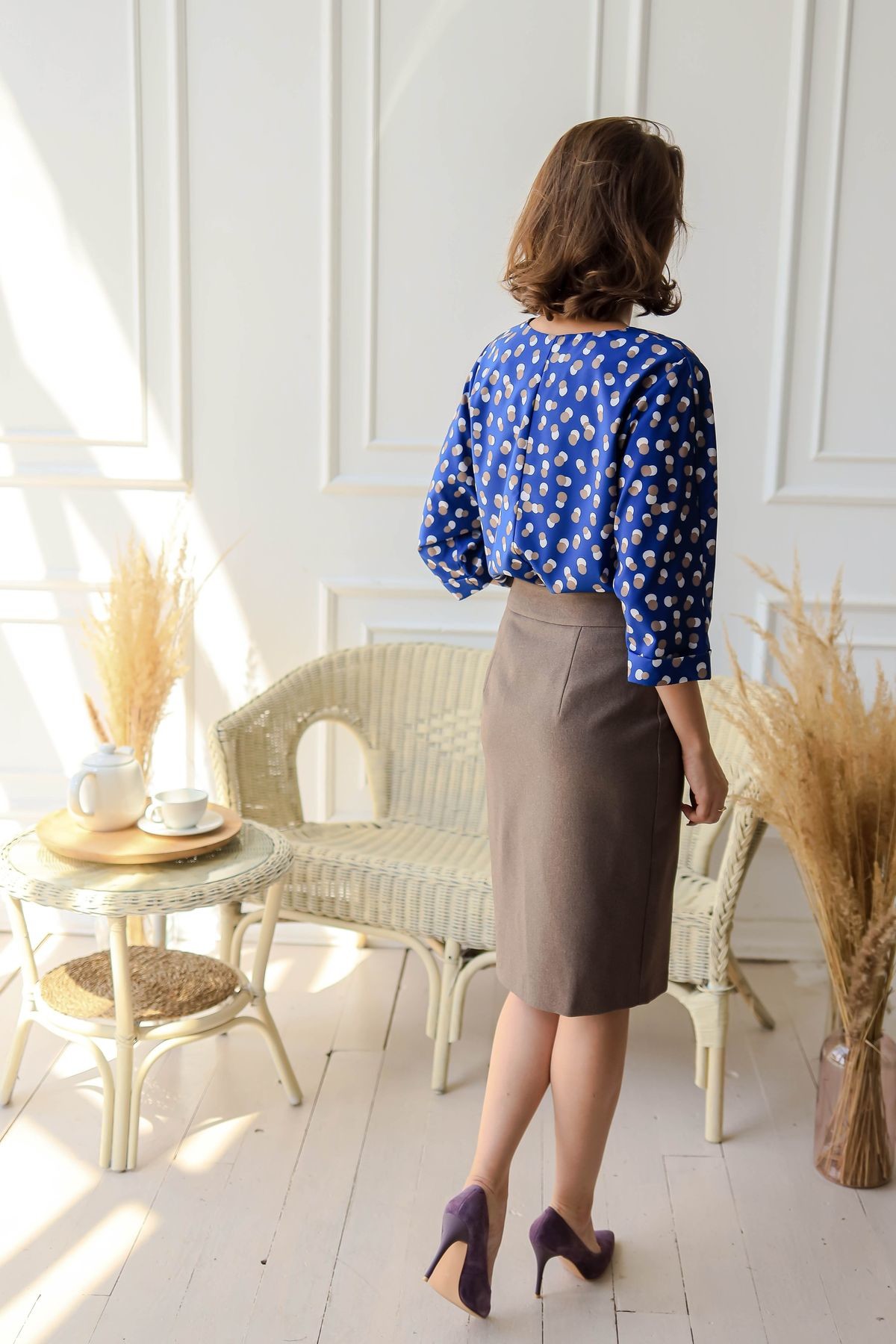 Стильная блузка из шелка-атласа прямого силуэта. Вырез горловины-галочка. Втачной рукав обработан отворотом.