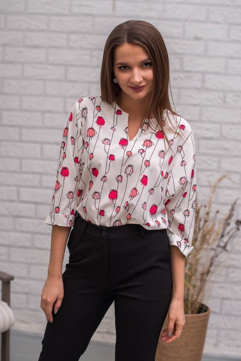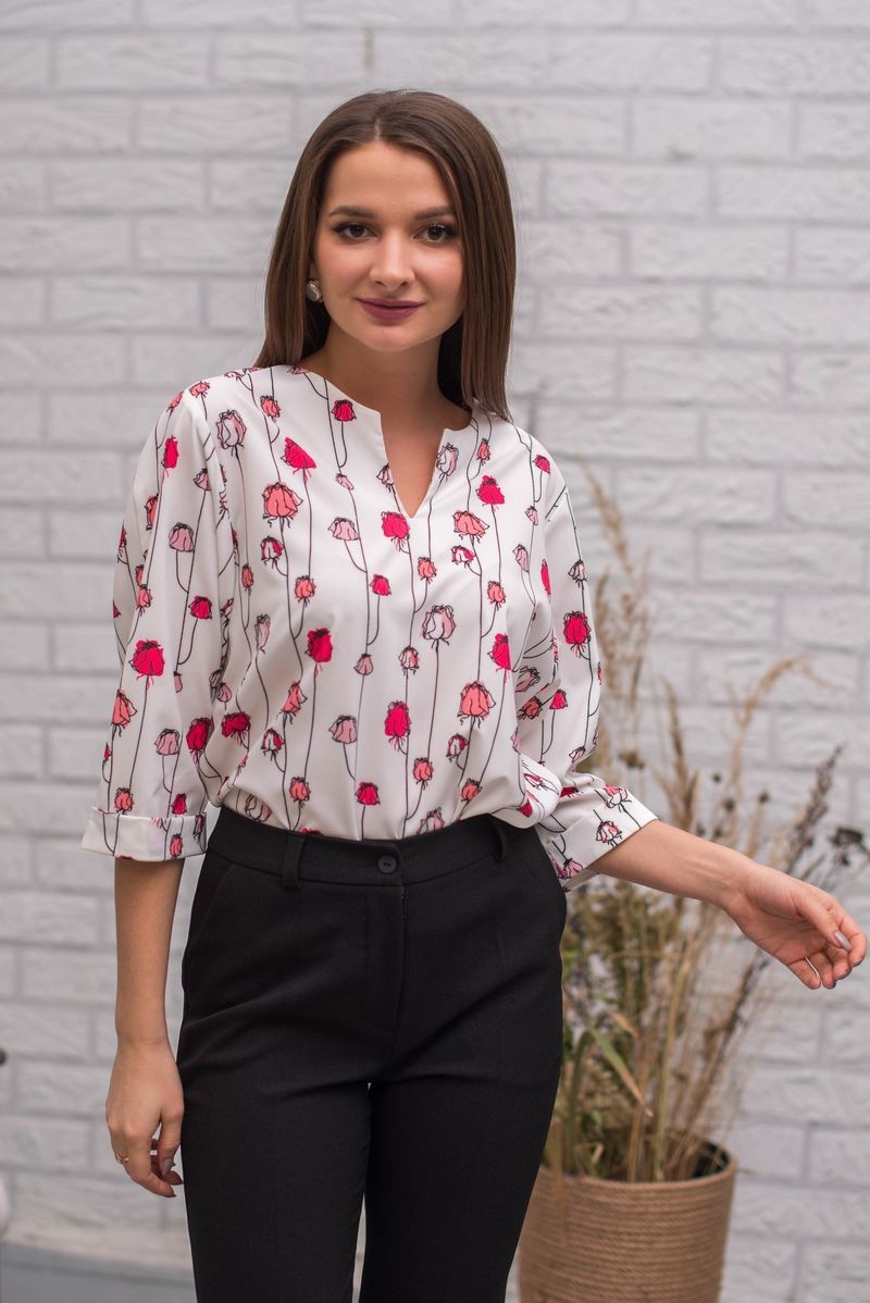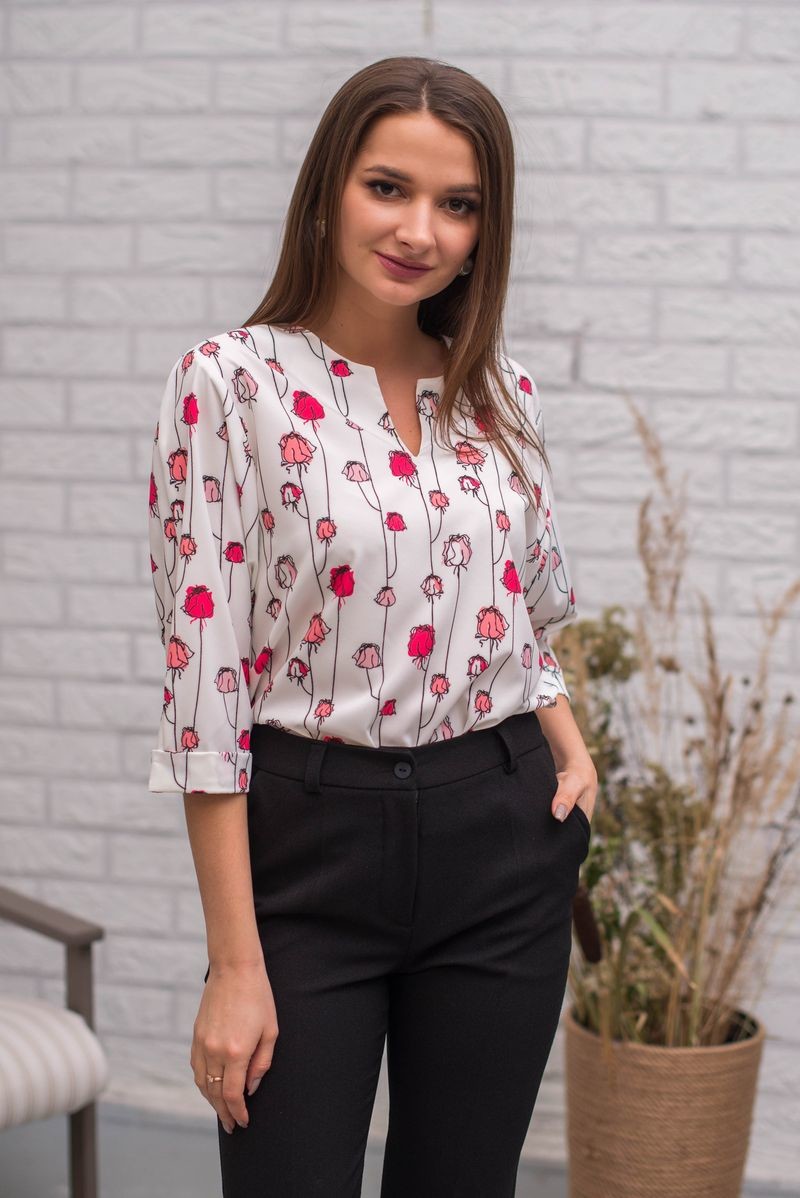 Стильная блузка из шелка-атласа прямого силуэта. Вырез горловины-галочка. Втачной рукав обработан отворотом.