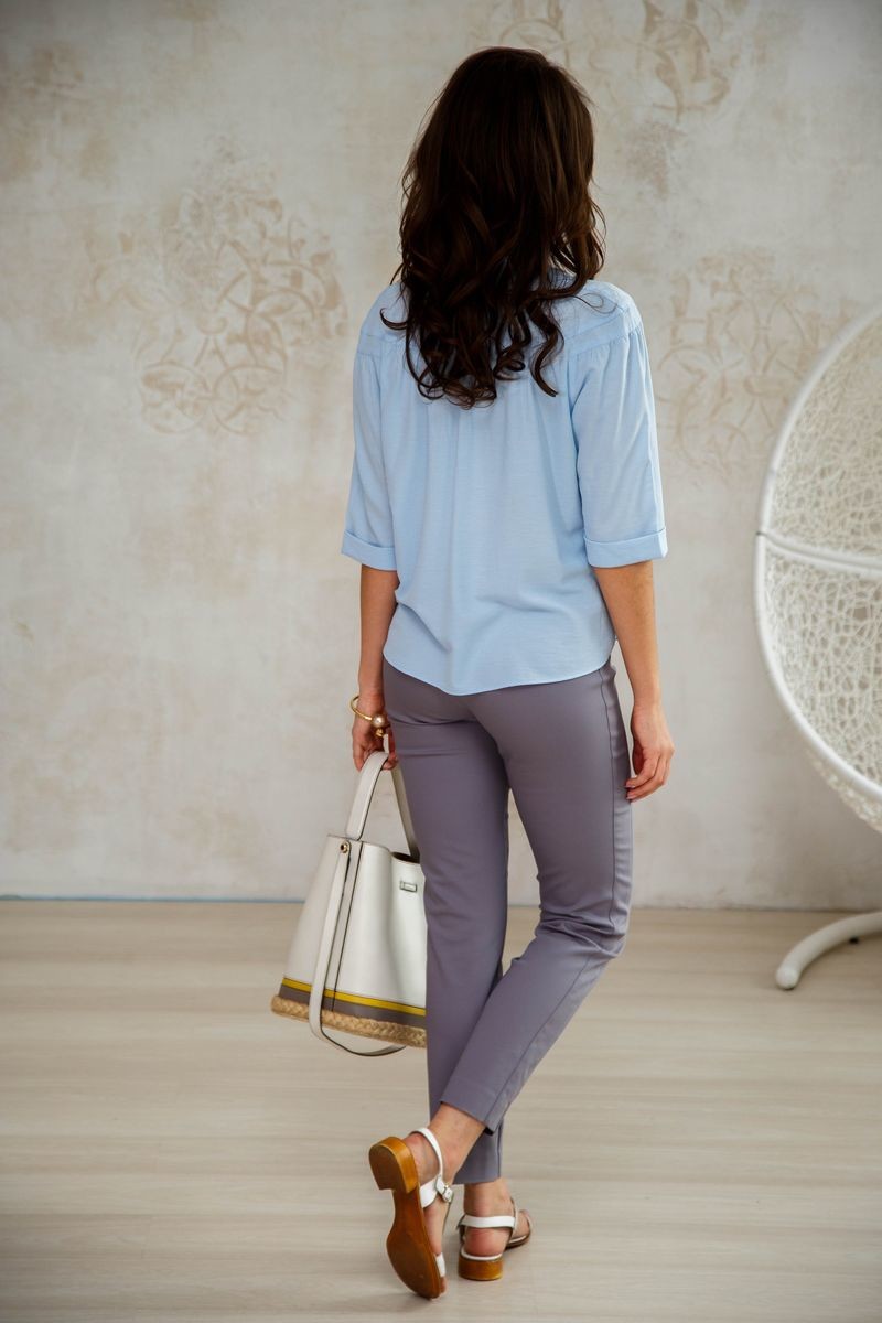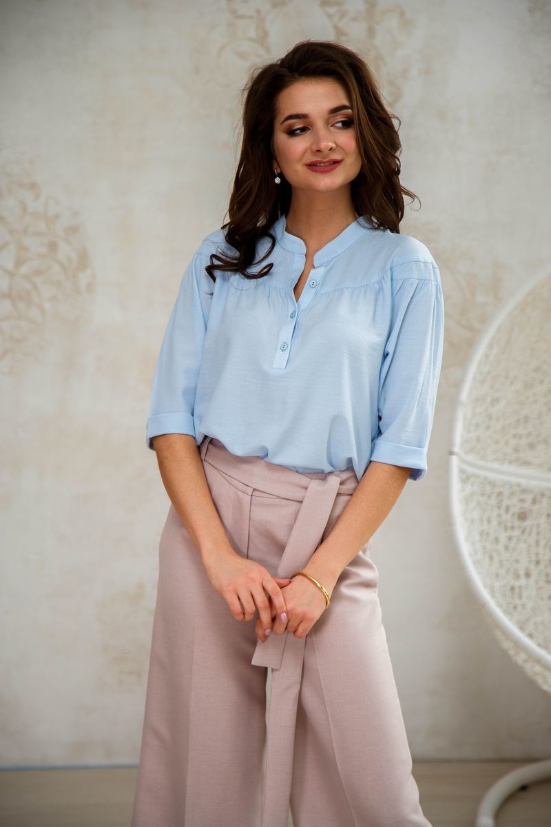 Нежная блузка свободного силуэта. Материал - искусственный шелк с добавлением вискозы. Воротник-стойка, застежка-поло на пуговицы. Блузка на кокетке, от которой заложены небольшие складочки, придающие модели кокетливой пышности. Низ закруглен.