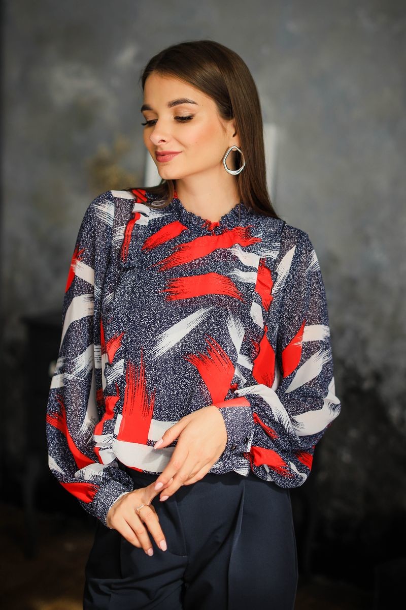Элегантная блузка из шифона. Прямой силуэт. Полочка продублирована вторым слоем и обработана декоративными рюшами. Воротник-стойка, длинный втачной рукав обработан маннжетой.