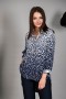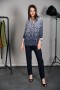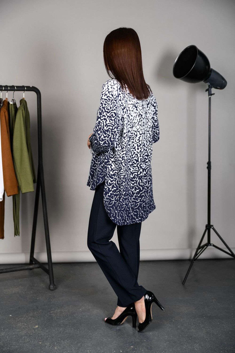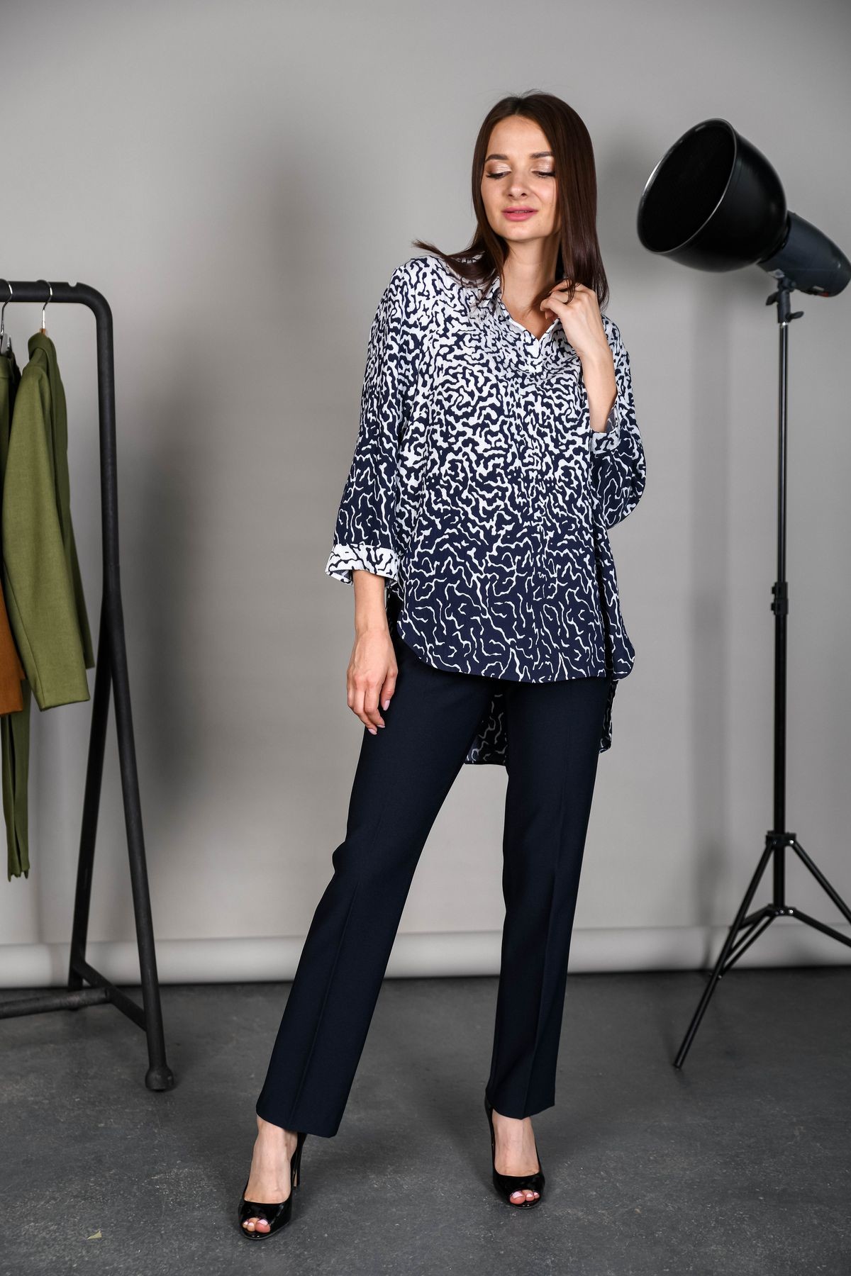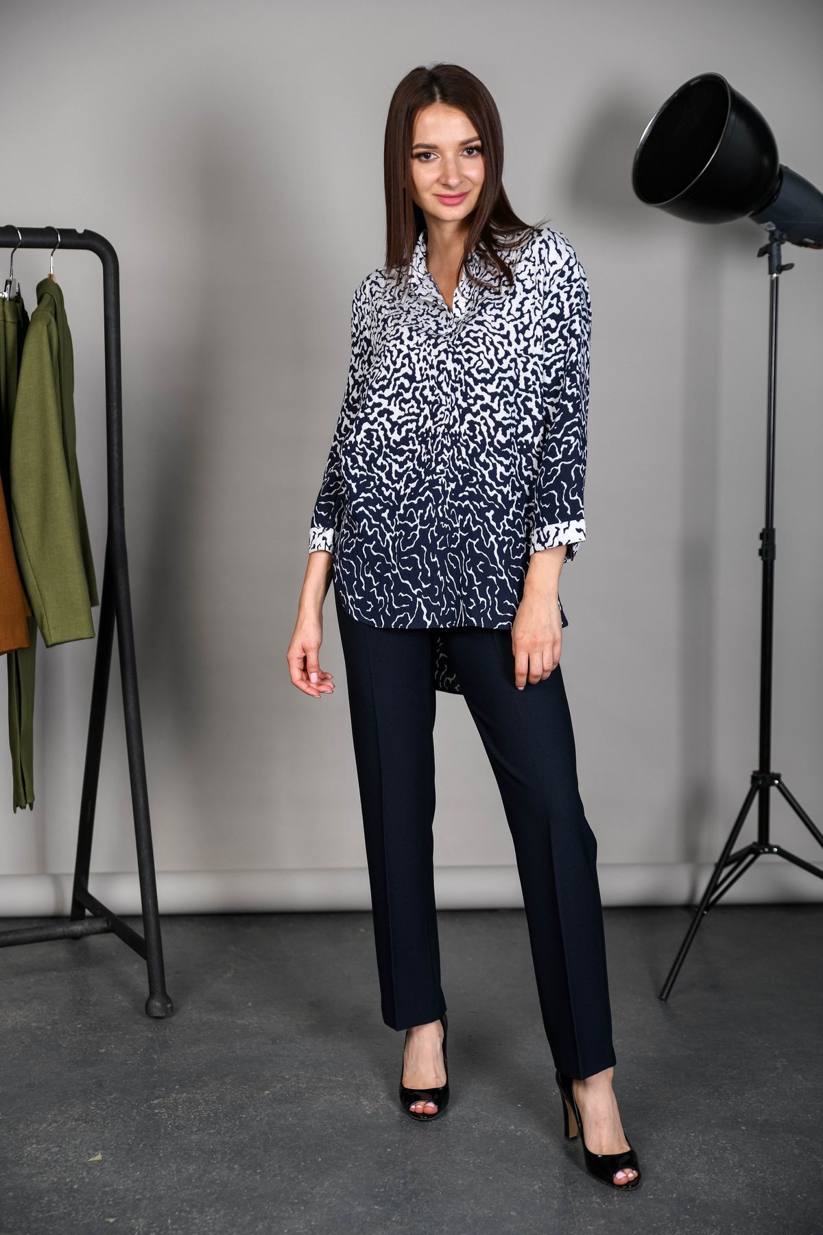 Удлиненная блузка свободного силуэта с перепадом длины (спинка длиннее), переход между задним и передним полотном дополнен закругленным разрезом. Отложной воротник, втачной рукав обработан отворотом. Оригинальный принт делает эту блузку особенно эффектной, подчеркивая элегантный вкус своей обладательницы.