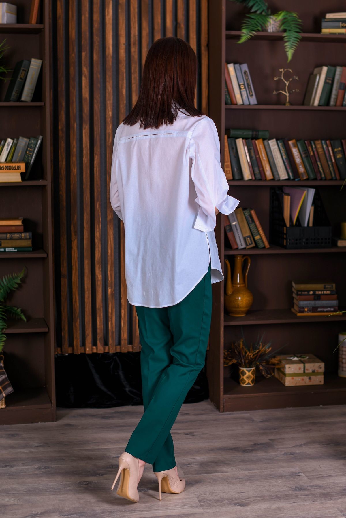 Стильная удлиненная рубашка из хлопка. Свободный силуэт. В боковых швах разрезы. Отложной воротник, рукав длиной 3/4 обработан манжетой, есть выточки. Супатная застежка на пуговицы. Спинка с отрезной кокеткой, по шву которой расположены декоративные прорези (см. детальное фото). Модель смотрится очень интересно и эффектно!