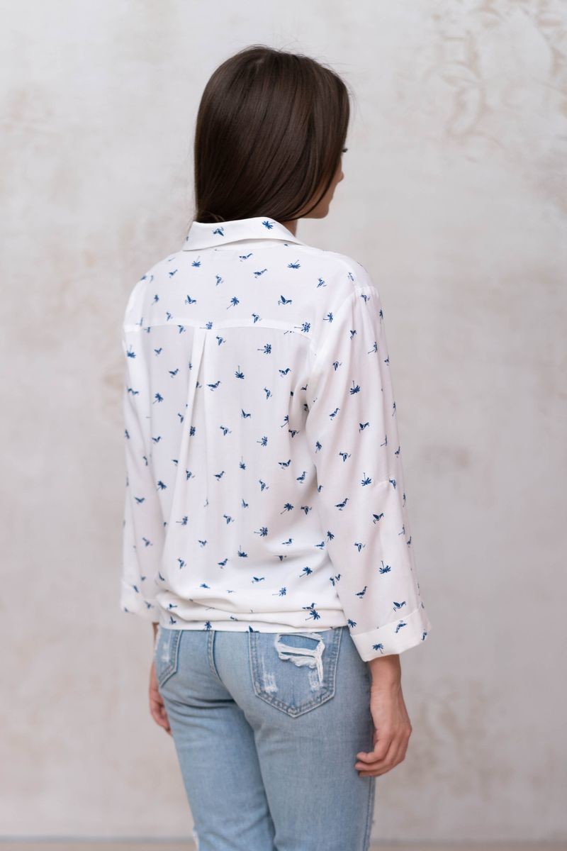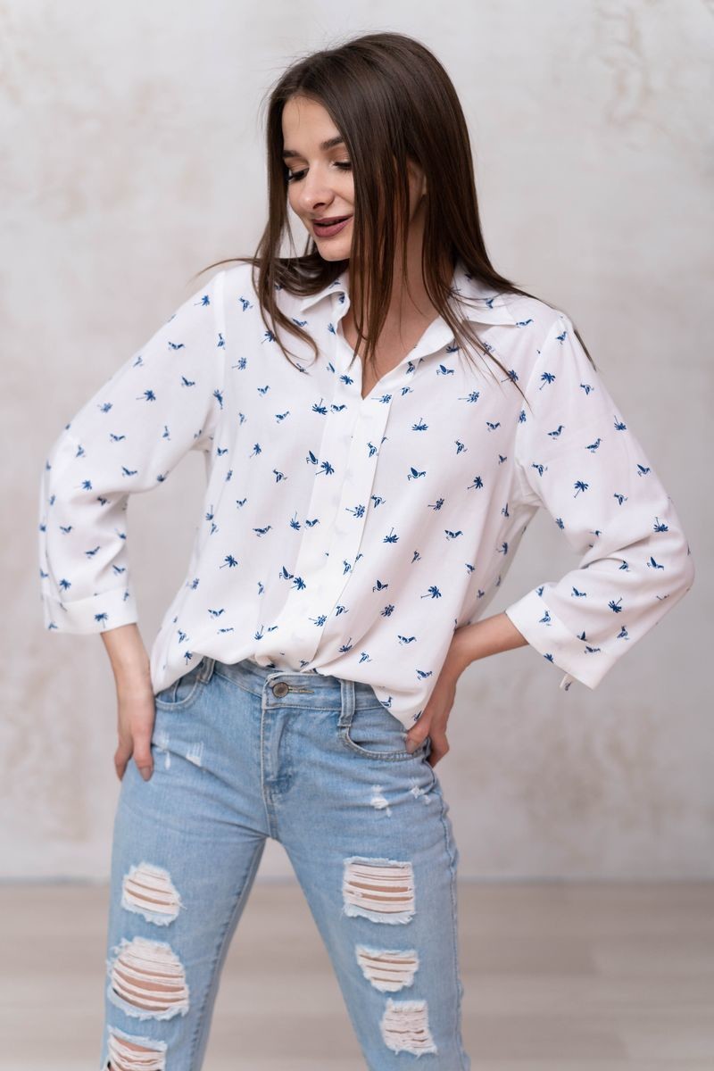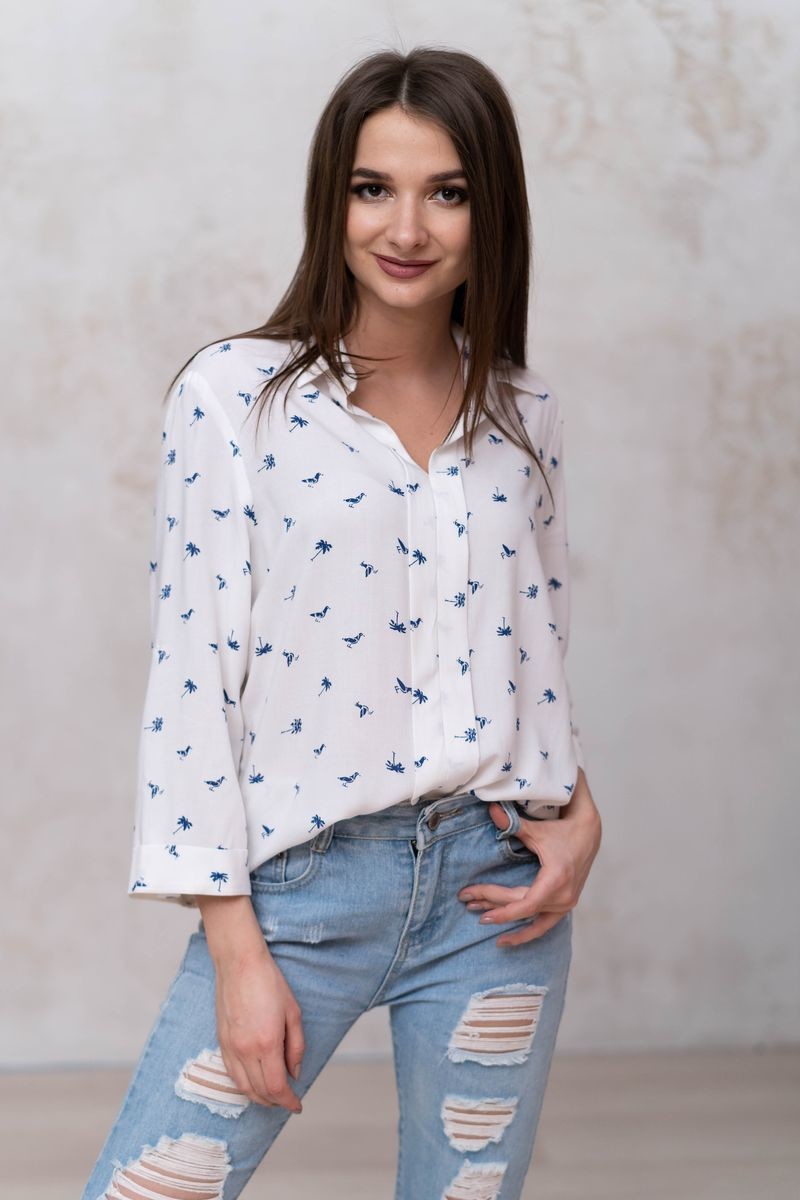 Стильная блузка прямого силуэта. Втачной рукав с регулировкой на пату. Отложной воротник, вырез горловины-галочка, переходящий в декоративную планку.