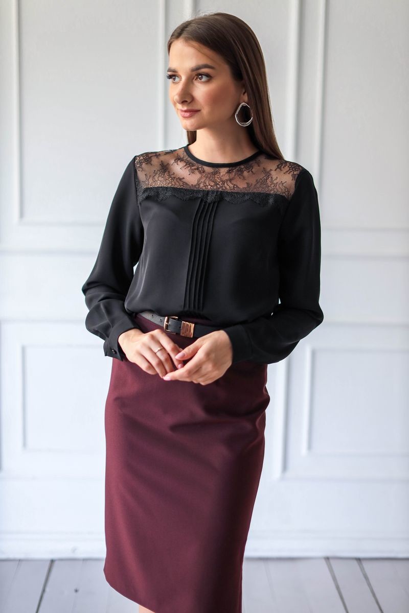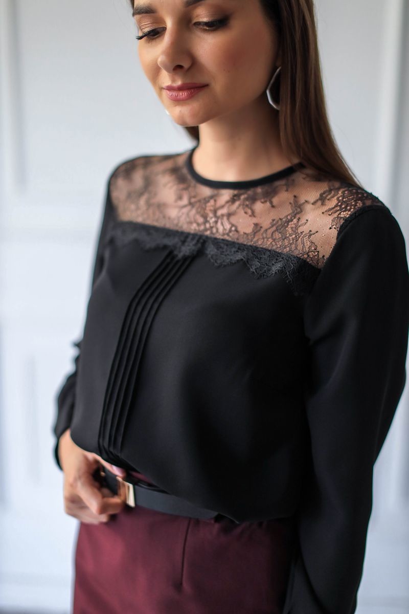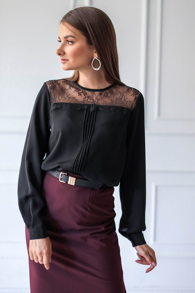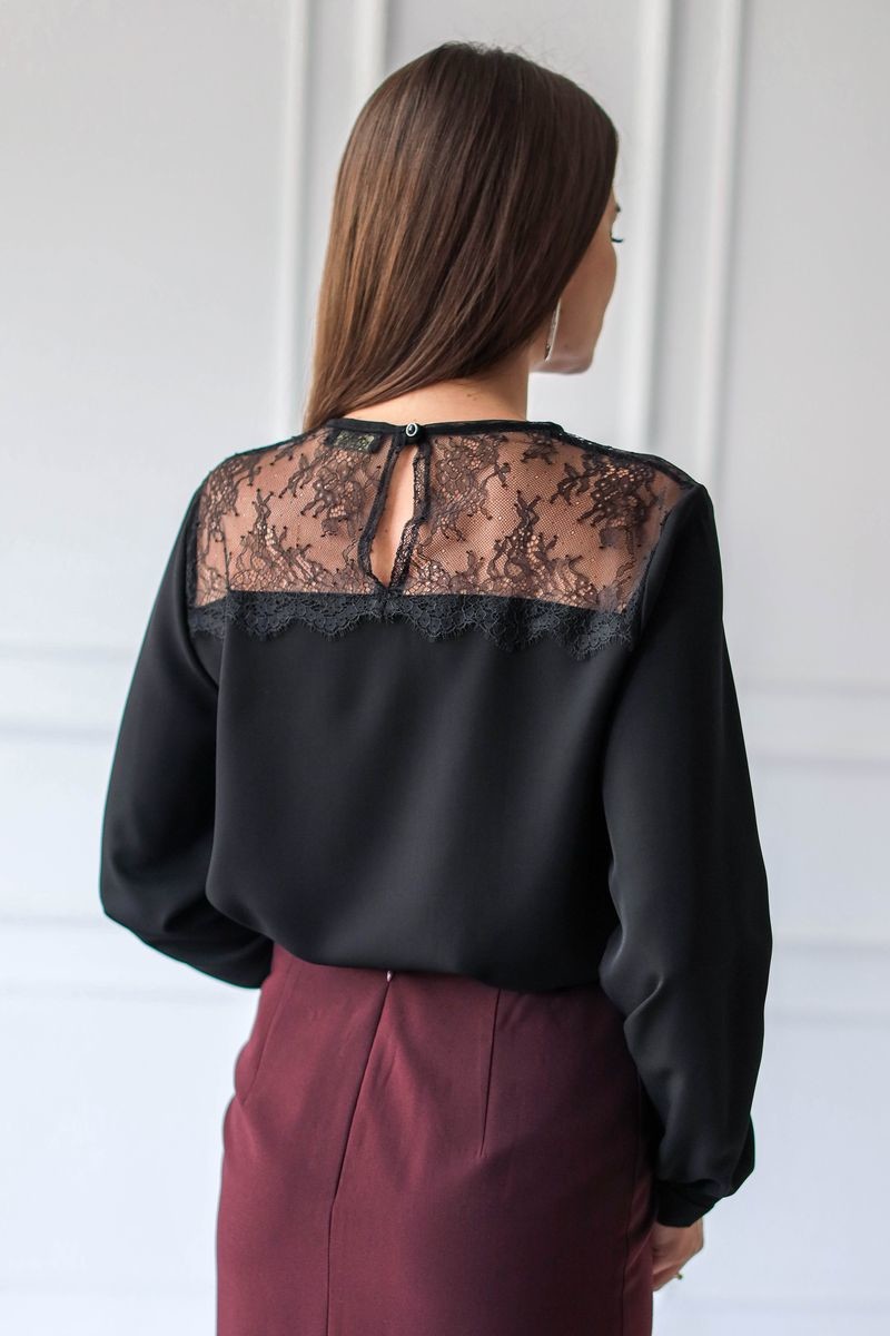 Элегантная блузка с кружевной кокеткой. Длинный втачной рукав обработан манжетой, спереди декоративная планка. Застежка на пуговицу на спинке.