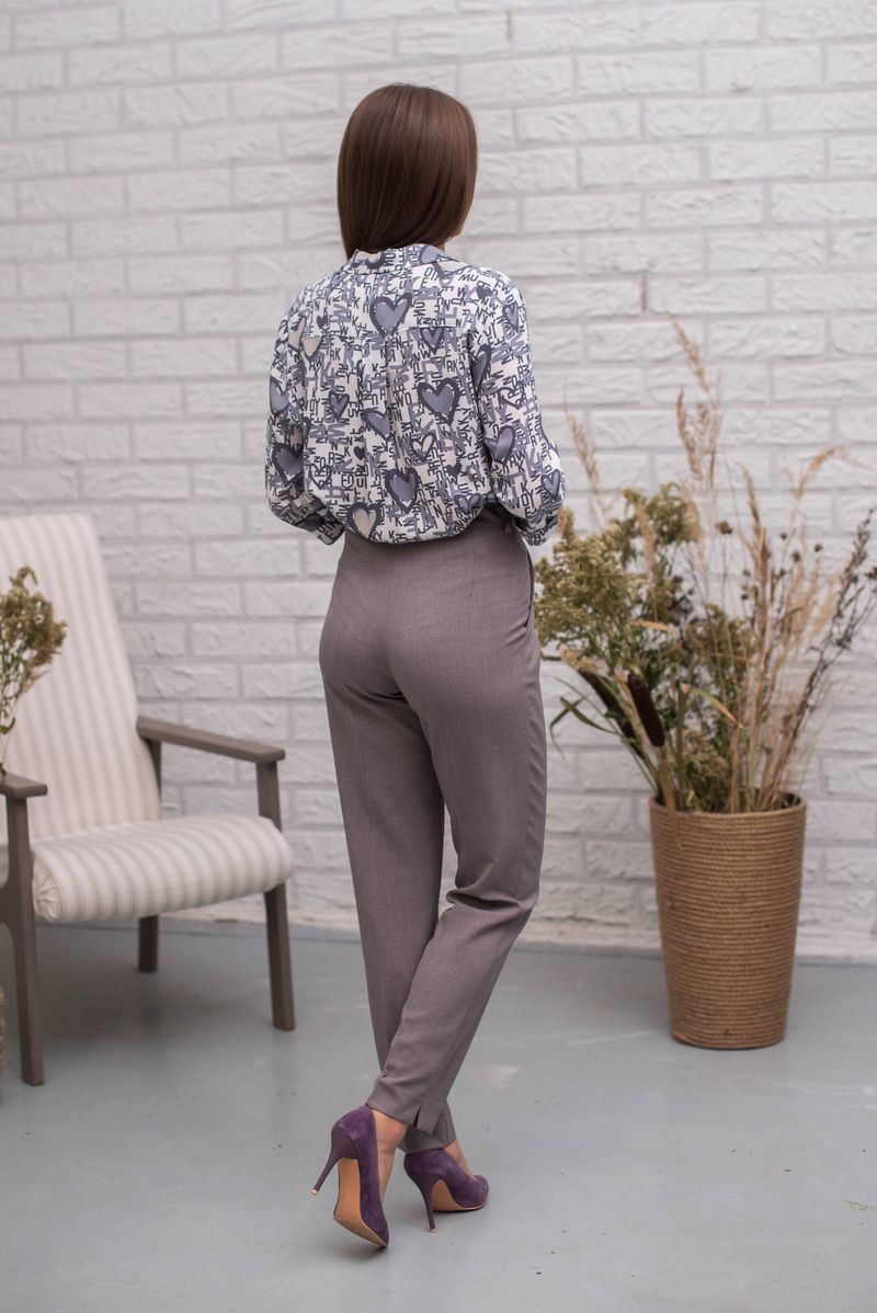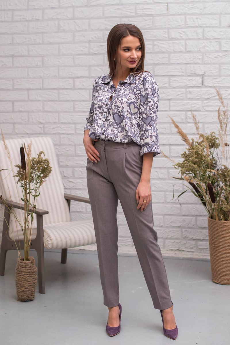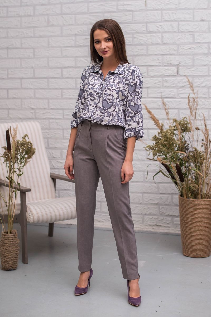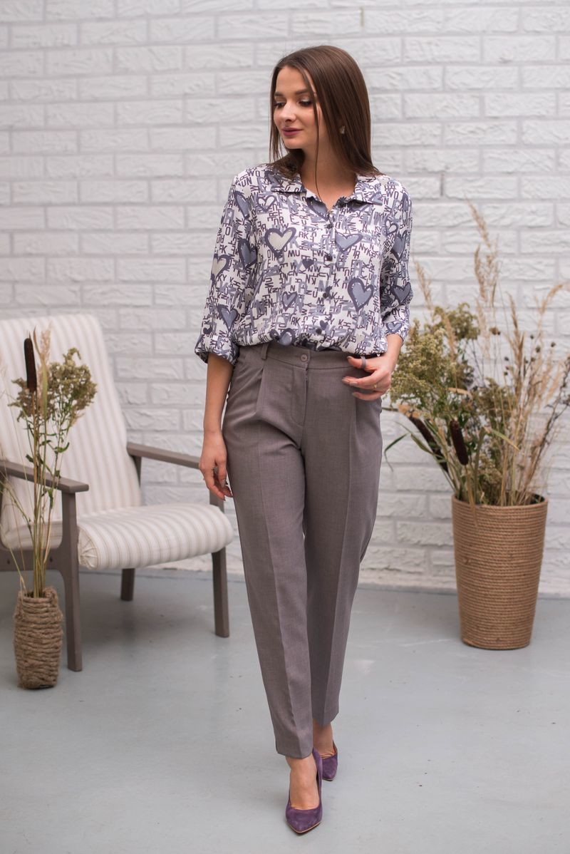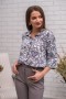 Блузка свободного прямого силуэта. Отложной воротник. Застежка на пуговицы. Втачной рукав длиной 3/4 обработан отворотом. Низ модели закруглен.