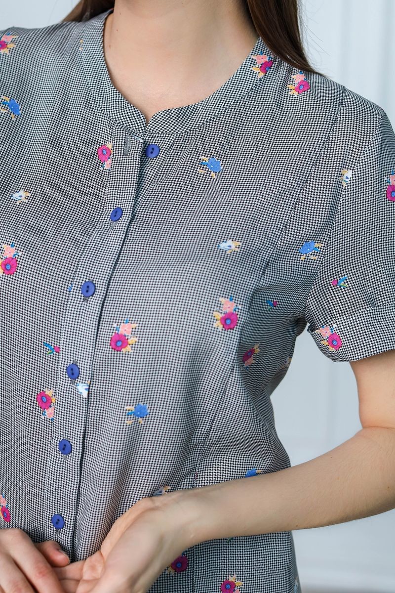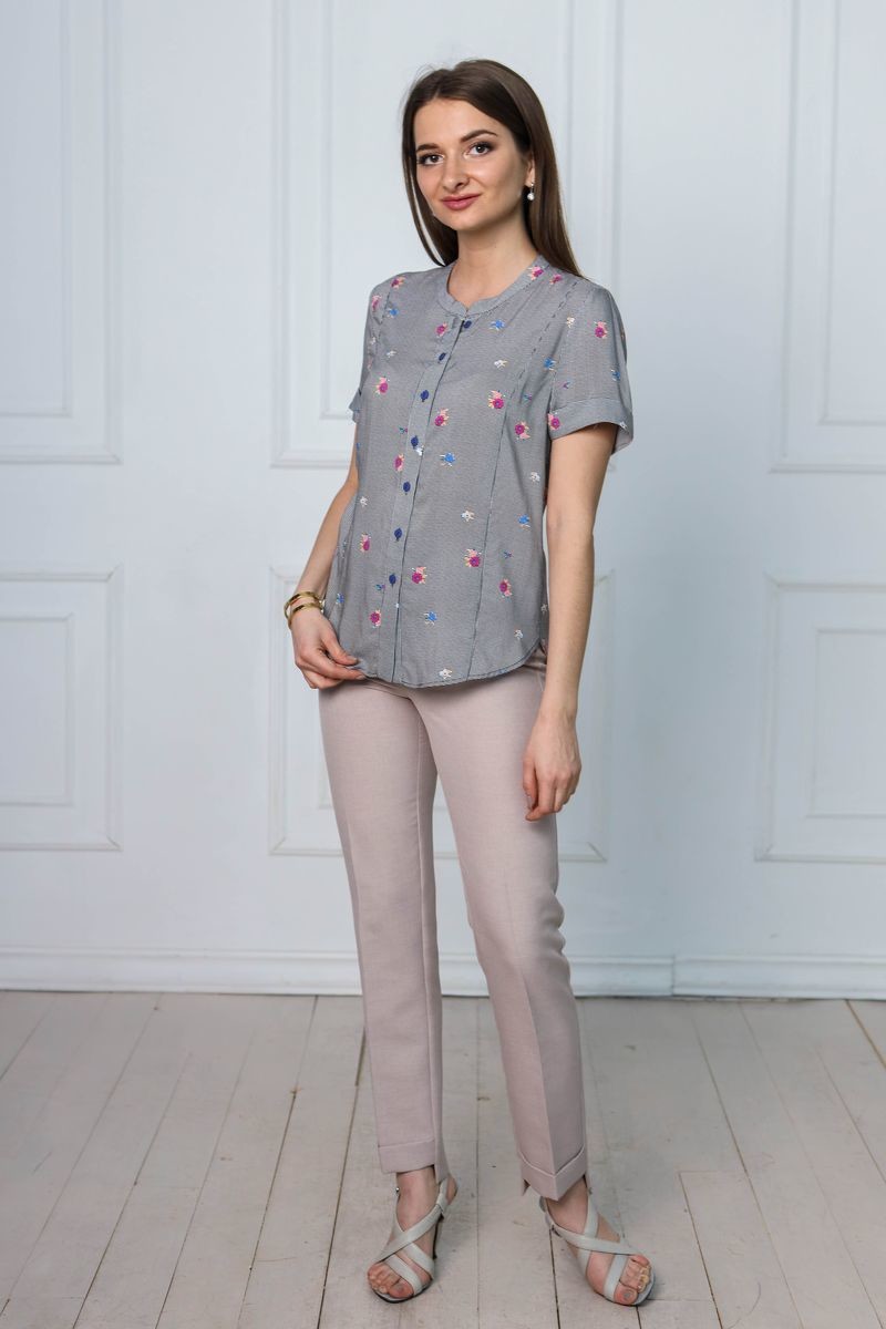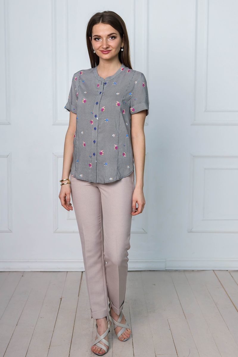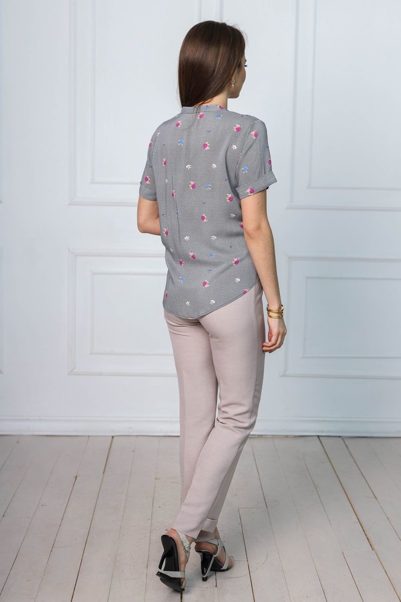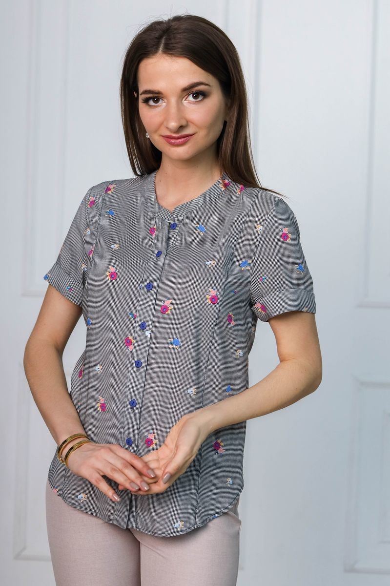 Блузка из смесовой ткани с принтом. Блузка на пуговицах с коротким рукавом. Воротник-стойка, втачной рукав обработан отворотом. Низ модели закруглен.