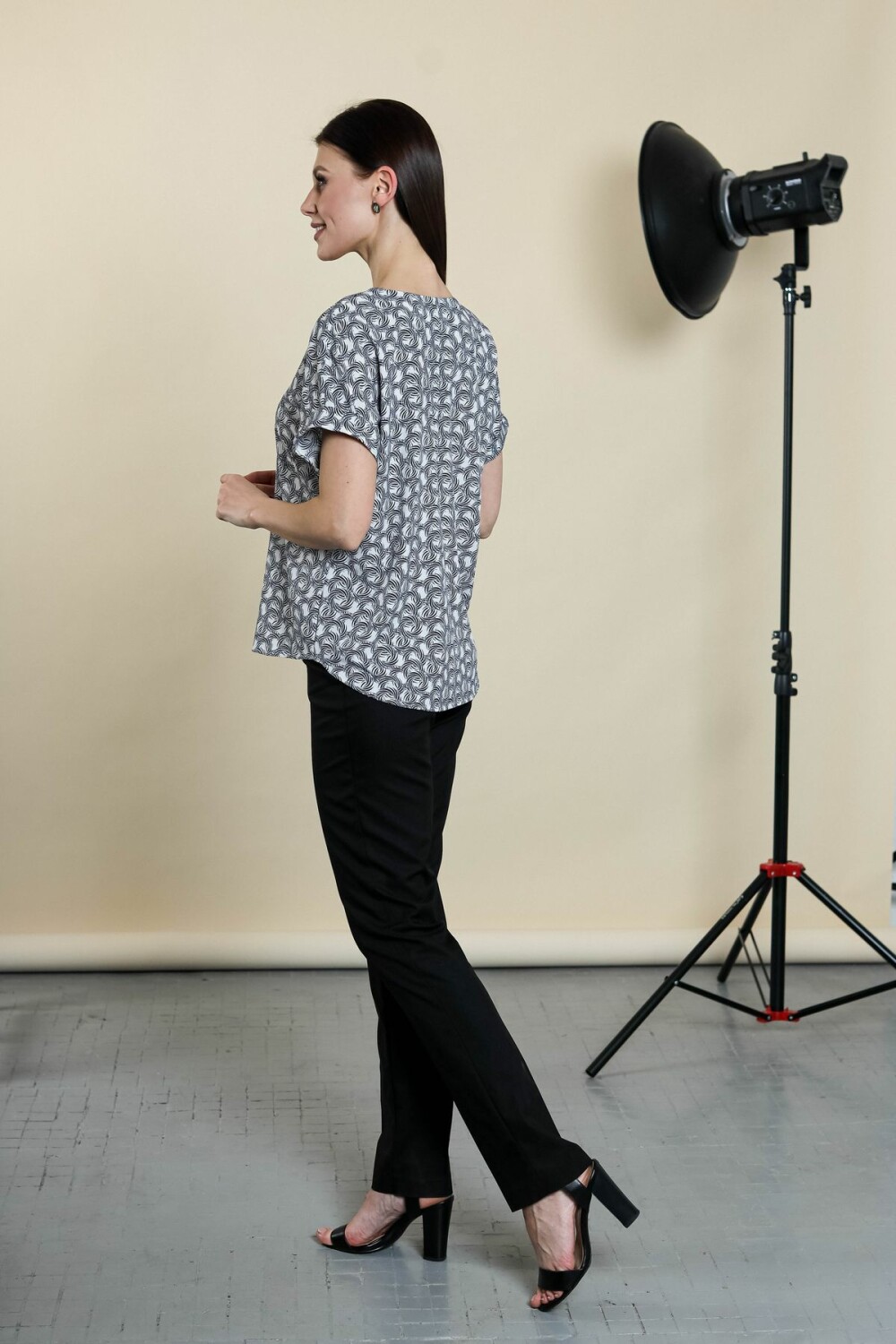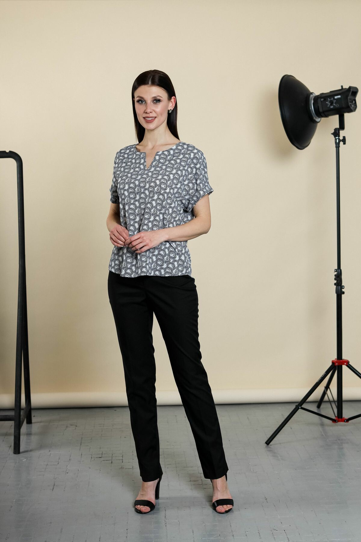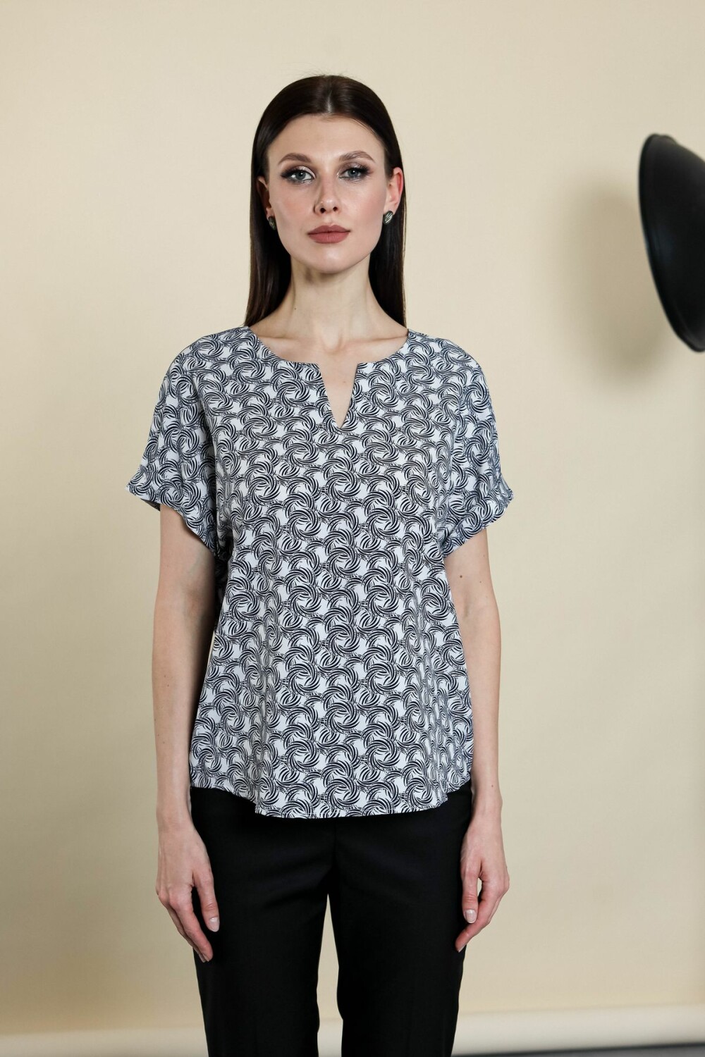 Блузка прямого силуэта. Цельнокроенный короткий рукав обработан отворотом. Вырез горловины - галочка.