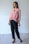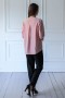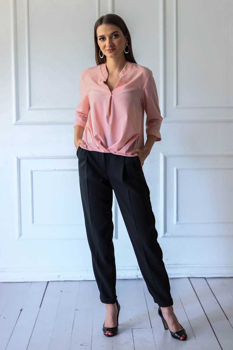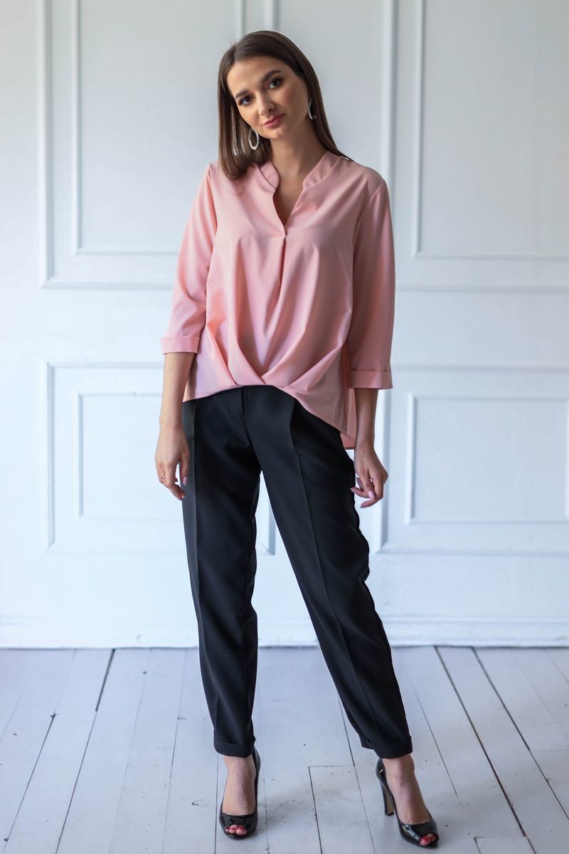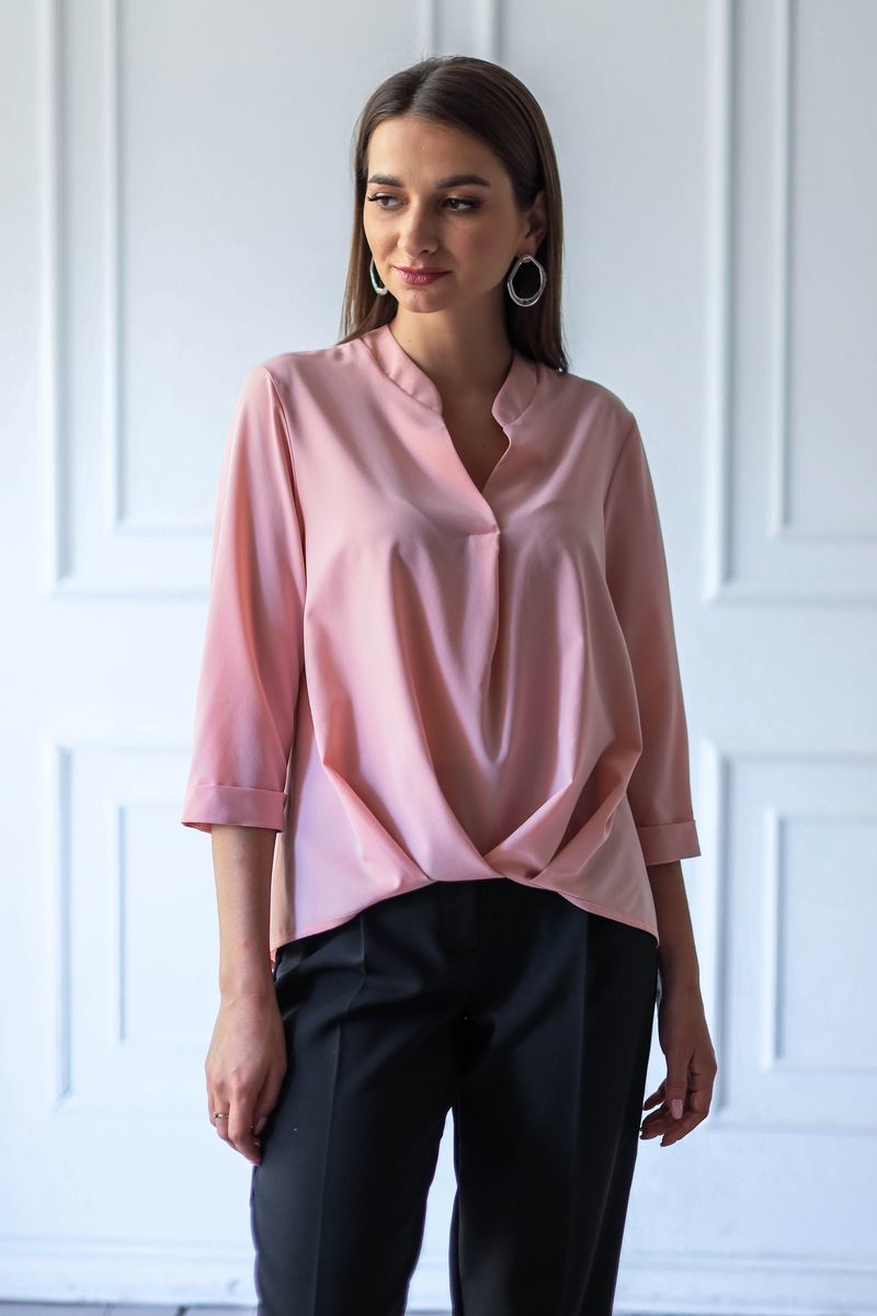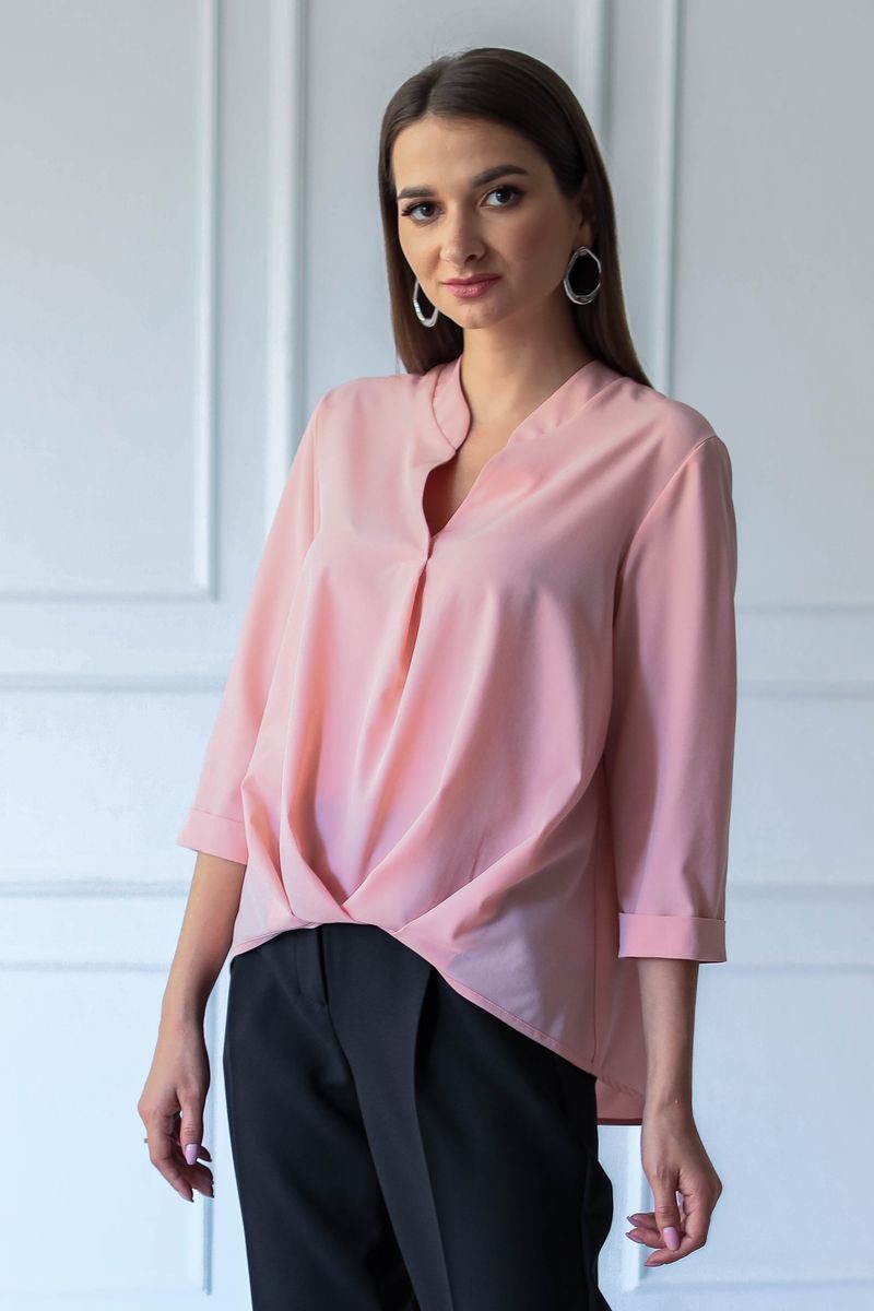 Блузка свободного силуэта с перепадом длины. Воротник-стойка, переходящий в изящный вырез-галочку. Втачной рукав. Передняя половинка собрана во встречные складки по низу, создавая элегантный эффект драпировки.