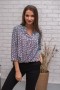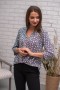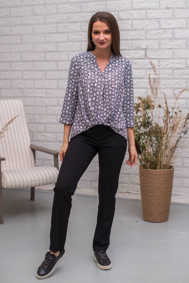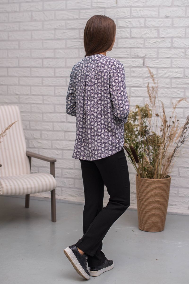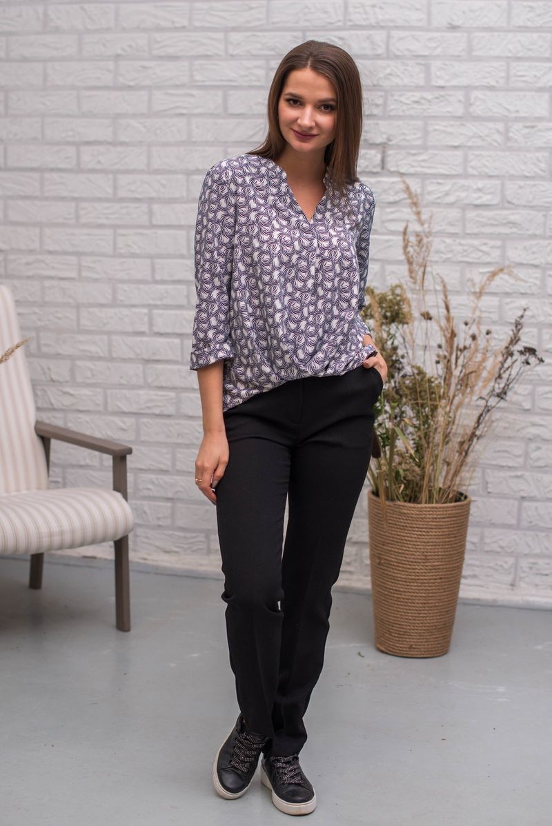 Блузка свободного силуэта с перепадом длины. Воротник-стойка, переходящий в изящный вырез-галочку. Втачной рукав. Передняя половинка собрана во встречные складки по низу, создавая элегантный эффект драпировки.