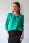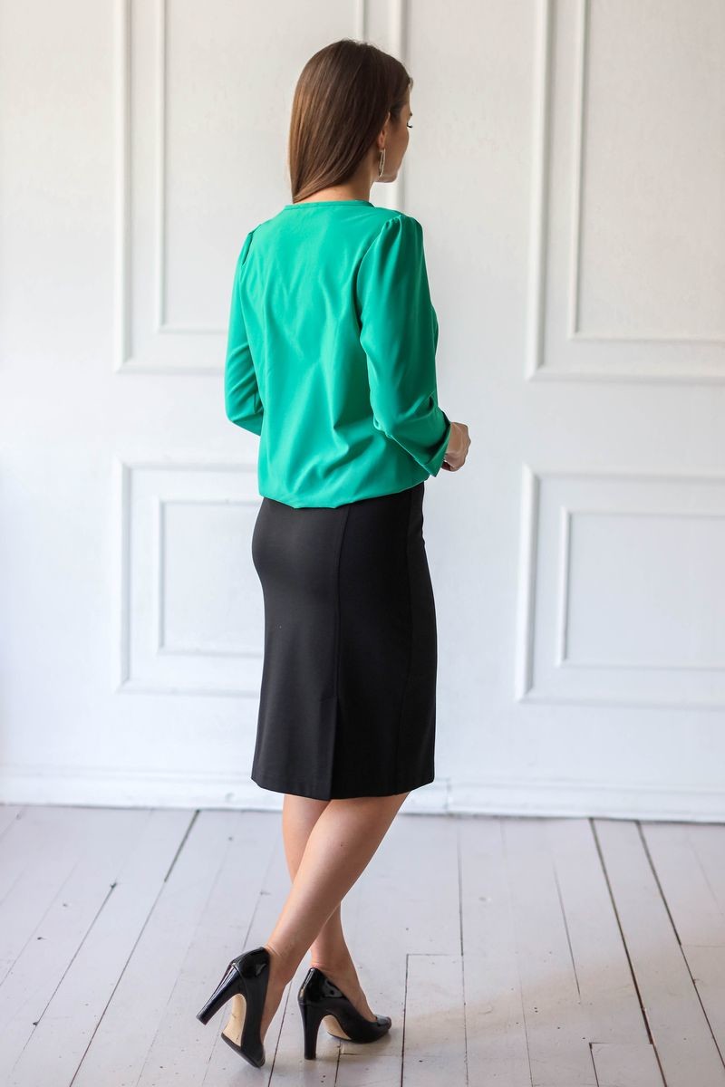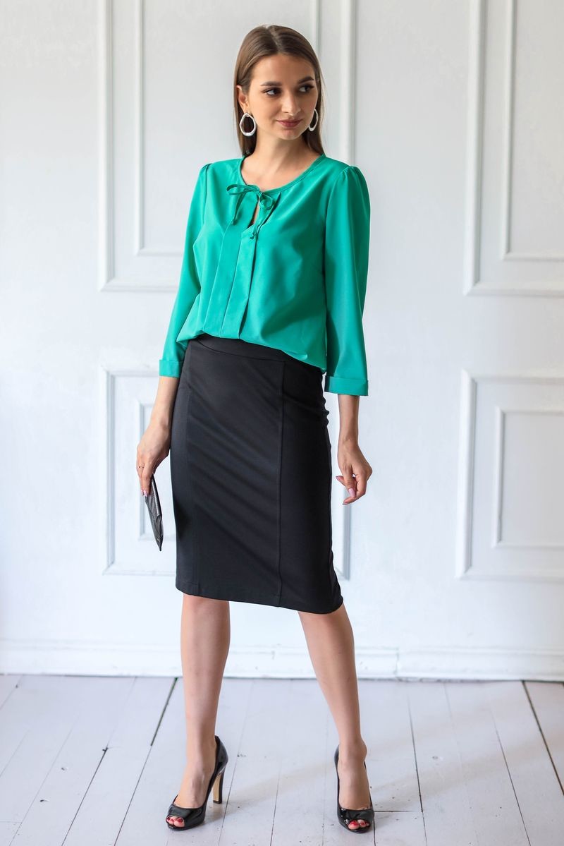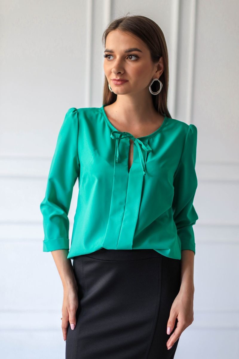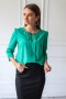 Нежная блузка прямого силуэта. Округлый вырез горловины, вырез-галочка с лентами из основного полотна, переходящим в декоративную планку. Втачной рукав чуть присобран по шву, них рукавов обработан отворотами.