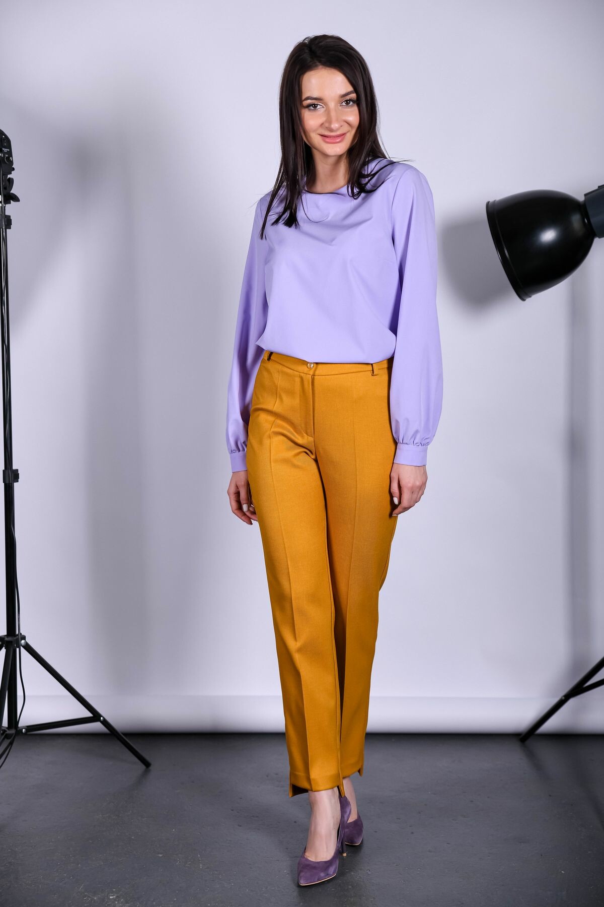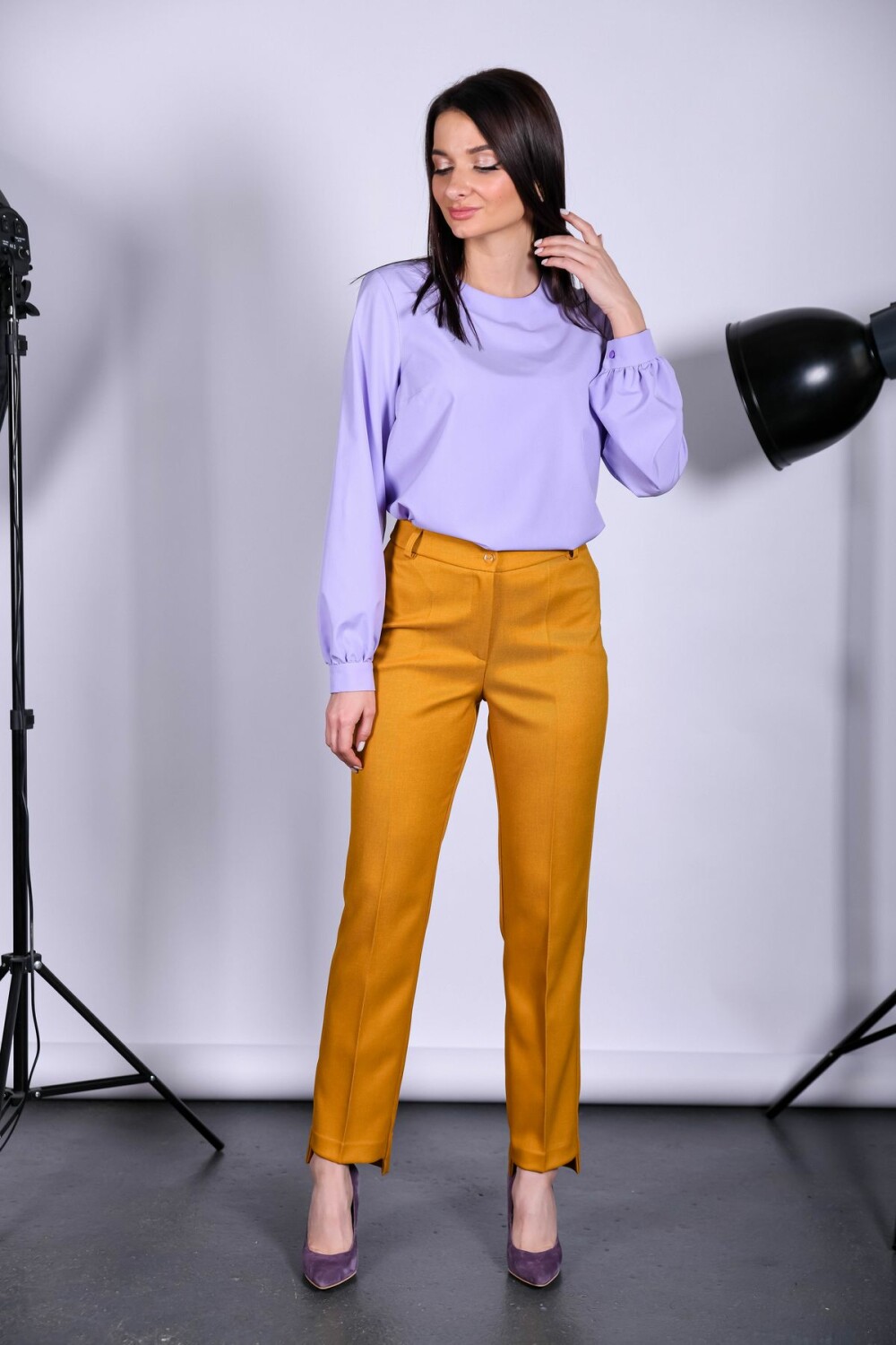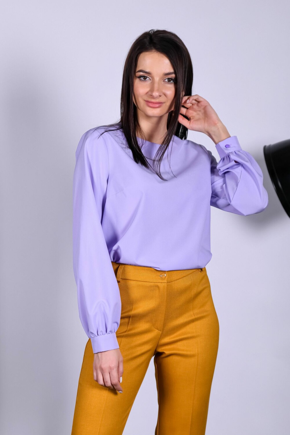 Элегантная шелковая блузка прямого силуэта. Пышный втачной рукав обработан манжетой. Сзади застежка на петлю и пуговицу.
