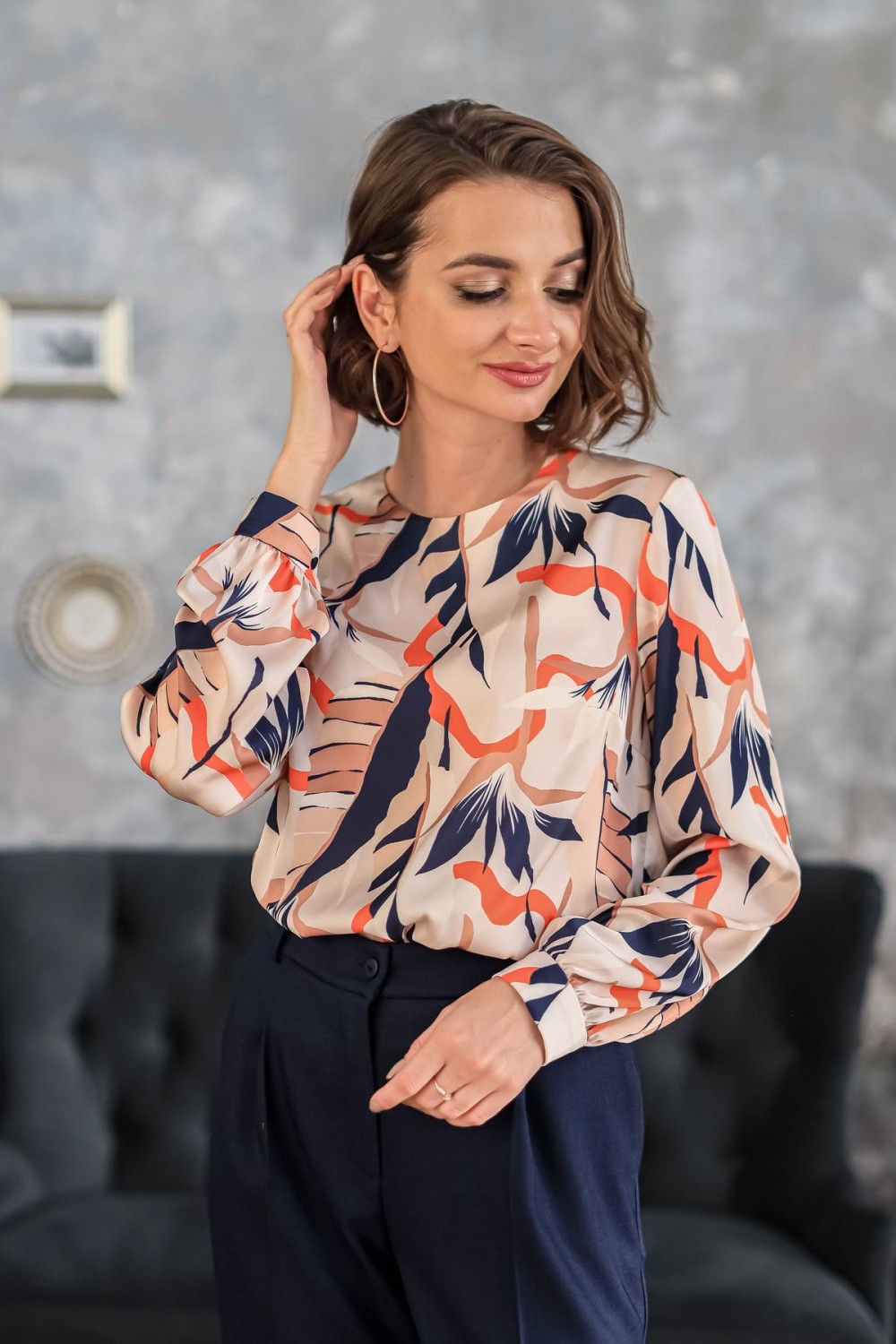 Элегантная шелковая блузка прямого силуэта. Пышный втачной рукав обработан манжетой. Сзади застежка на петлю и пуговицу.