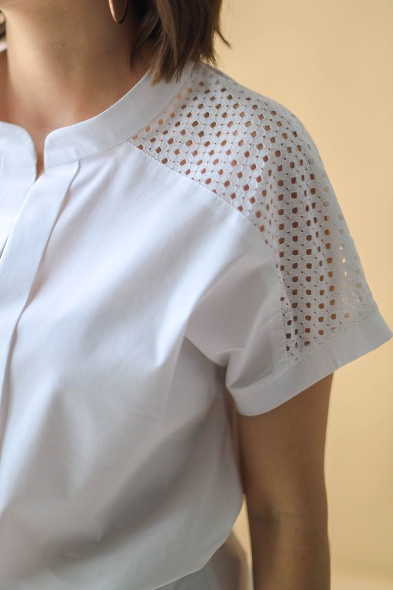 Блузка прямого силуэта. Цельнокроенный рукав обработан манжетой. Воротник-стойка, переходящий в элегантную галочку. Модель дополнена кружевом в тон.