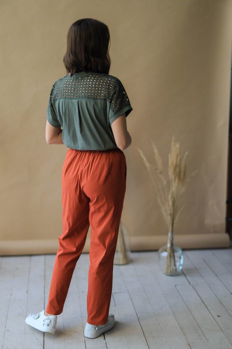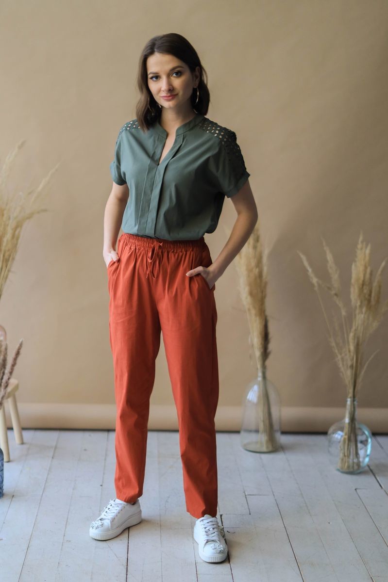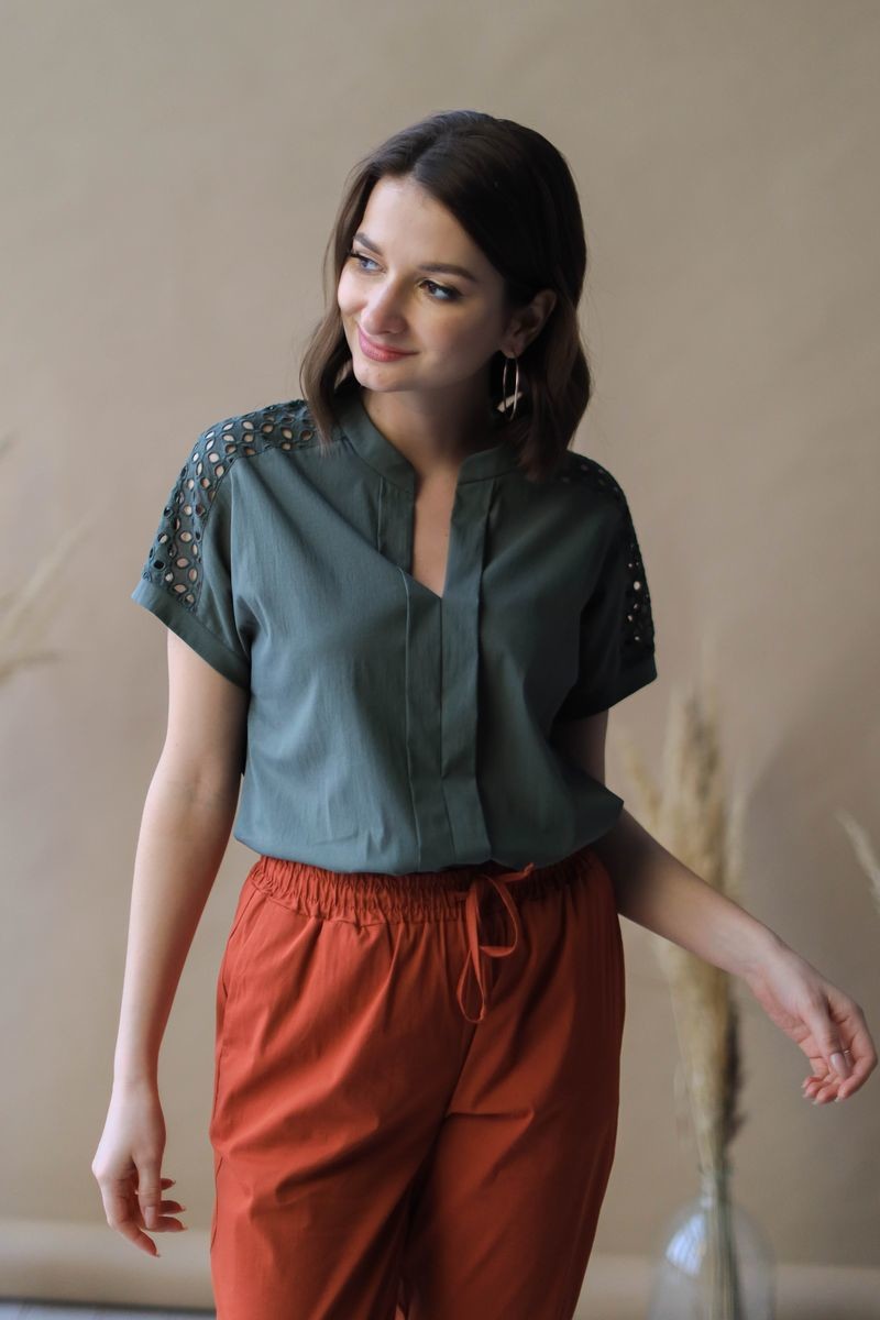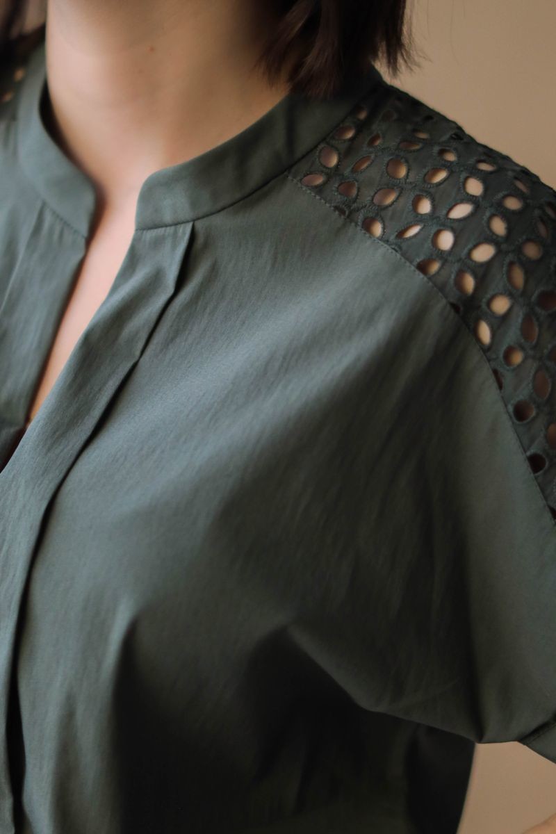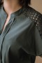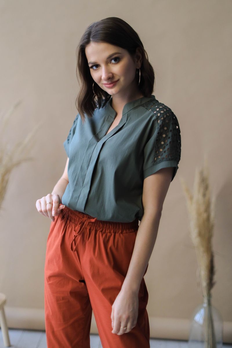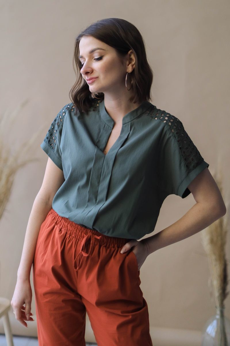 Блузка прямого силуэта. Цельнокроенный рукав обработан манжетой. Воротник-стойка, переходящий в элегантную галочку. Модель дополнена кружевом в тон.