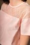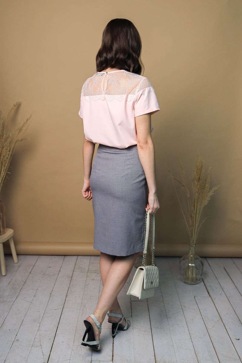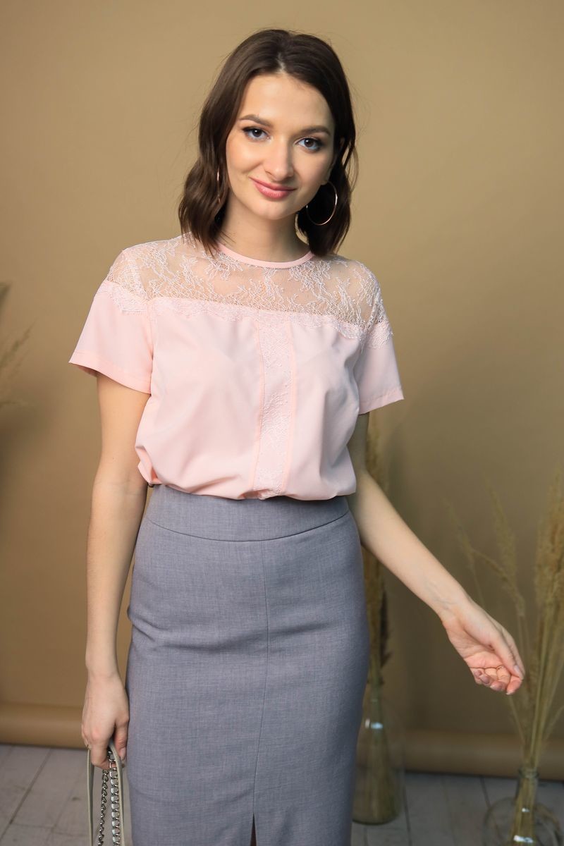 Блузка из иск. шелка прямого силуэта. Есть нагрудные вытачки. Кокетка изделия выполнена из изящного кружева. Сзади застежка на петлю и пуговку.