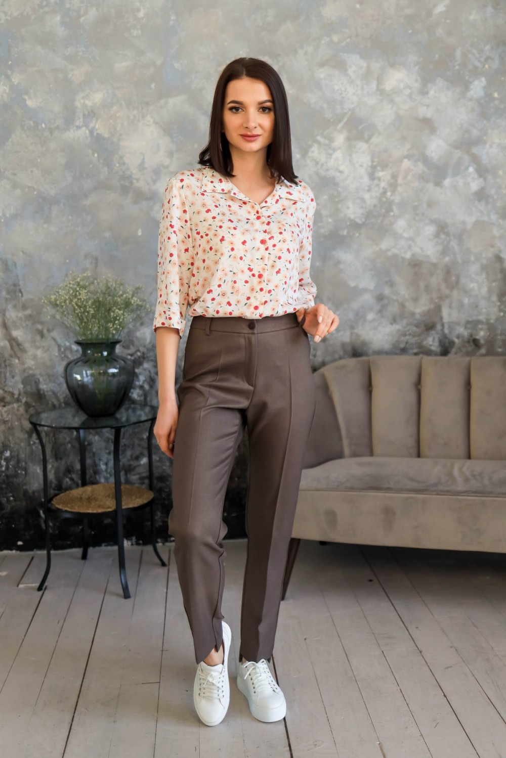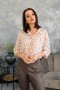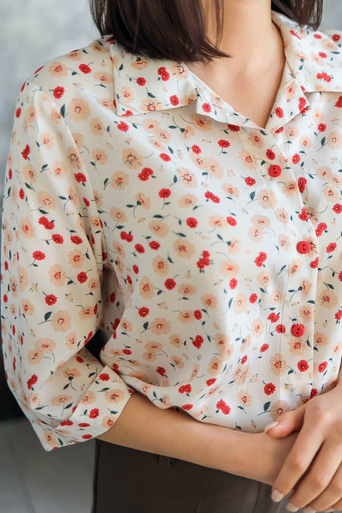 Блузка из штапеля с цветочным принтом. Свободный прямой силуэт, застежка на пуговицы, втачной рукав длиной 3/4. Низ модели закруглен.