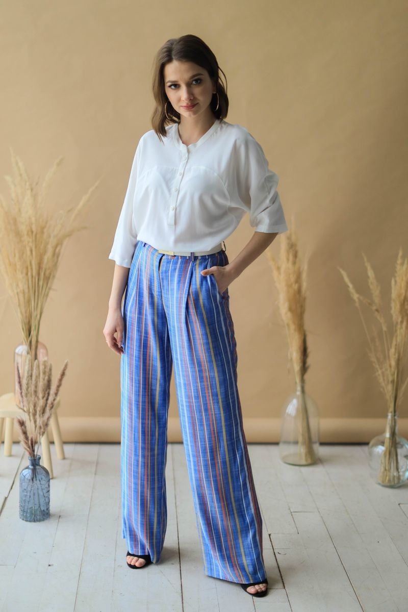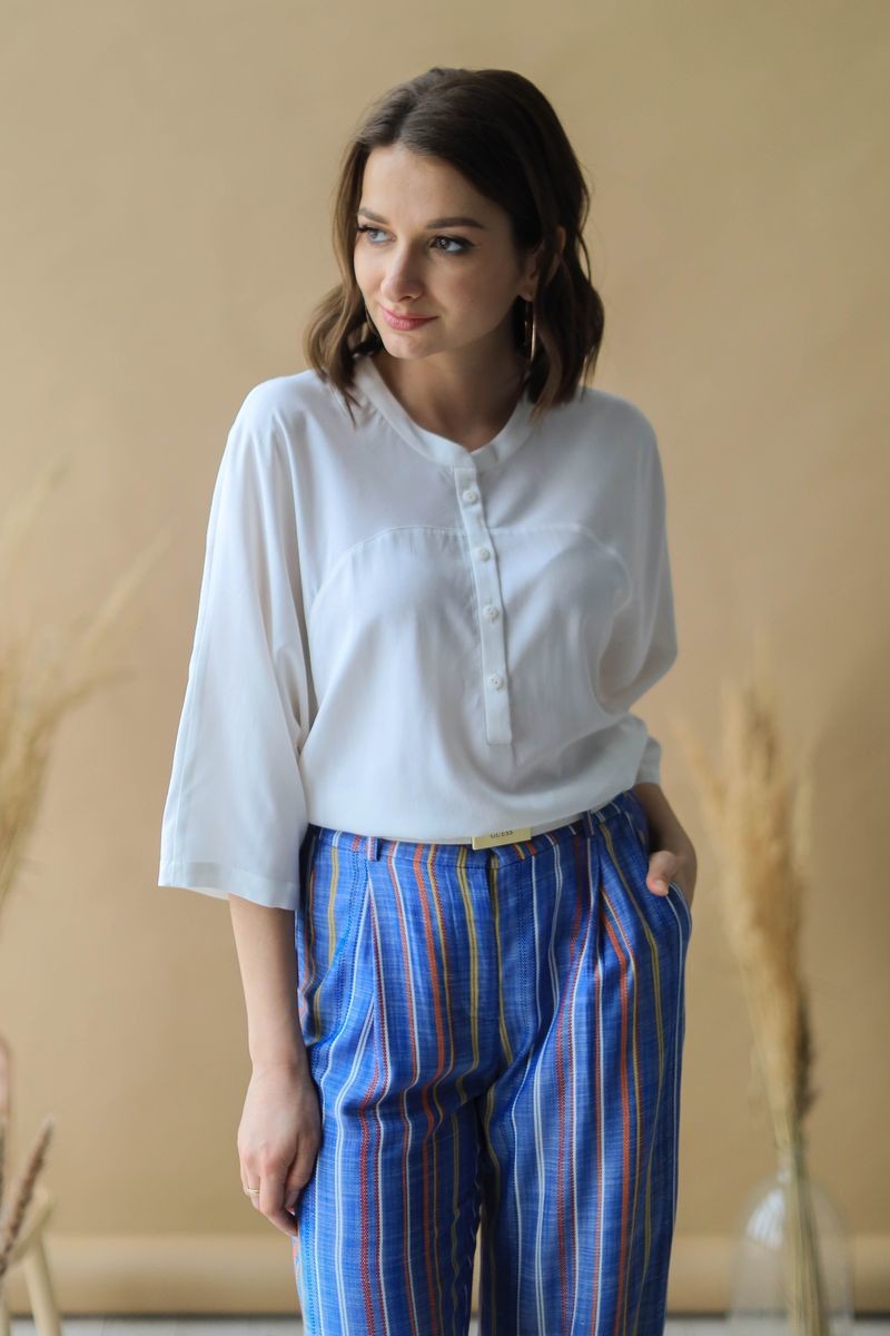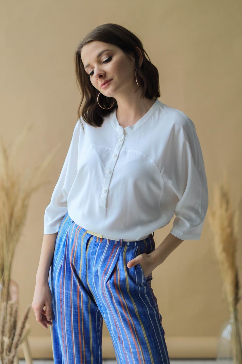 Блузка свободного силуэта. Цельнокроенный рукав, застежка-поло на пуговицы.