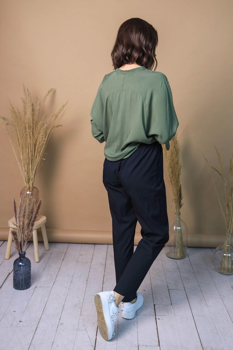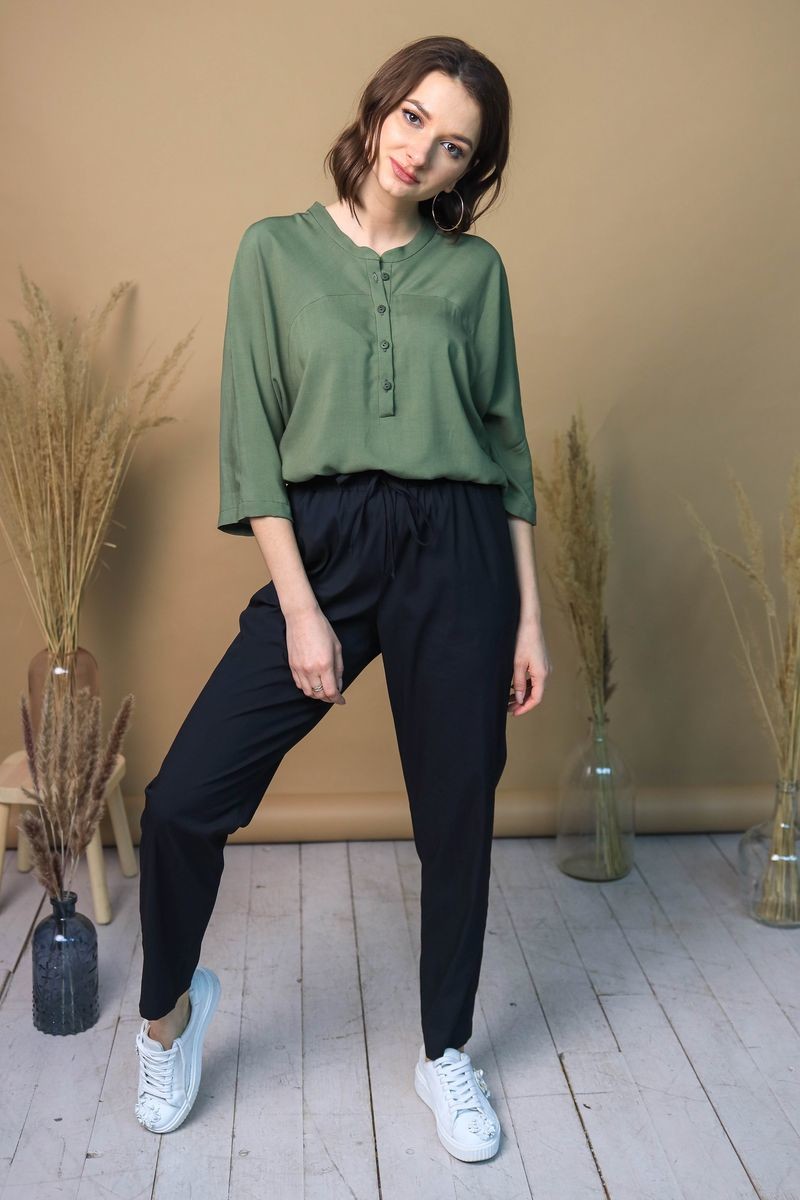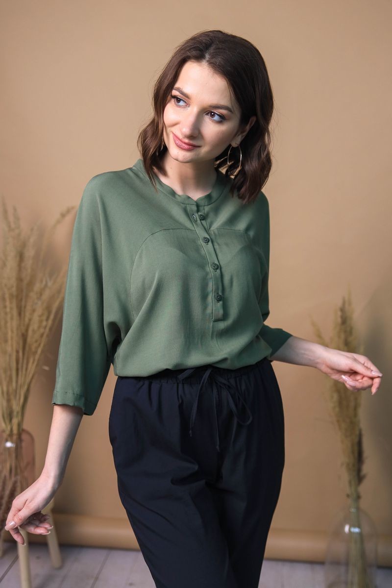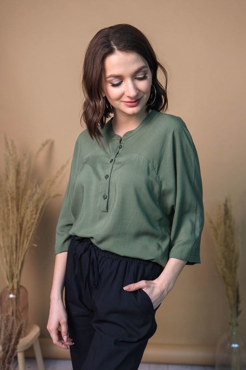 Блузка свободного силуэта. Цельнокроенный рукав, застежка-поло на пуговицы.