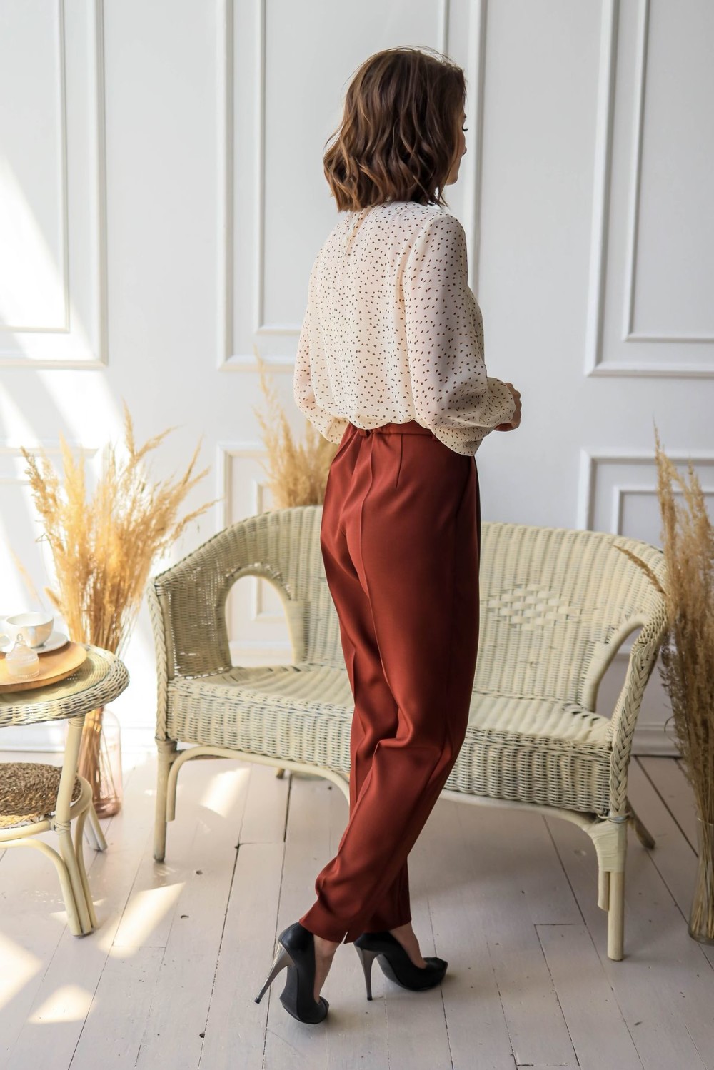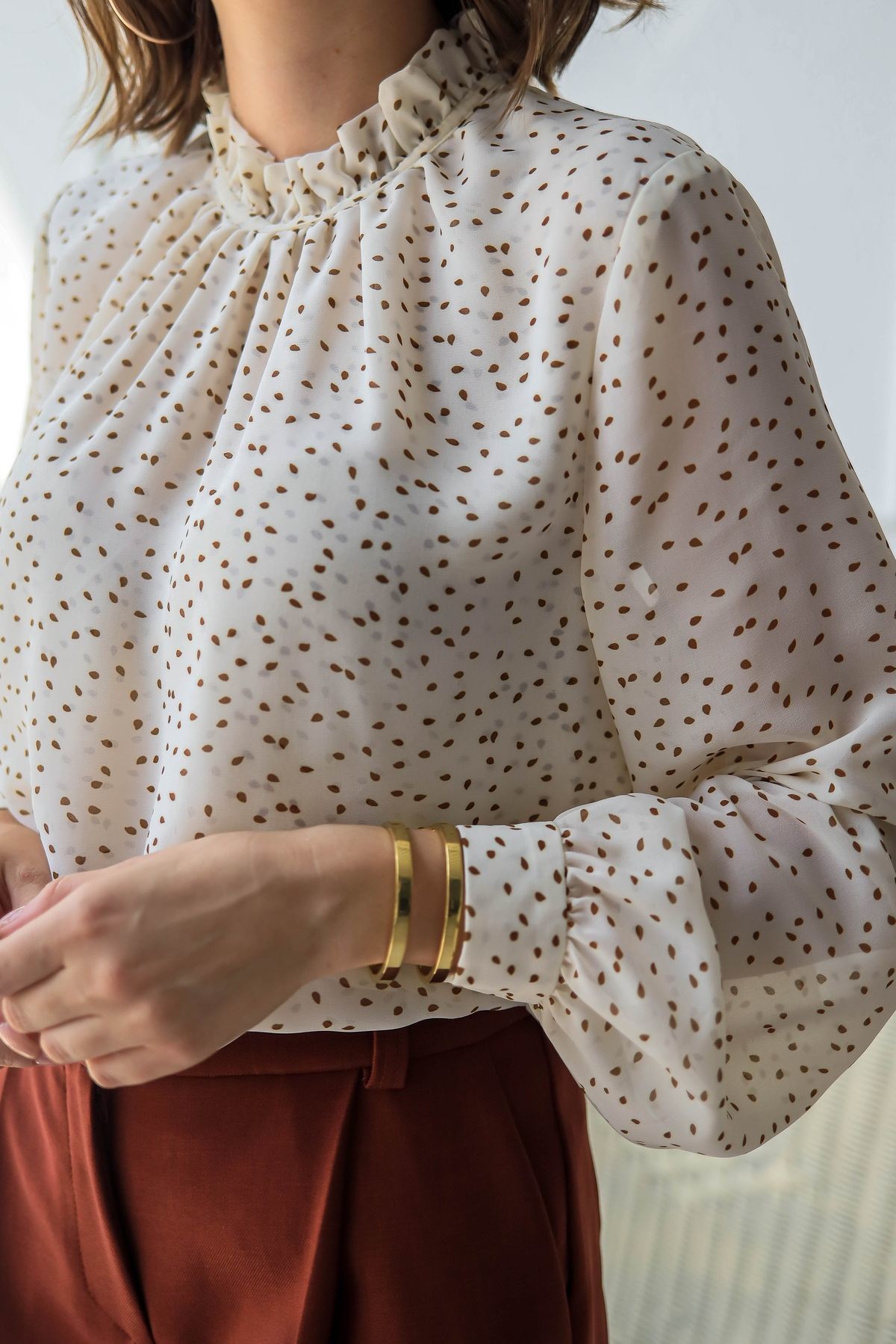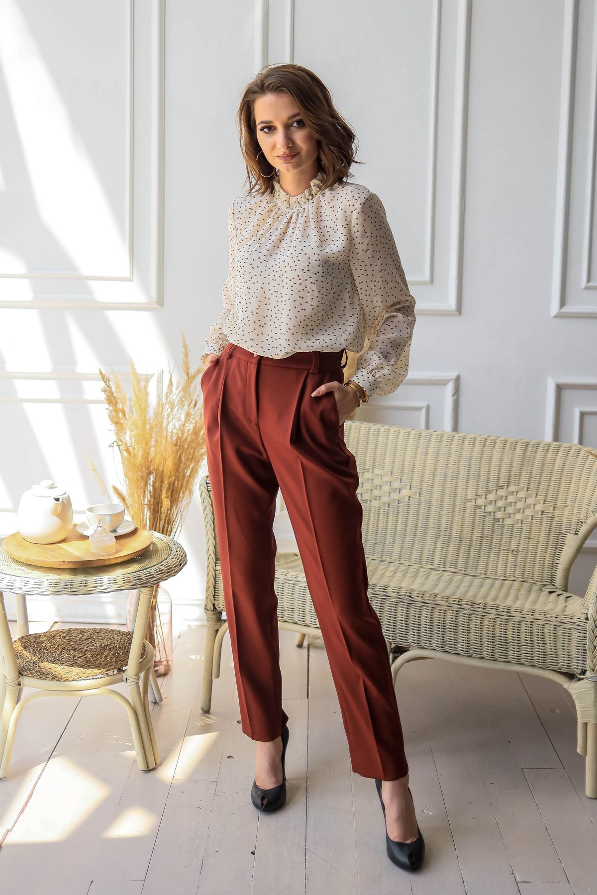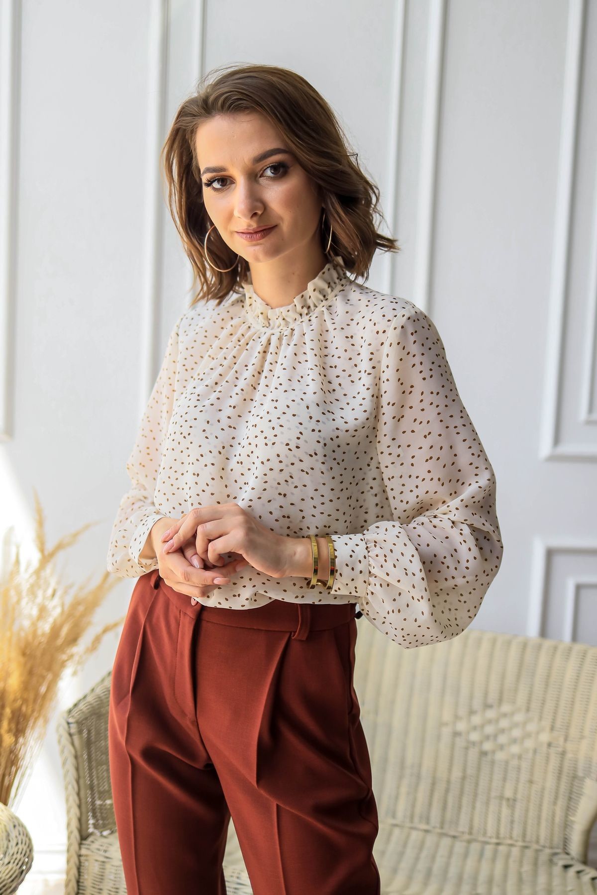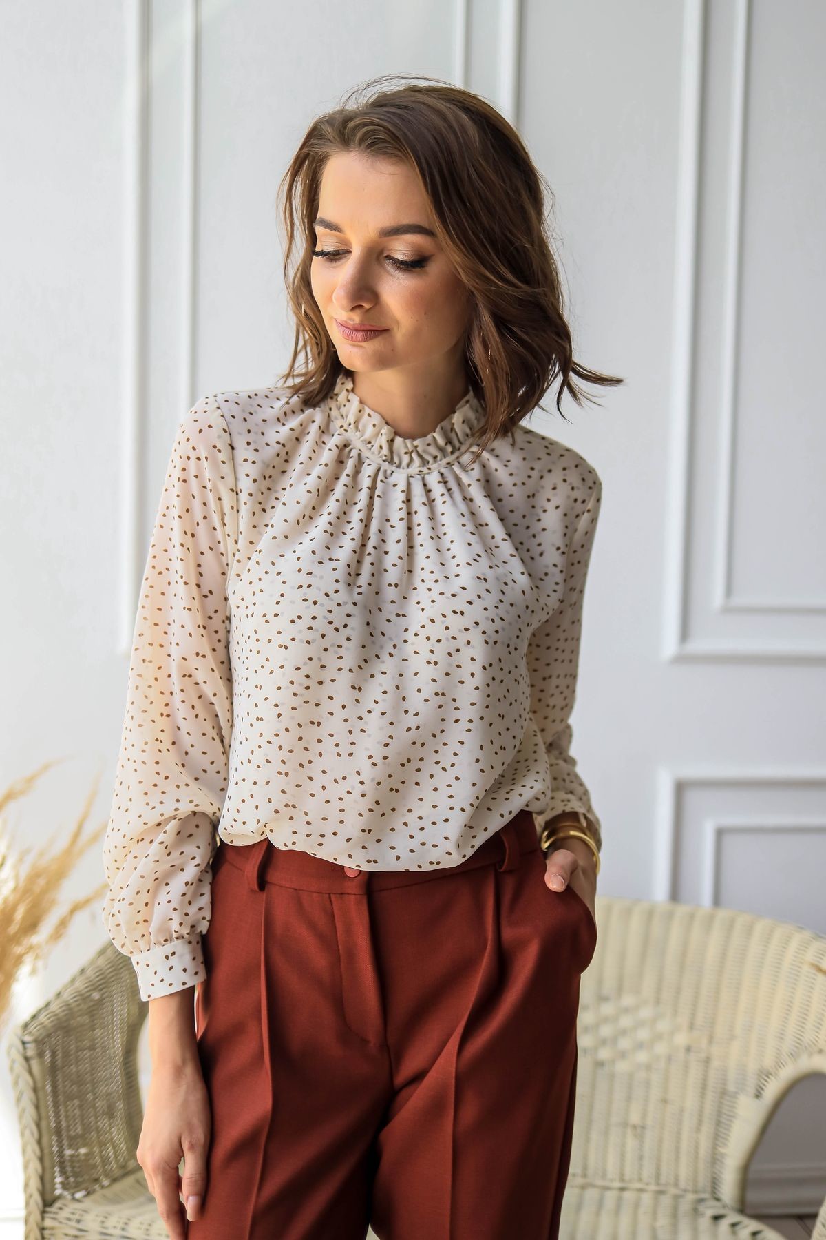 Элегантная блузка с присборенным воротником-стойкой. Втачной рукав обработан манжетой, сзади застежка на петлю и пуговицу.