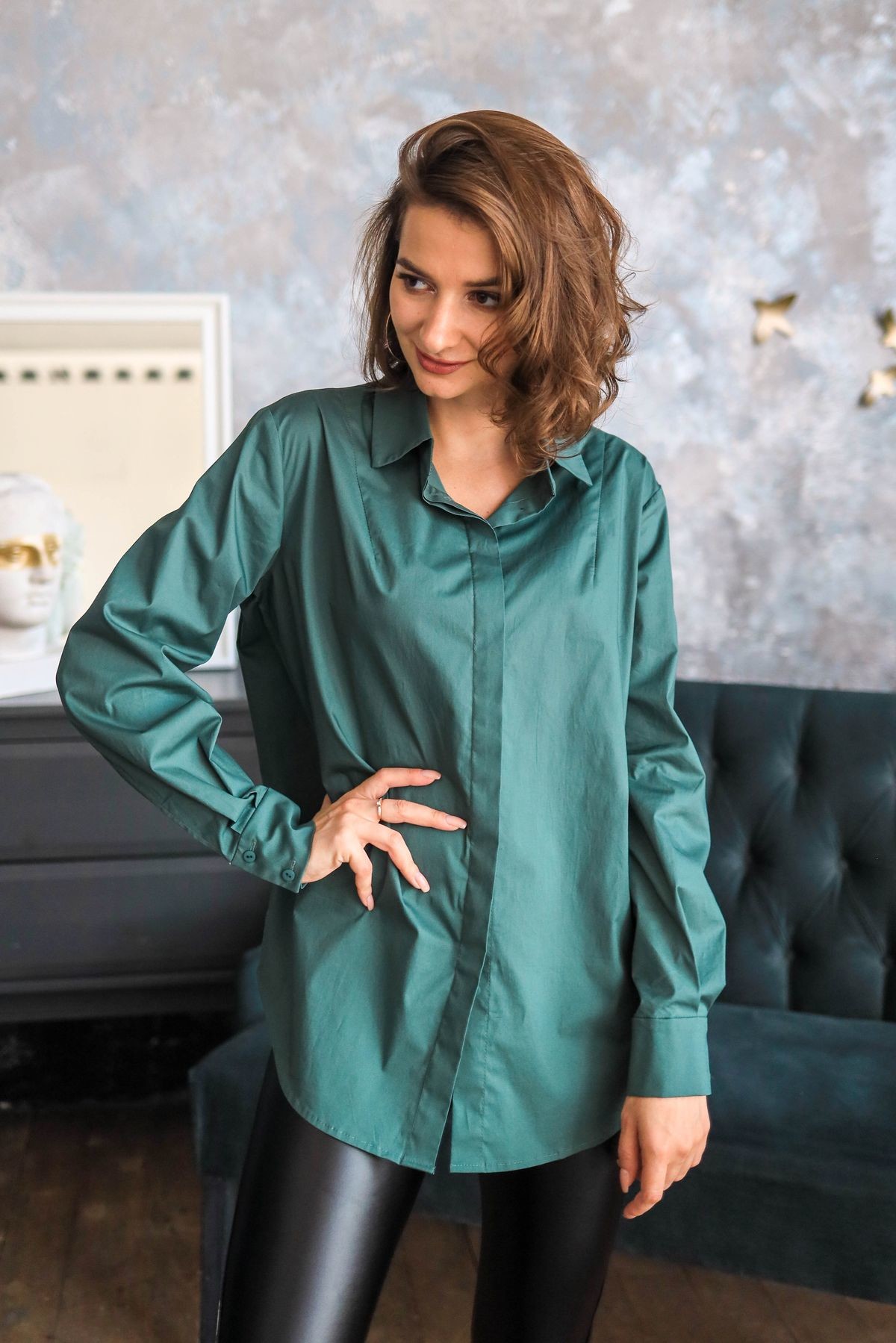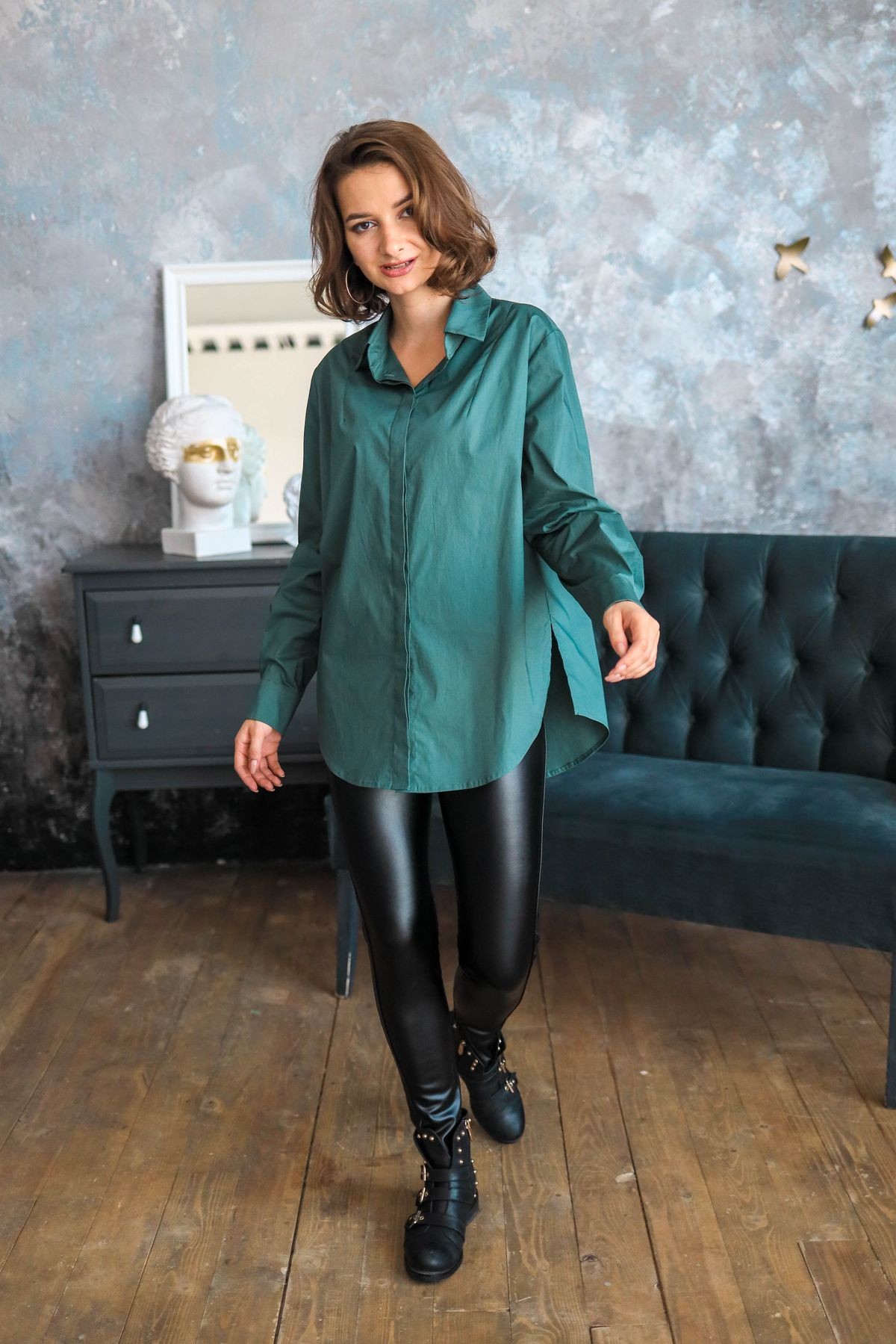 Стильная удлиненная рубашка из хлопка. Свободный силуэт. Низ закруглен, в боковых швах разрезы. Отложной воротник, втачной рукав обработан манжетой. Супатная застежка на пуговицы. Модель смотрится очень интересно и в духе времени!