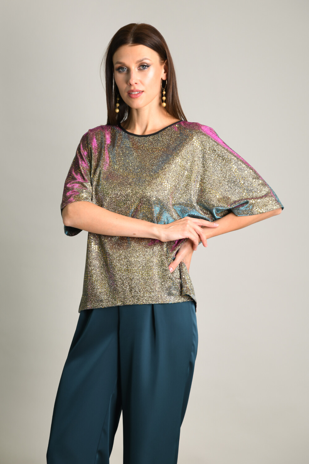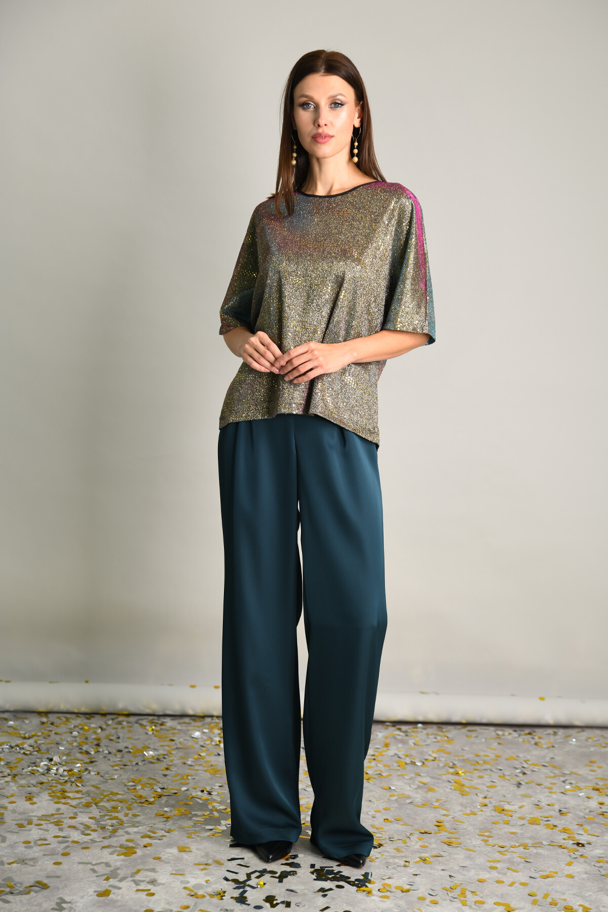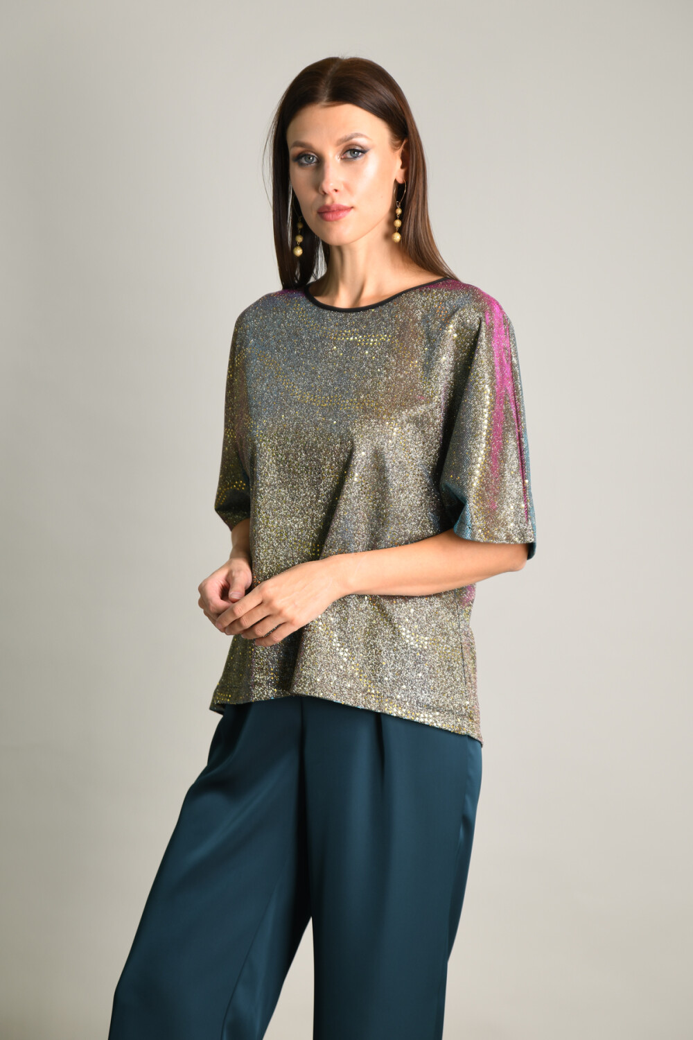 Туника свободного силуэта из материала, расшитого пайетками. Изделие обработано подкладкой из сетки (не колется). Цельнокроенный рукав, на спинке завязки из гладкого полотна аналогичного оттенка.