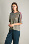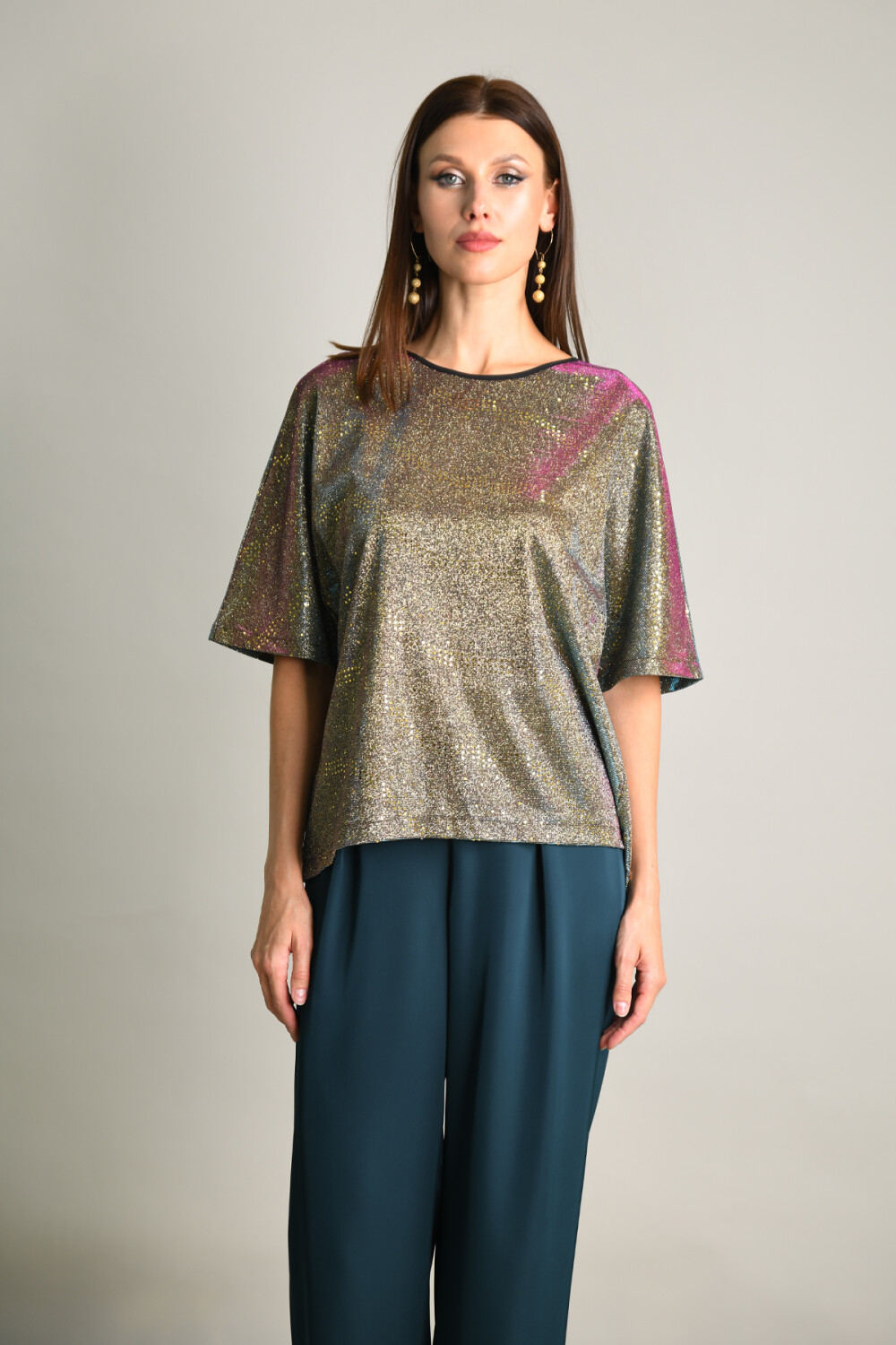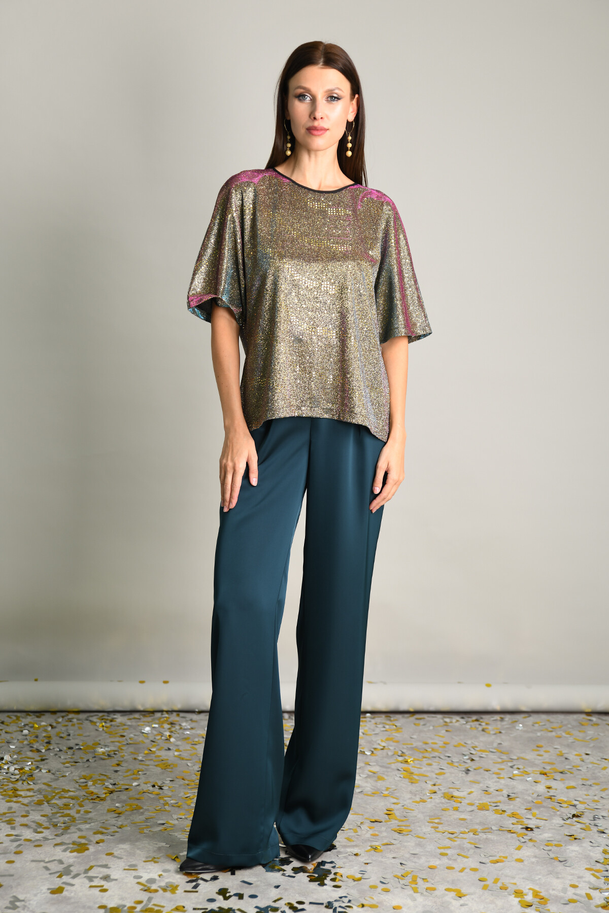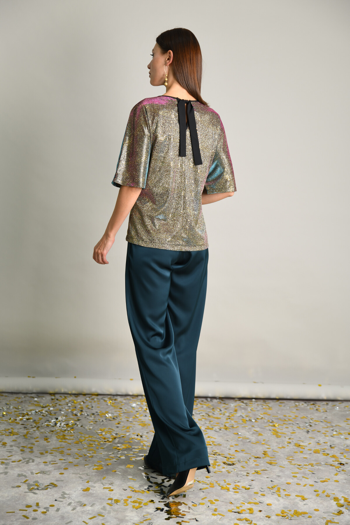 Туника свободного силуэта из материала, расшитого пайетками. Изделие обработано подкладкой из сетки (не колется). Цельнокроенный рукав, на спинке завязки из гладкого полотна аналогичного оттенка.