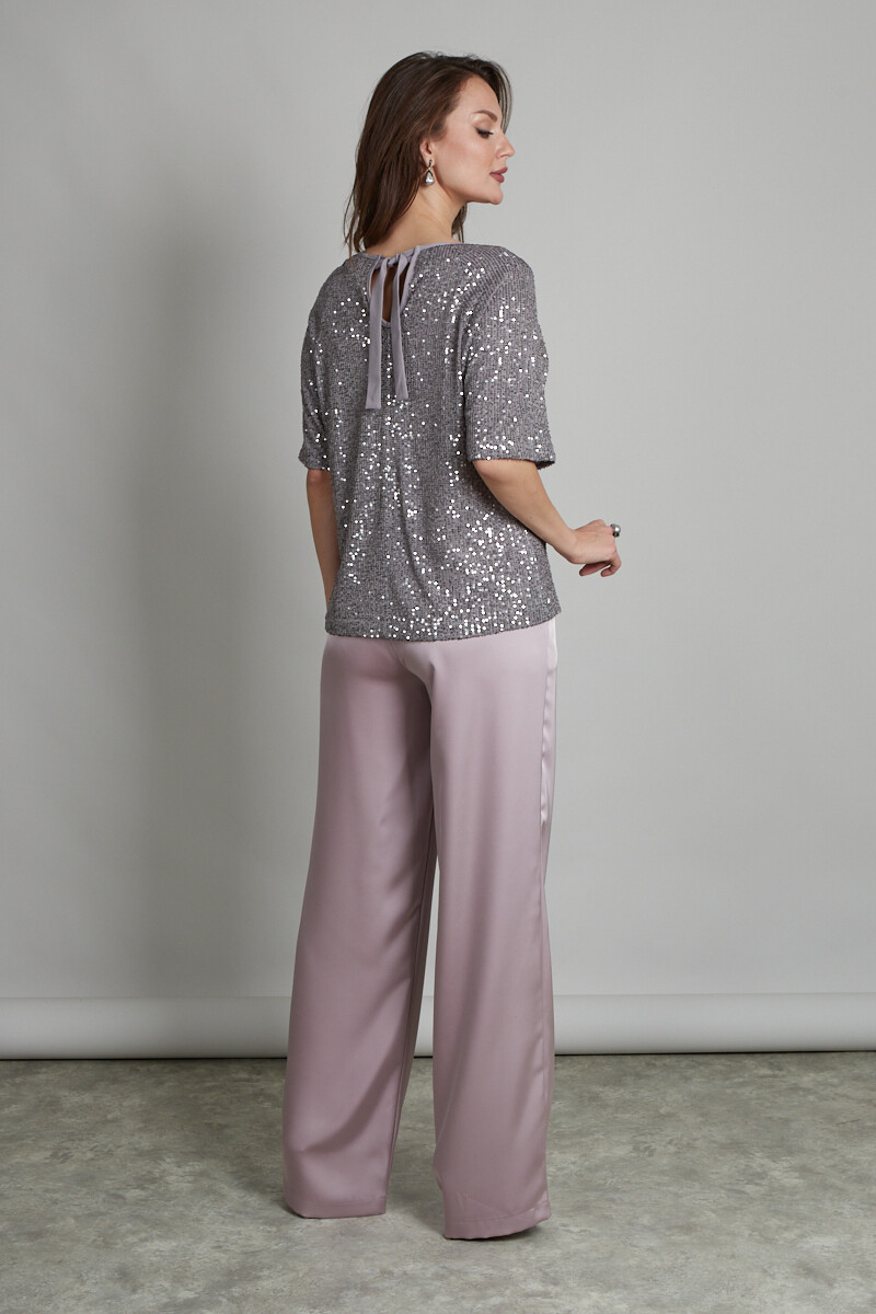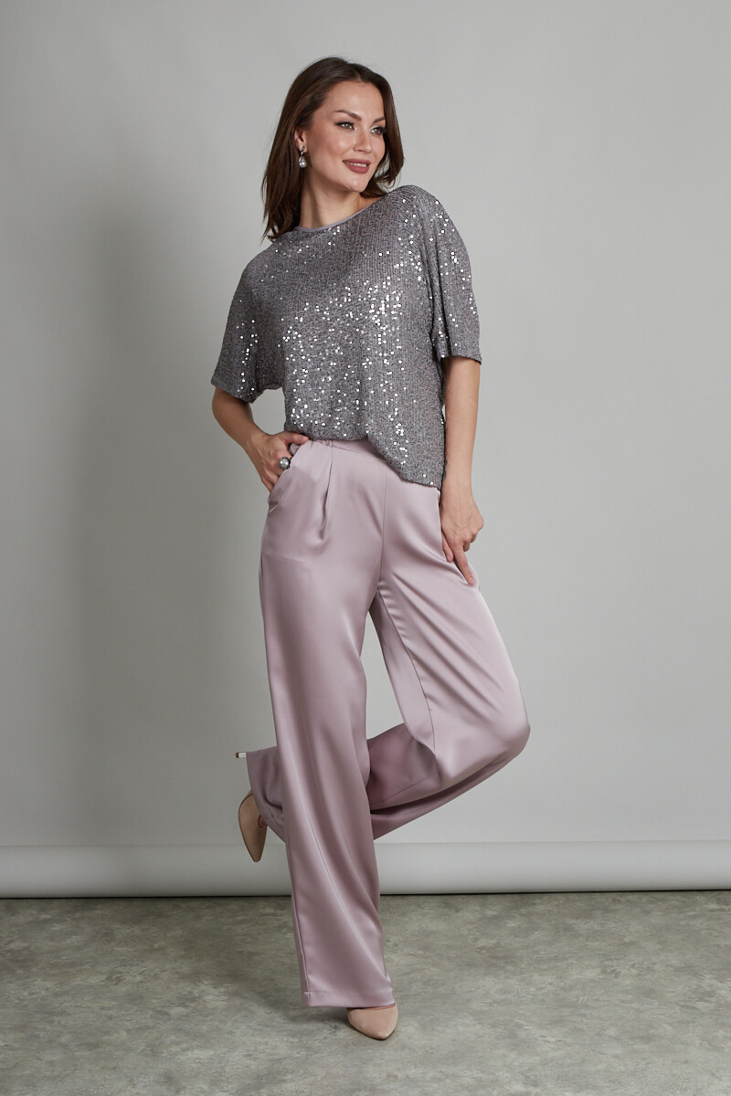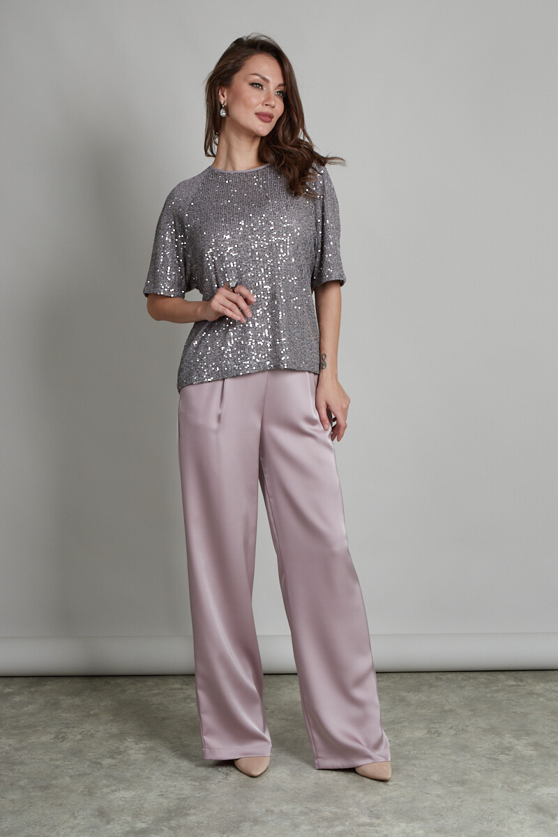 Туника свободного силуэта из материала, расшитого пайетками. Изделие обработано подкладкой из сетки (не колется). Цельнокроенный рукав, на спинке завязки из гладкого полотна аналогичного оттенка.
