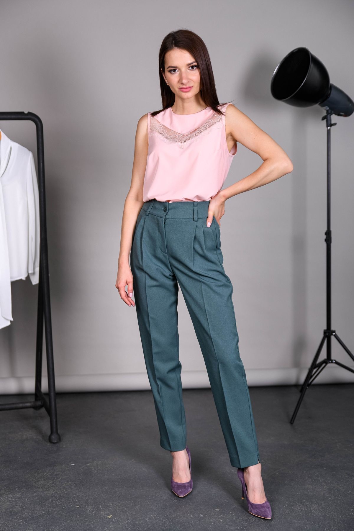 Блузка прямого силуэта без рукавов. На полочке вставка из нежного кружева. Застежка на петлю и пуговицу на спинке.