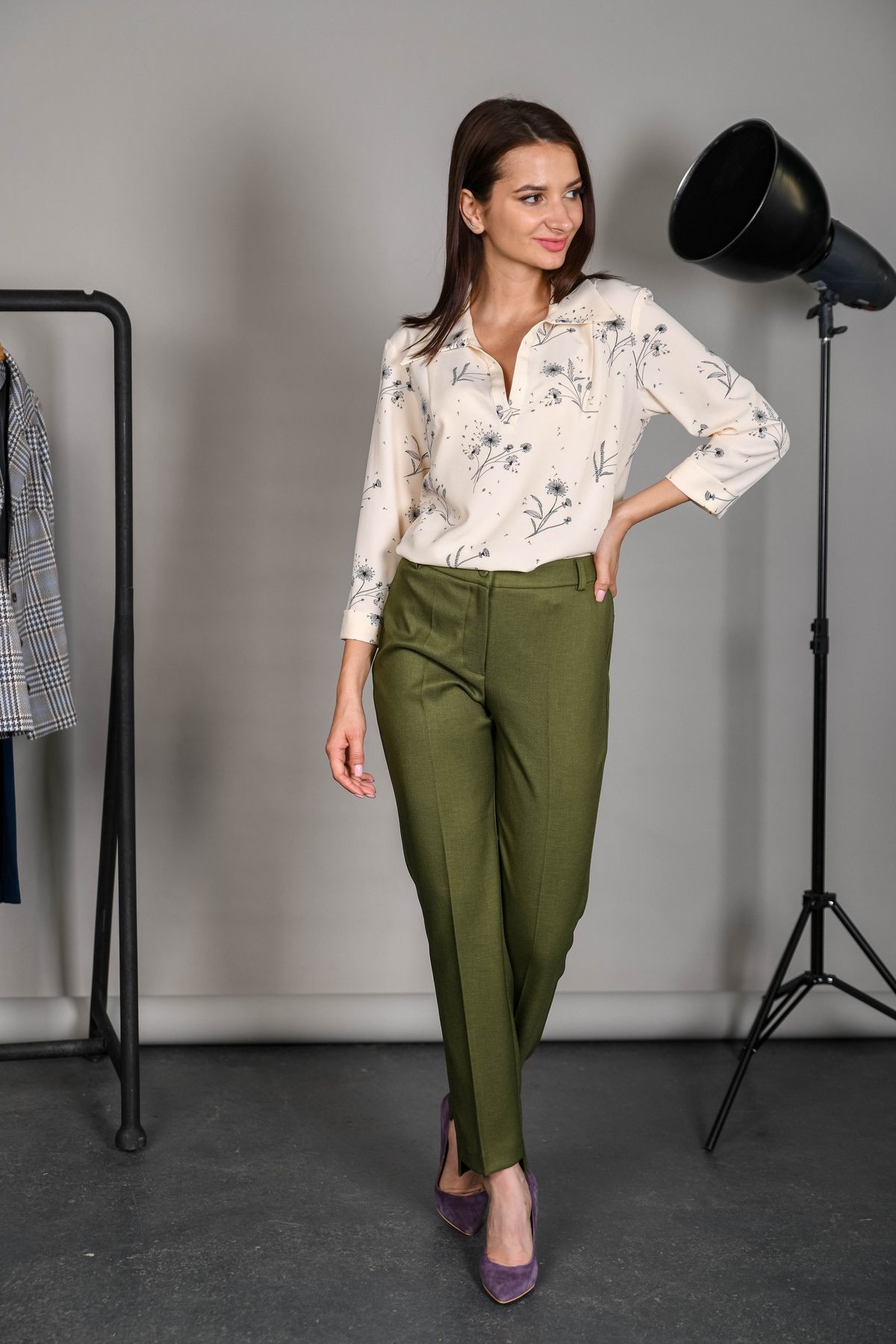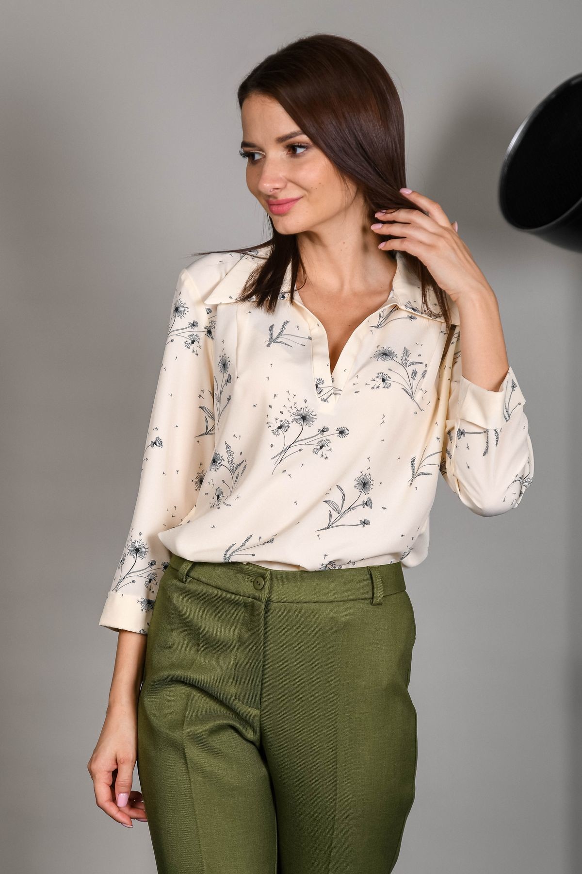 Блузка прямого силуэта. Отложной воротник, вырез горловины-галочка, втачные рукава обработаны отворотами.