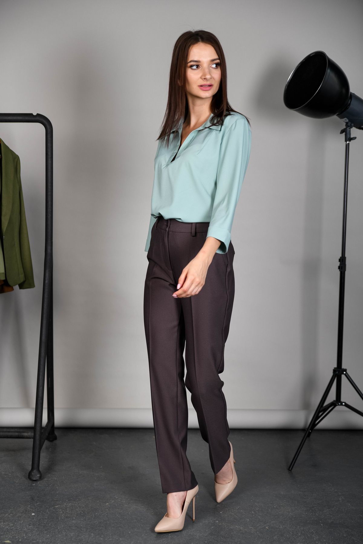 Блузка прямого силуэта. Отложной воротник, вырез горловины-галочка, втачные рукава обработаны отворотами.