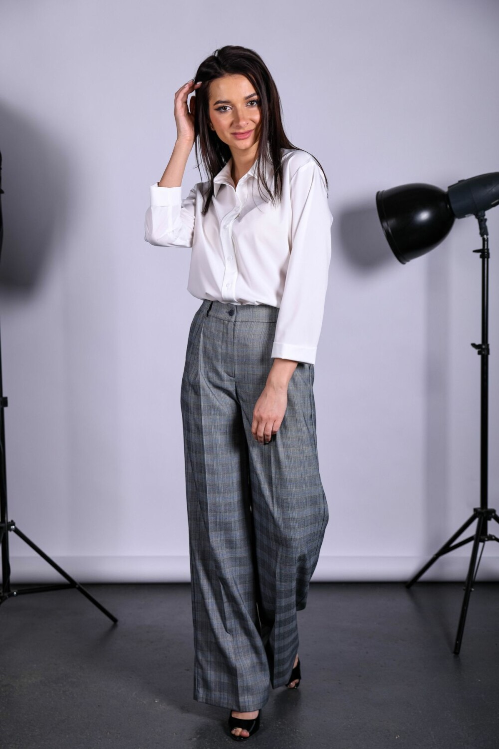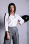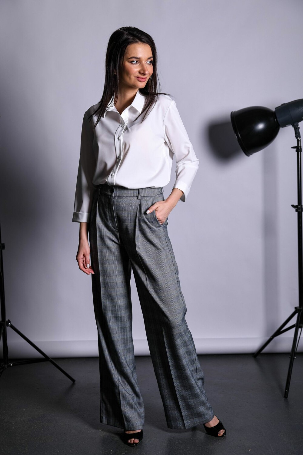 Блузка прямого силуэта. Втачной рукав обработан отворотом, воротник отложной. Застежка на пуговицы по всей длине.