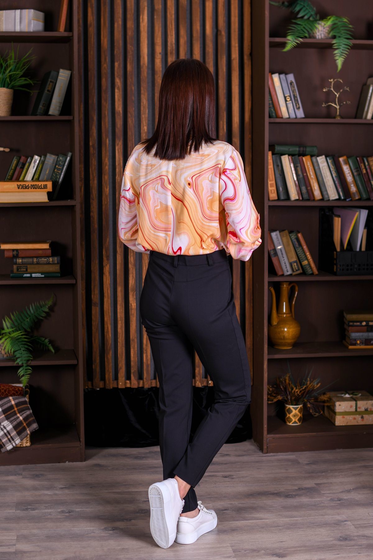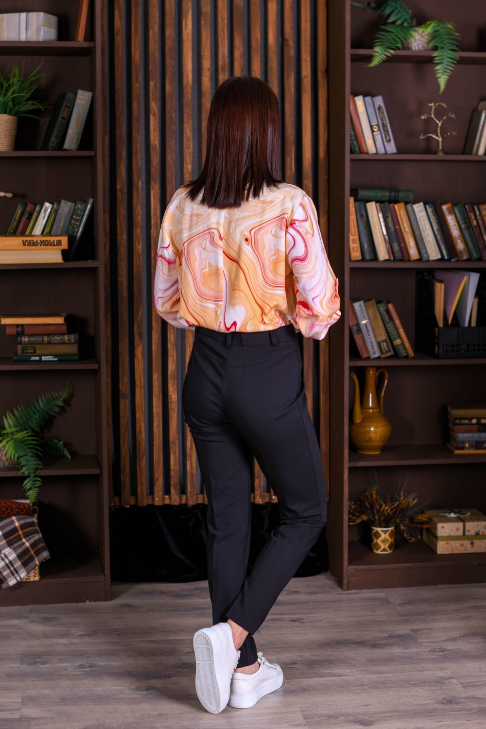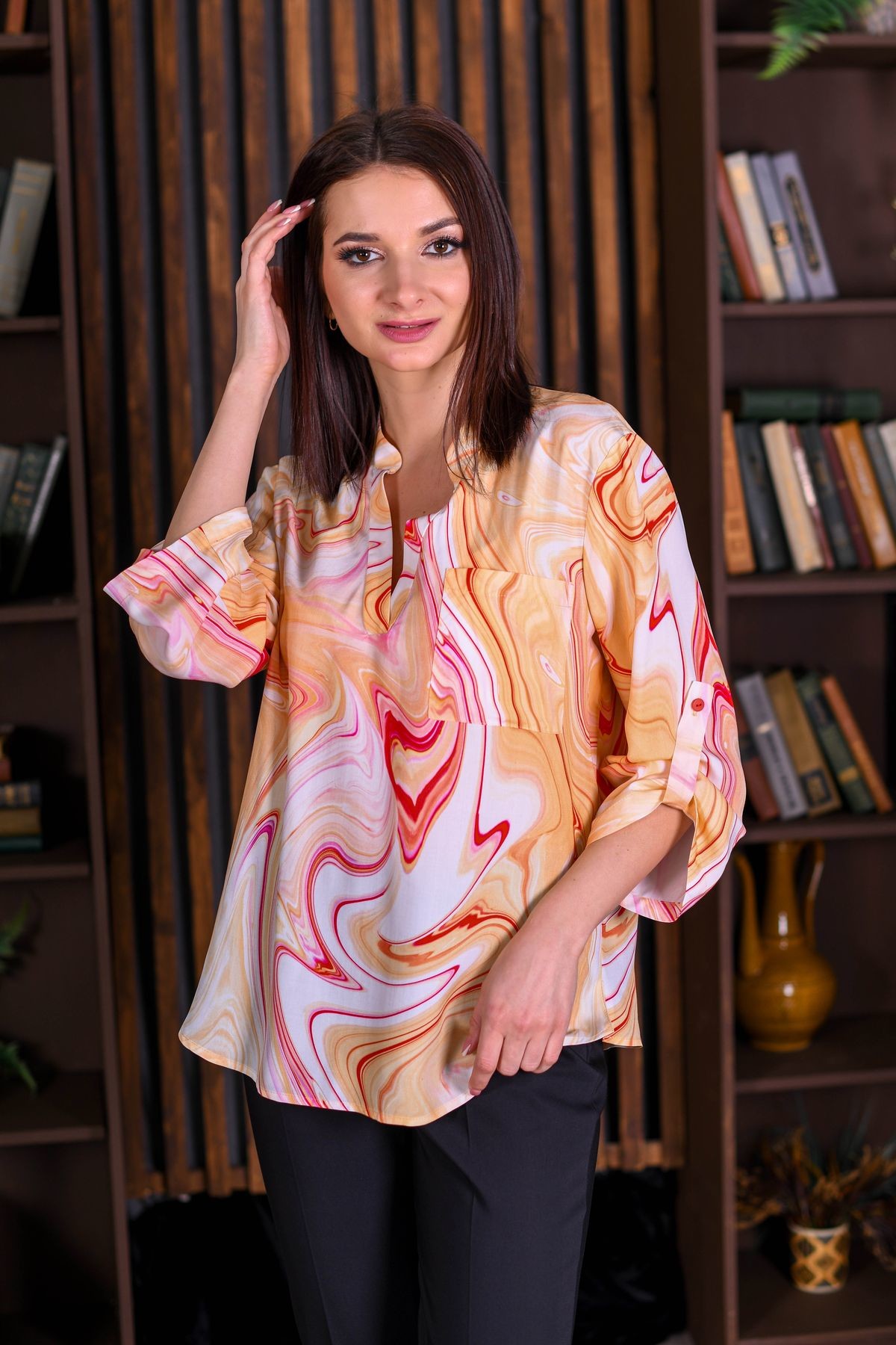 Блузка свободного силуэта. Воротник-поло, переходящий в изящный разрез. Накладной карман на груди, втачной рукав, регулировка рукавов на паты.