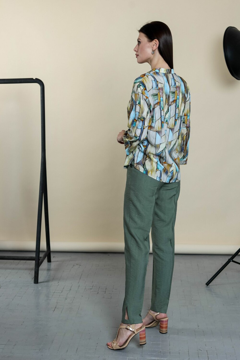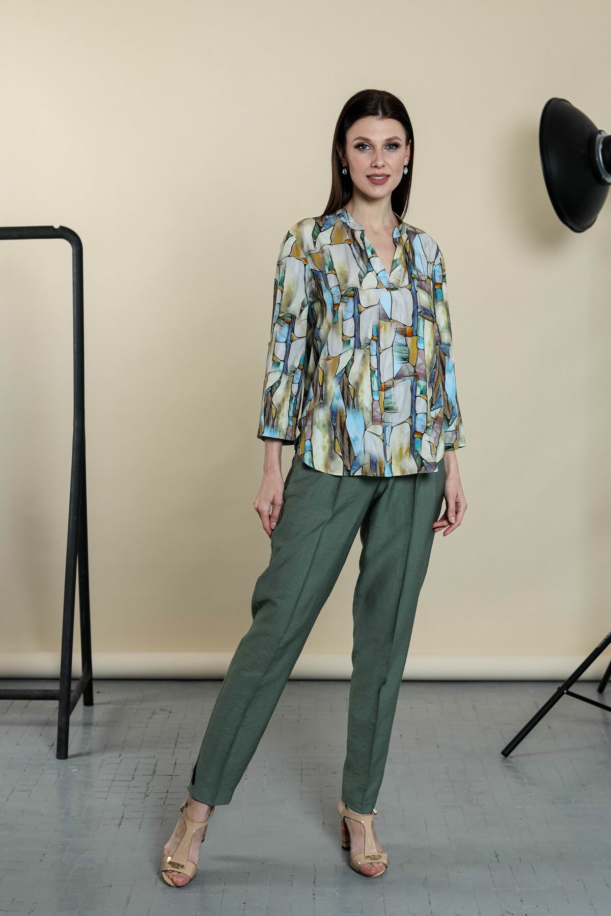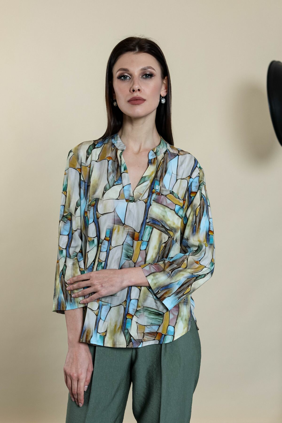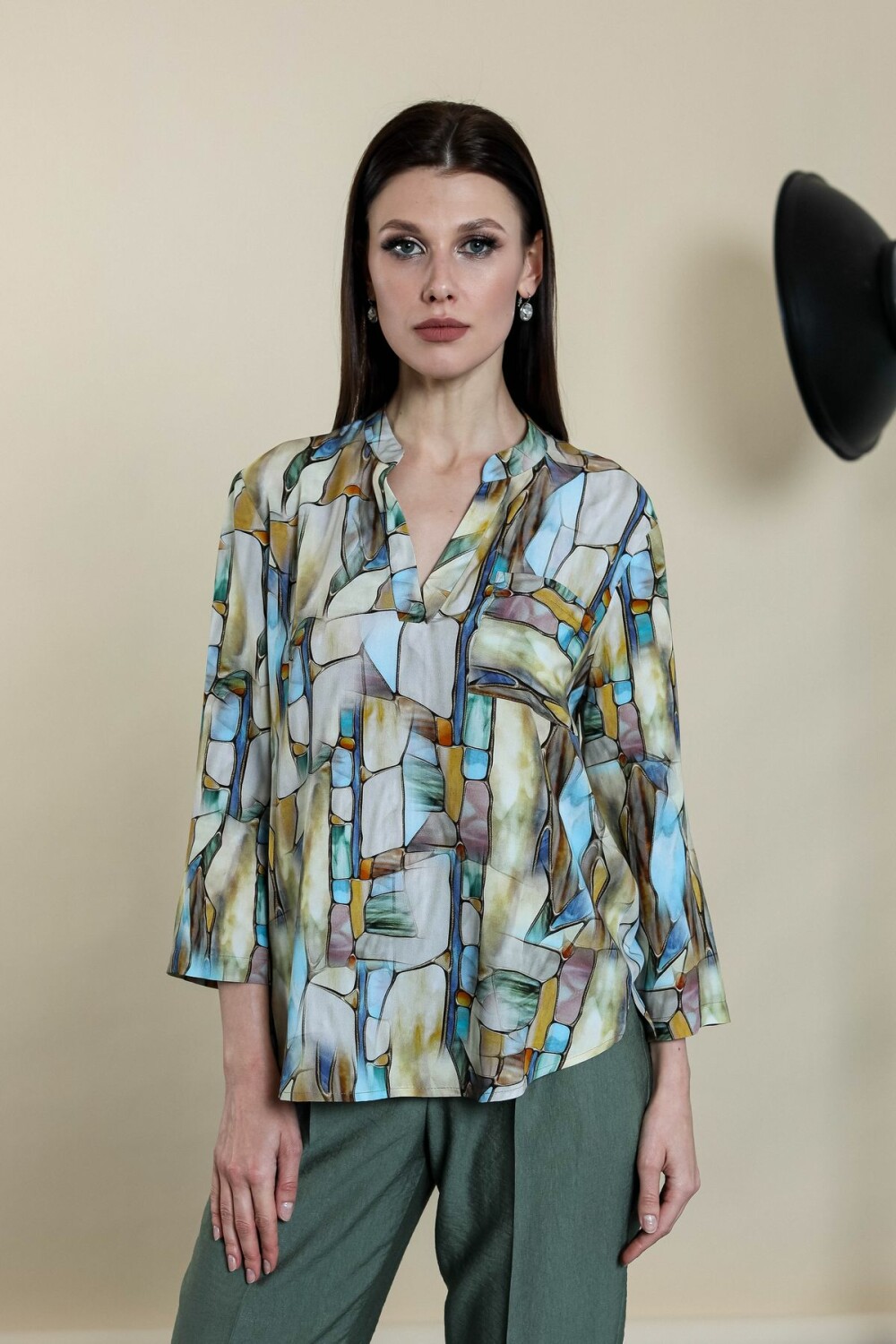 Блузка свободного силуэта. Воротник-поло, переходящий в изящный разрез. Накладной карман на груди, втачной рукав, регулировка рукавов на паты.