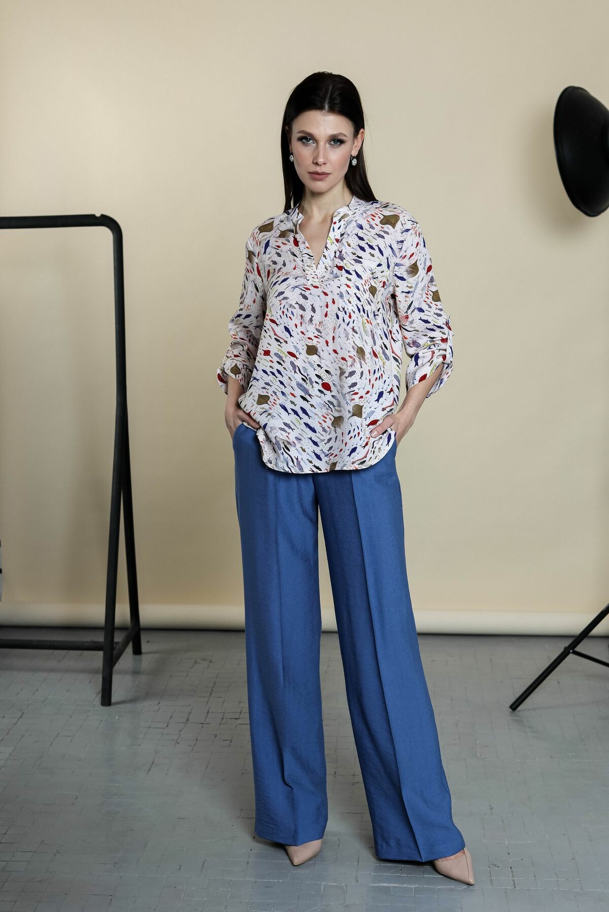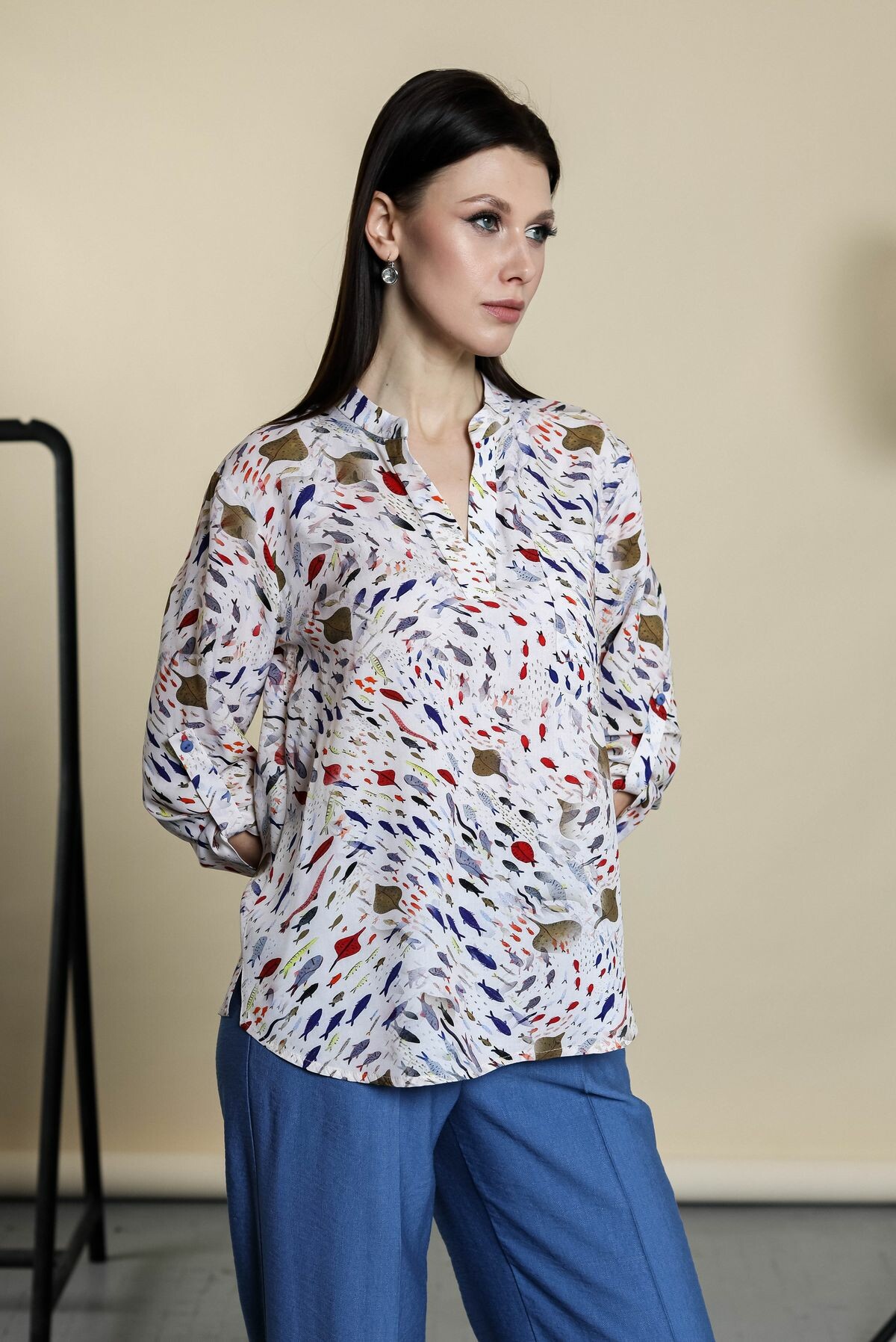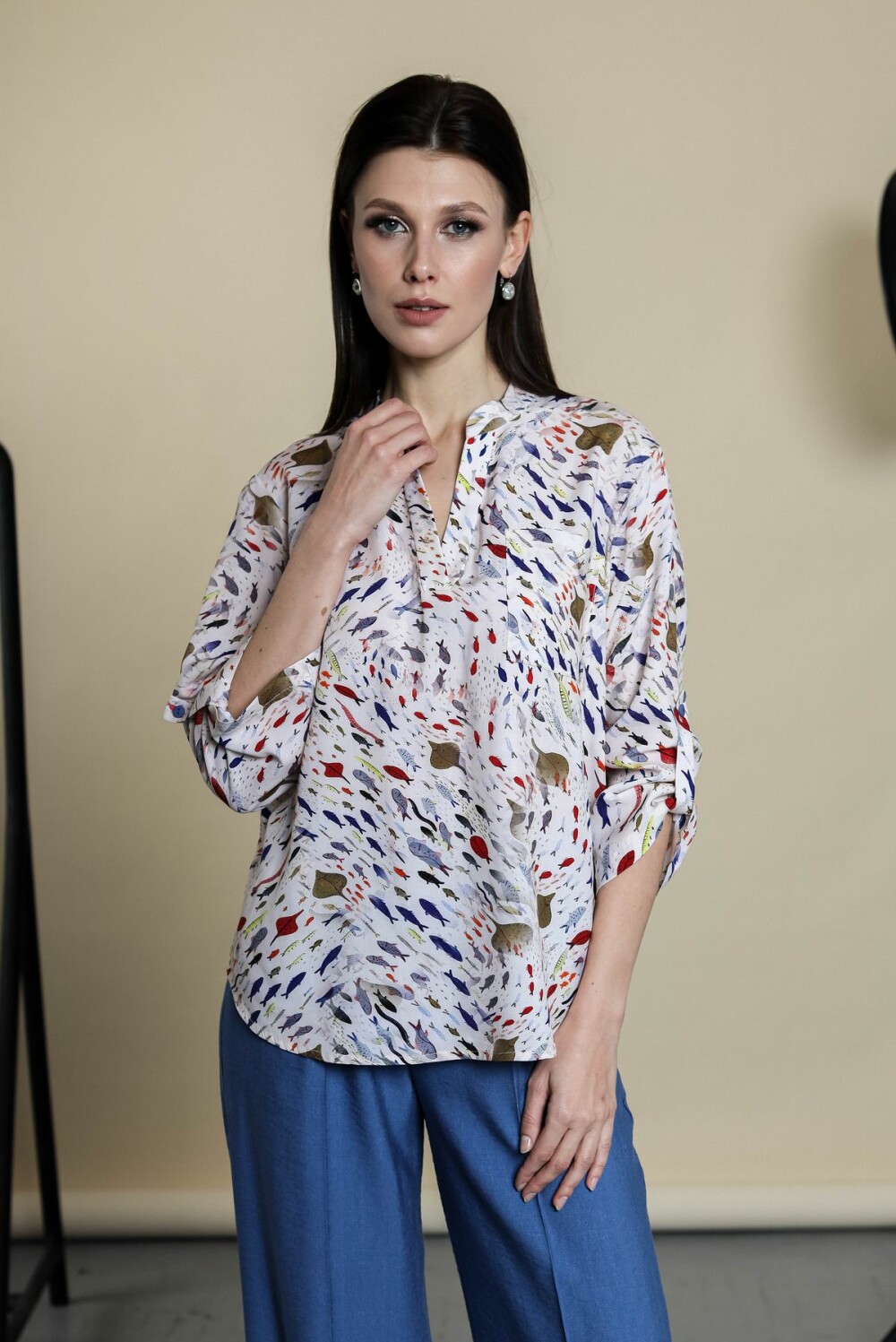 Блузка свободного силуэта. Воротник-поло, переходящий в изящный разрез. Накладной карман на груди, втачной рукав, регулировка рукавов на паты.