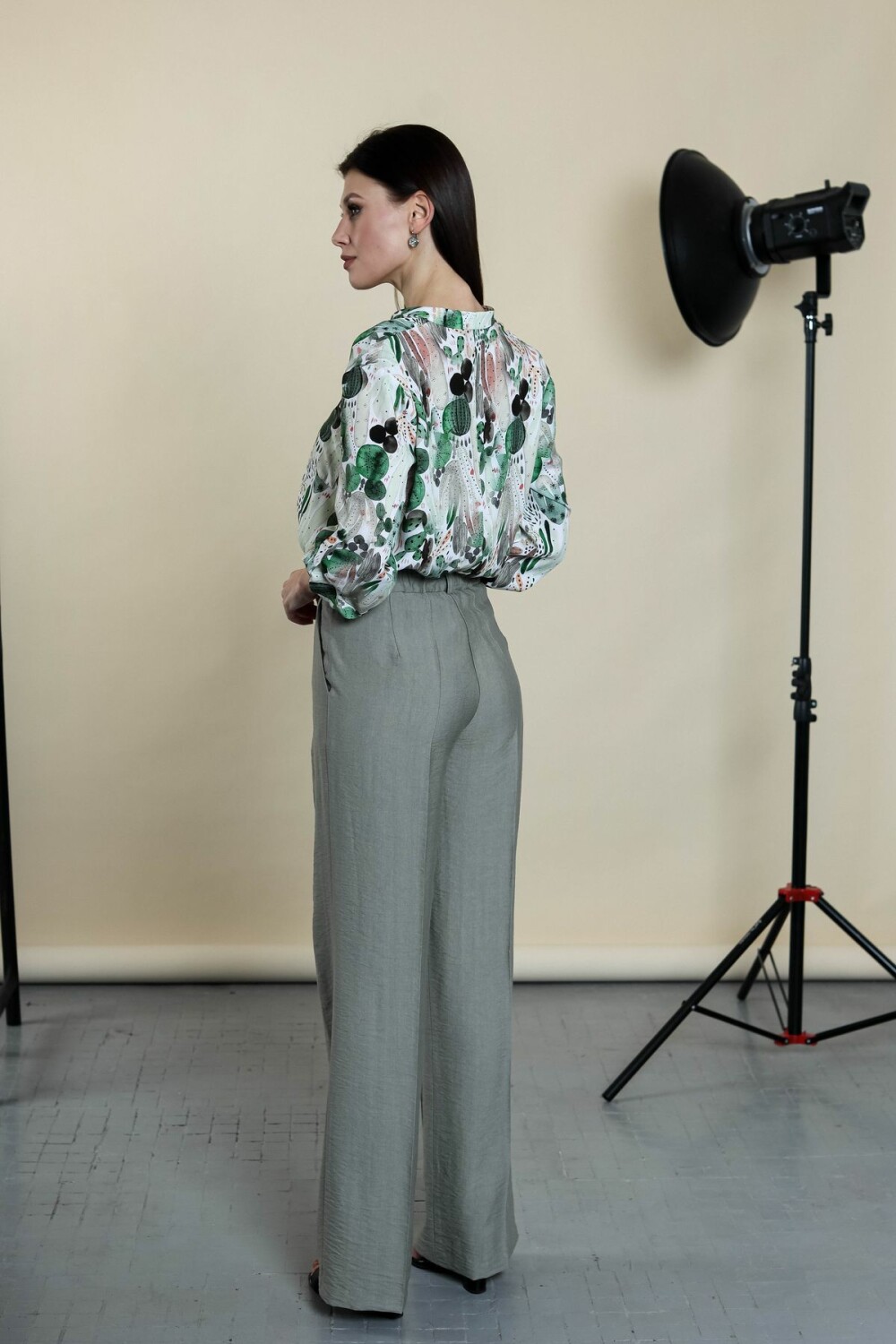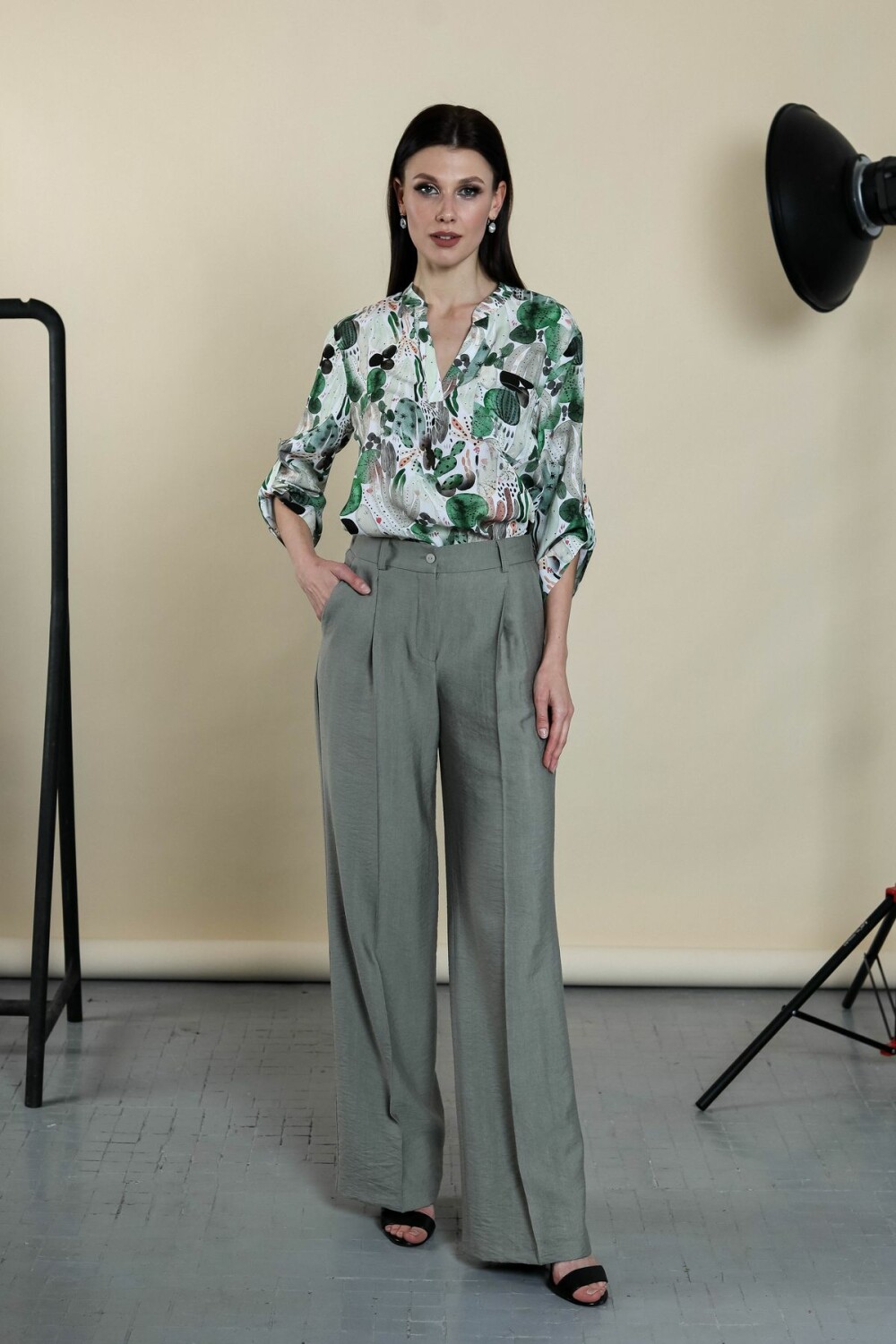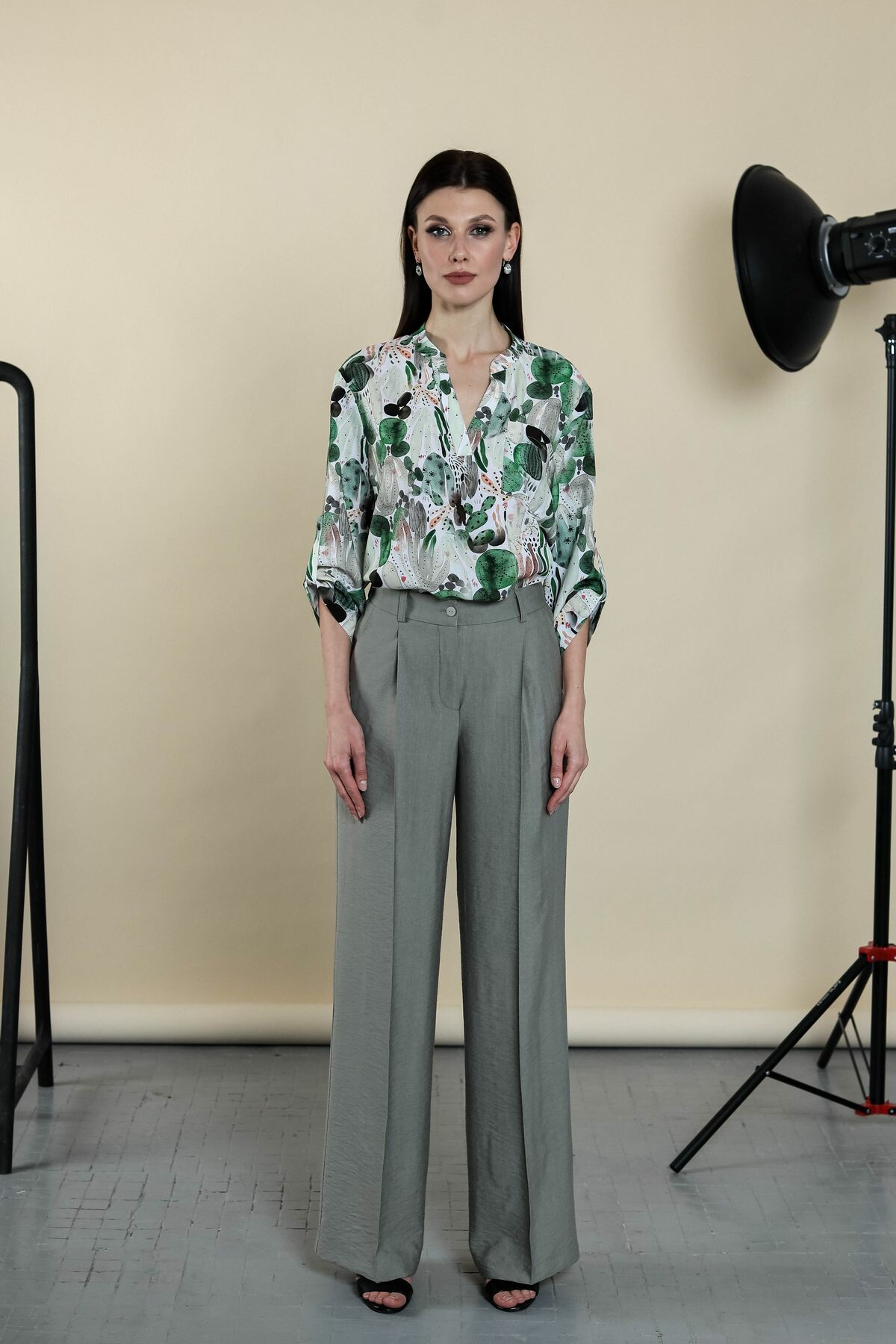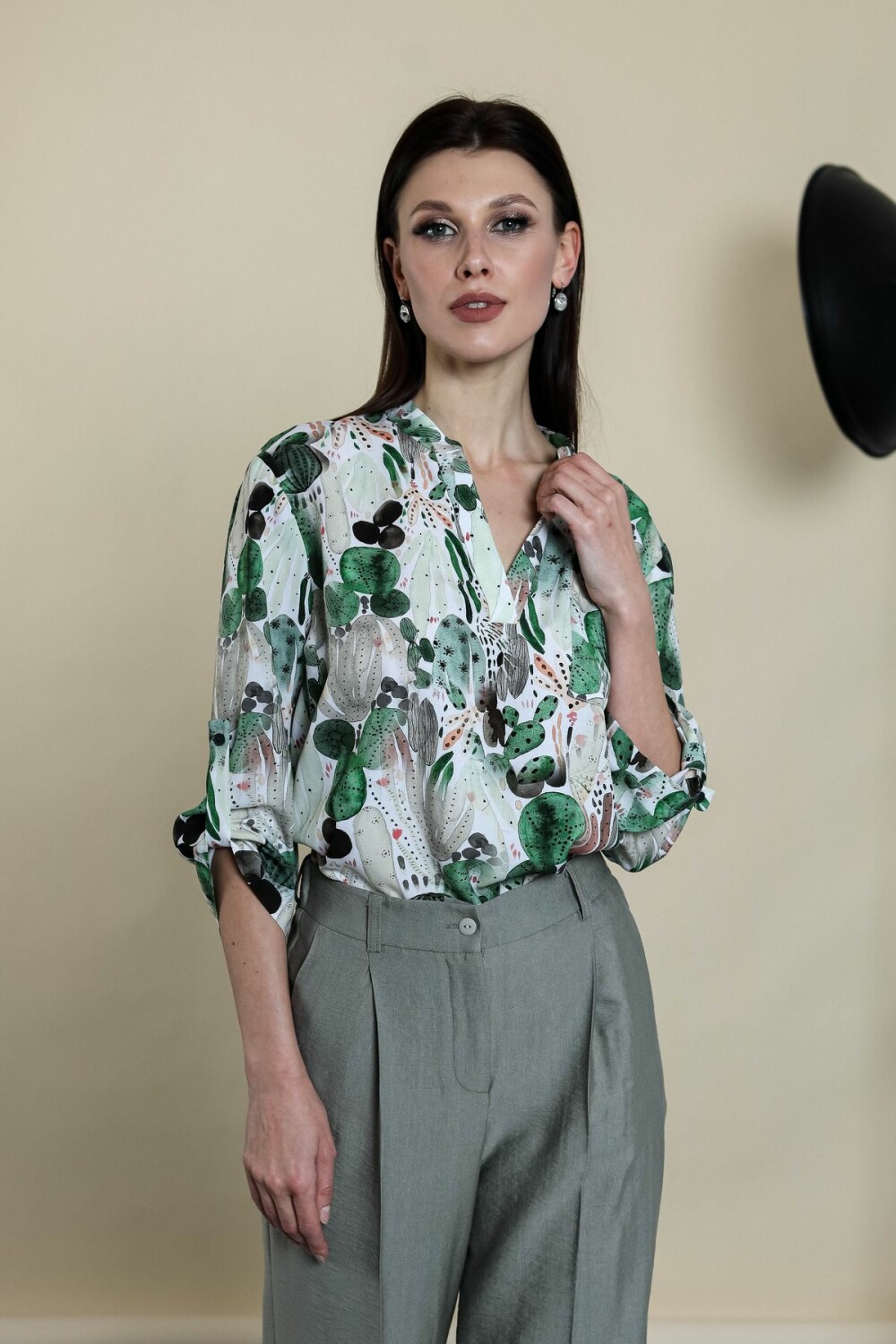 Блузка свободного силуэта. Воротник-поло, переходящий в изящный разрез. Накладной карман на груди, втачной рукав, регулировка рукавов на паты.