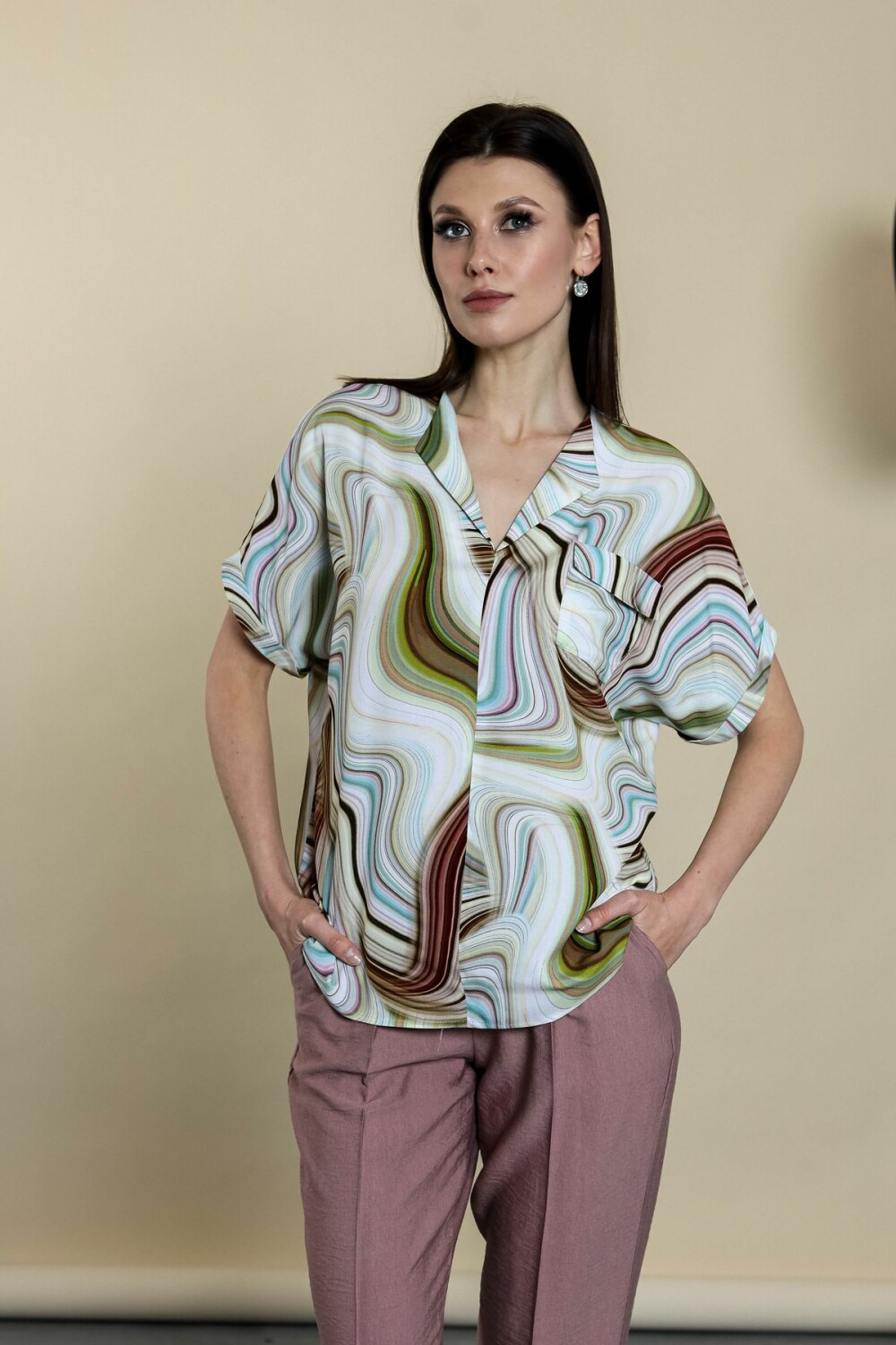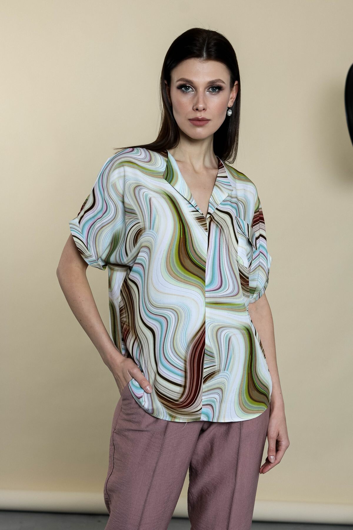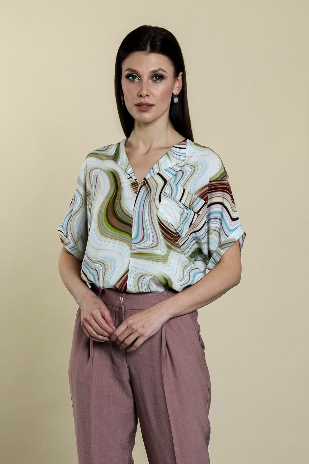 Блузка прямого силуэта. Цельнокроенный рукав обработан отворотом.