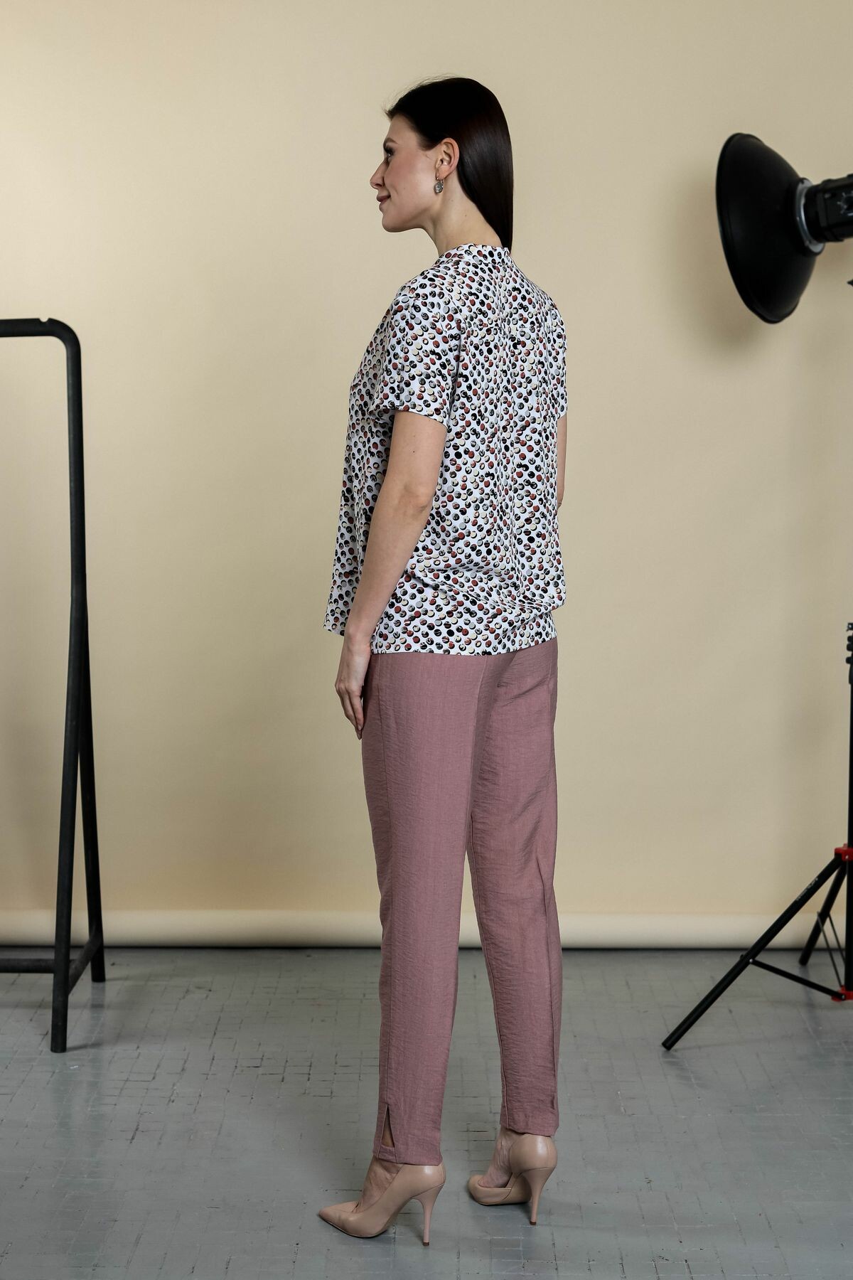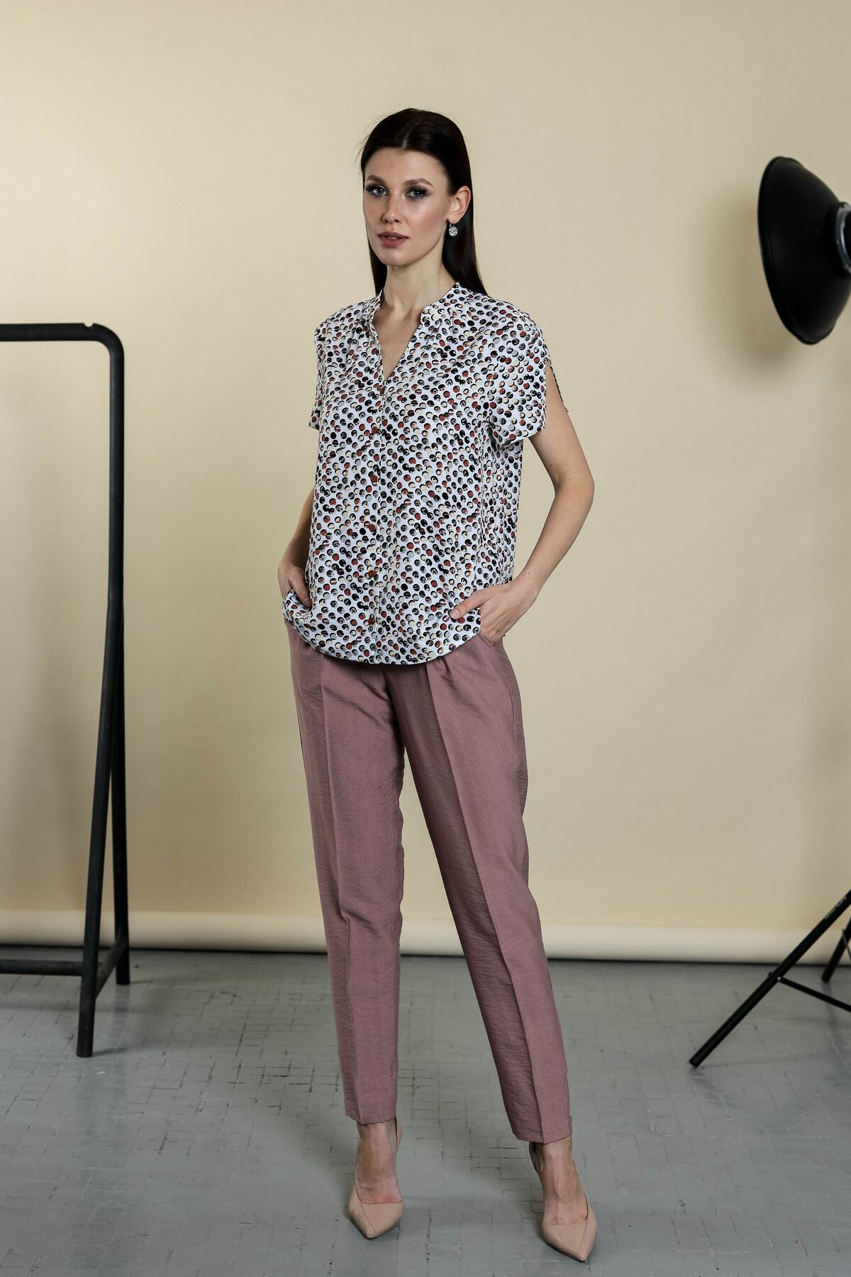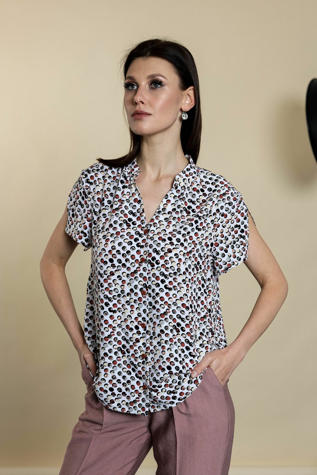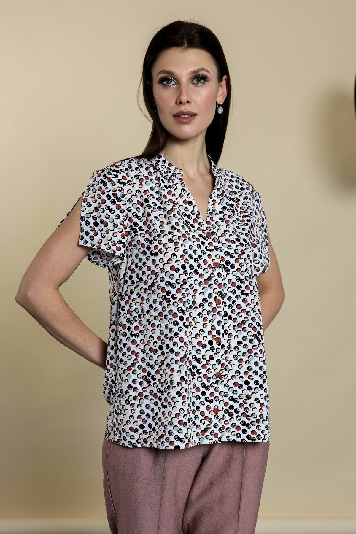 Блузка прямого силуэта на пуговицах. Воротник-стойка, втачной рукав обработан разрезом.