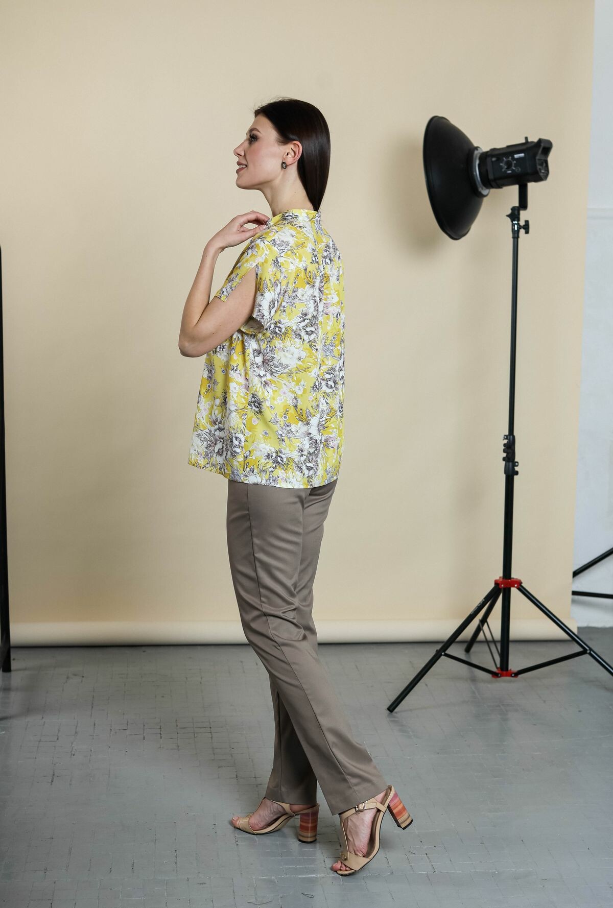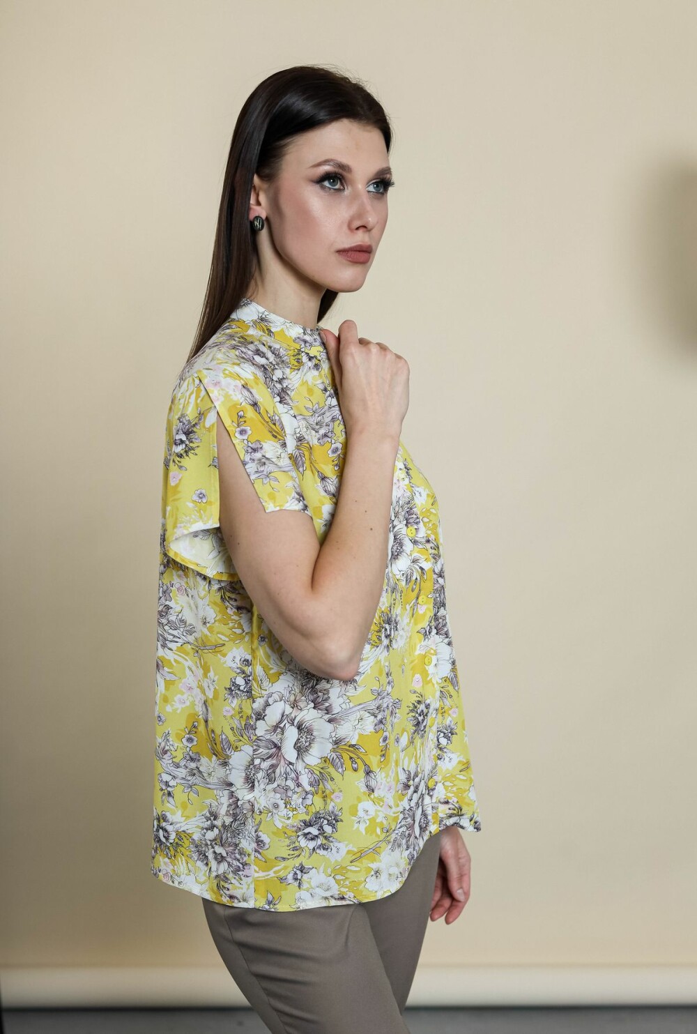Блузка прямого силуэта на пуговицах. Воротник-стойка, втачной рукав обработан разрезом.