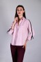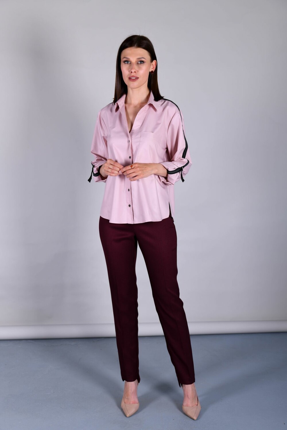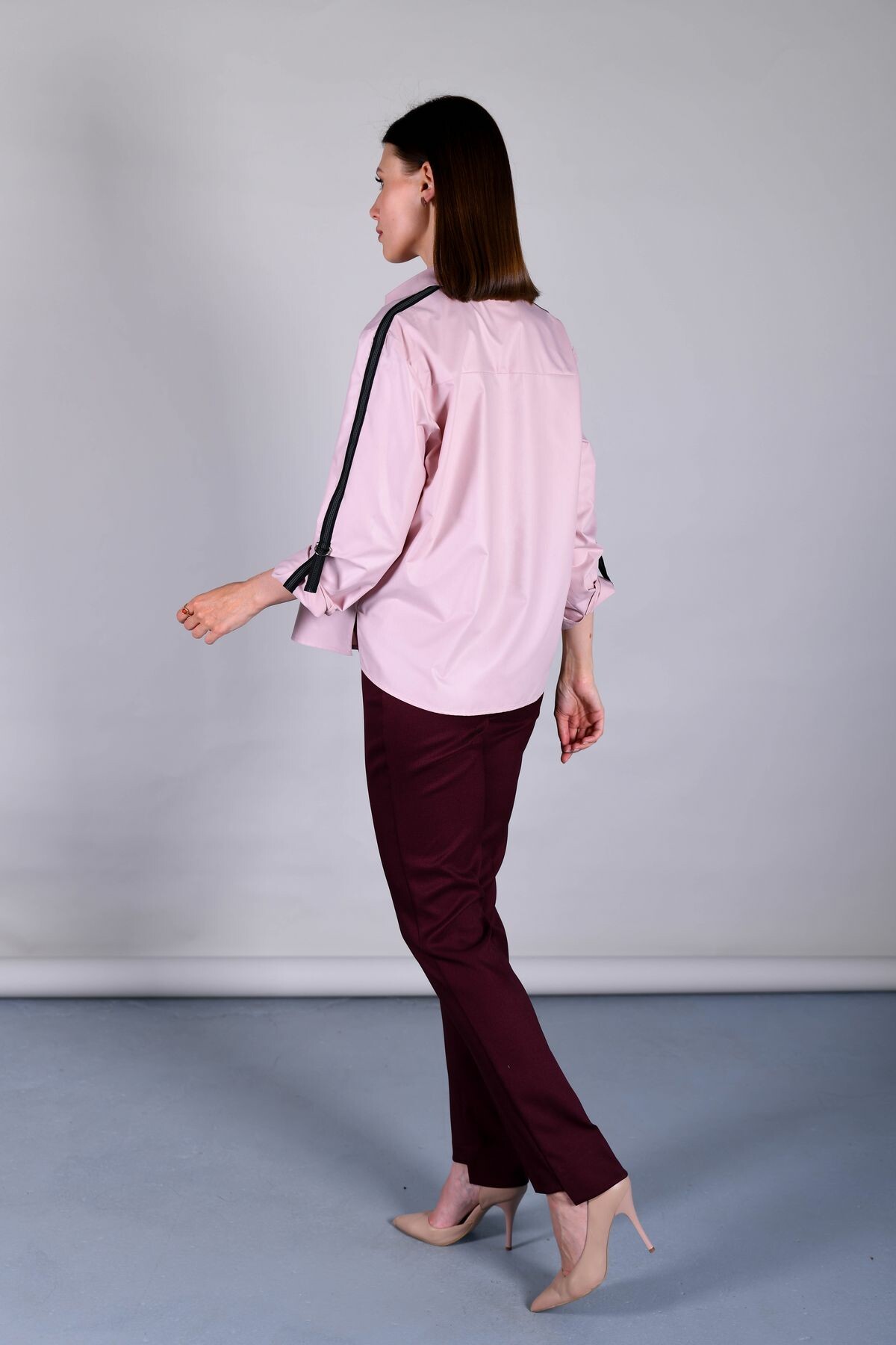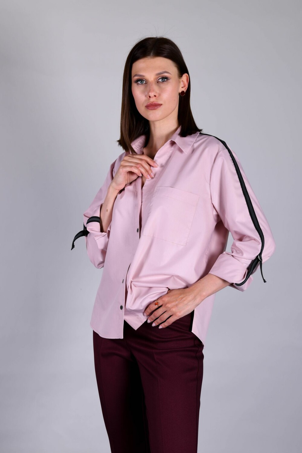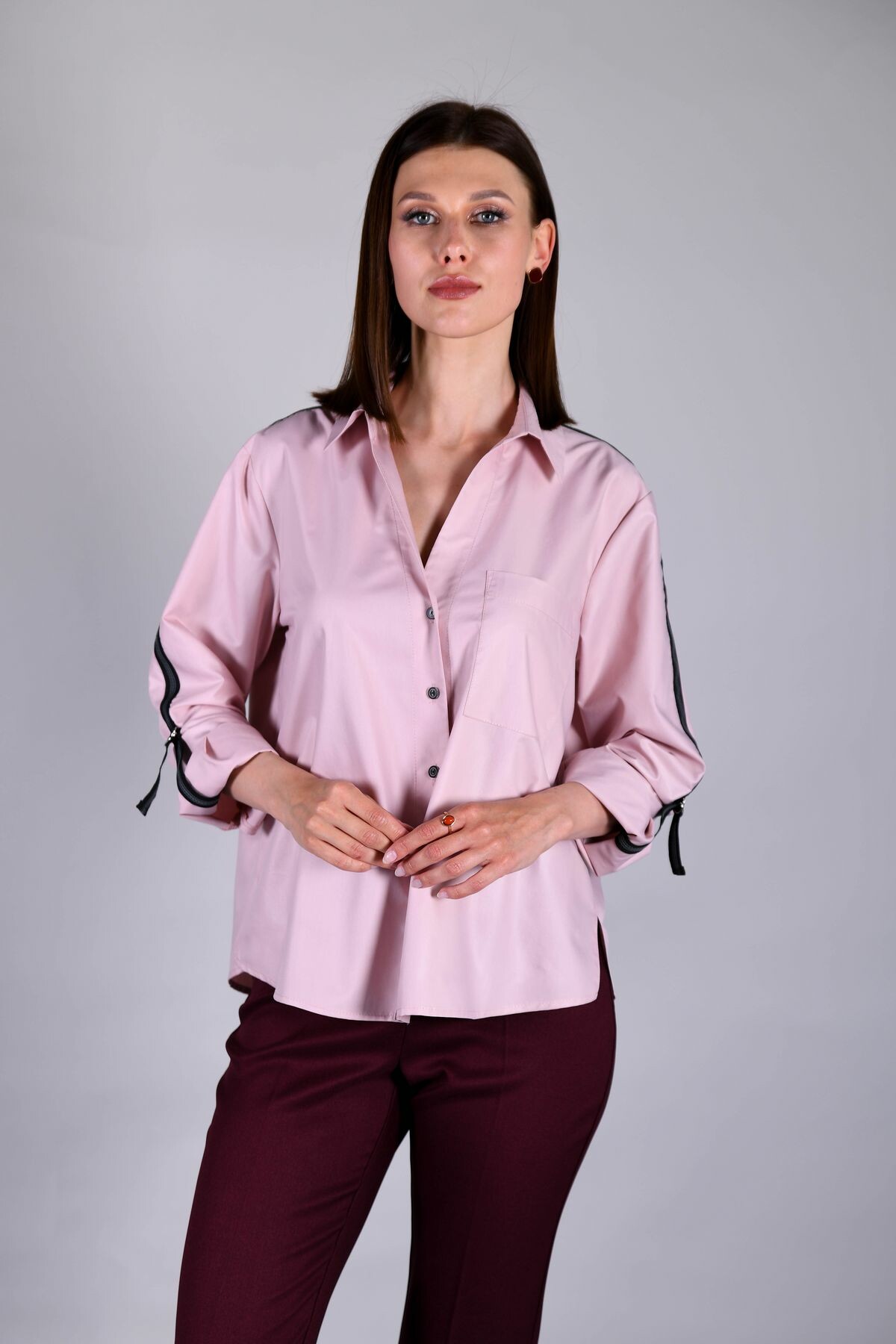 Рубашка свободного силуэта с отделкой тесьмой. Низ изделия закруглен, боковые швы обработаны разрезами. Регулировка рукава на пату, застежка на пуговицы по всей длине.