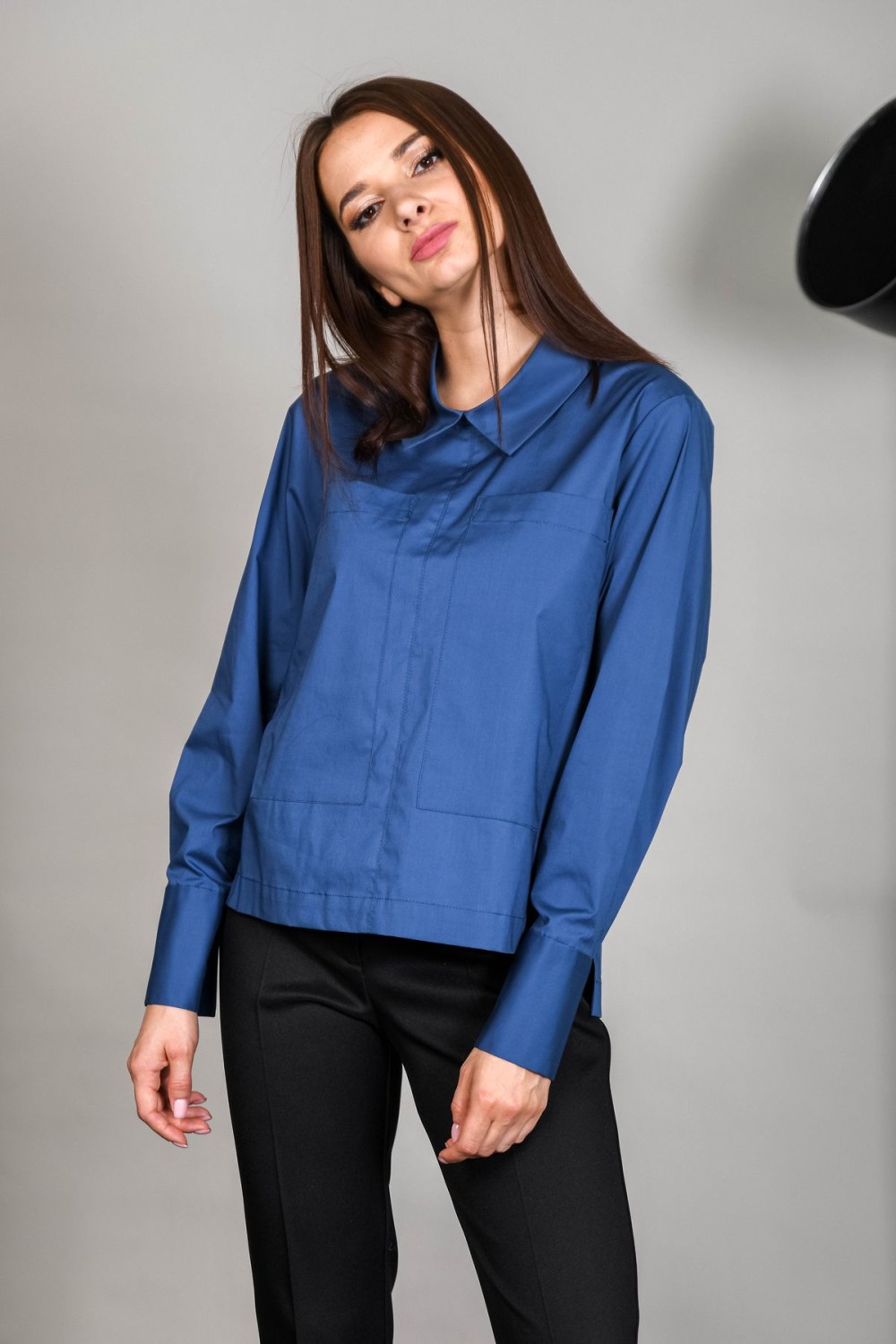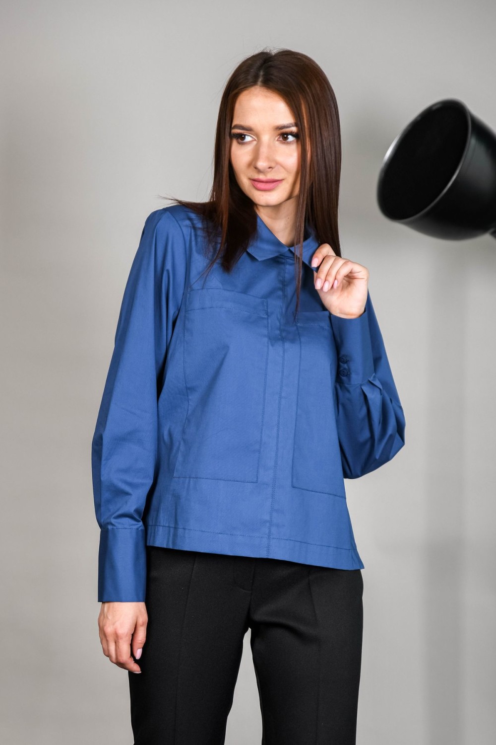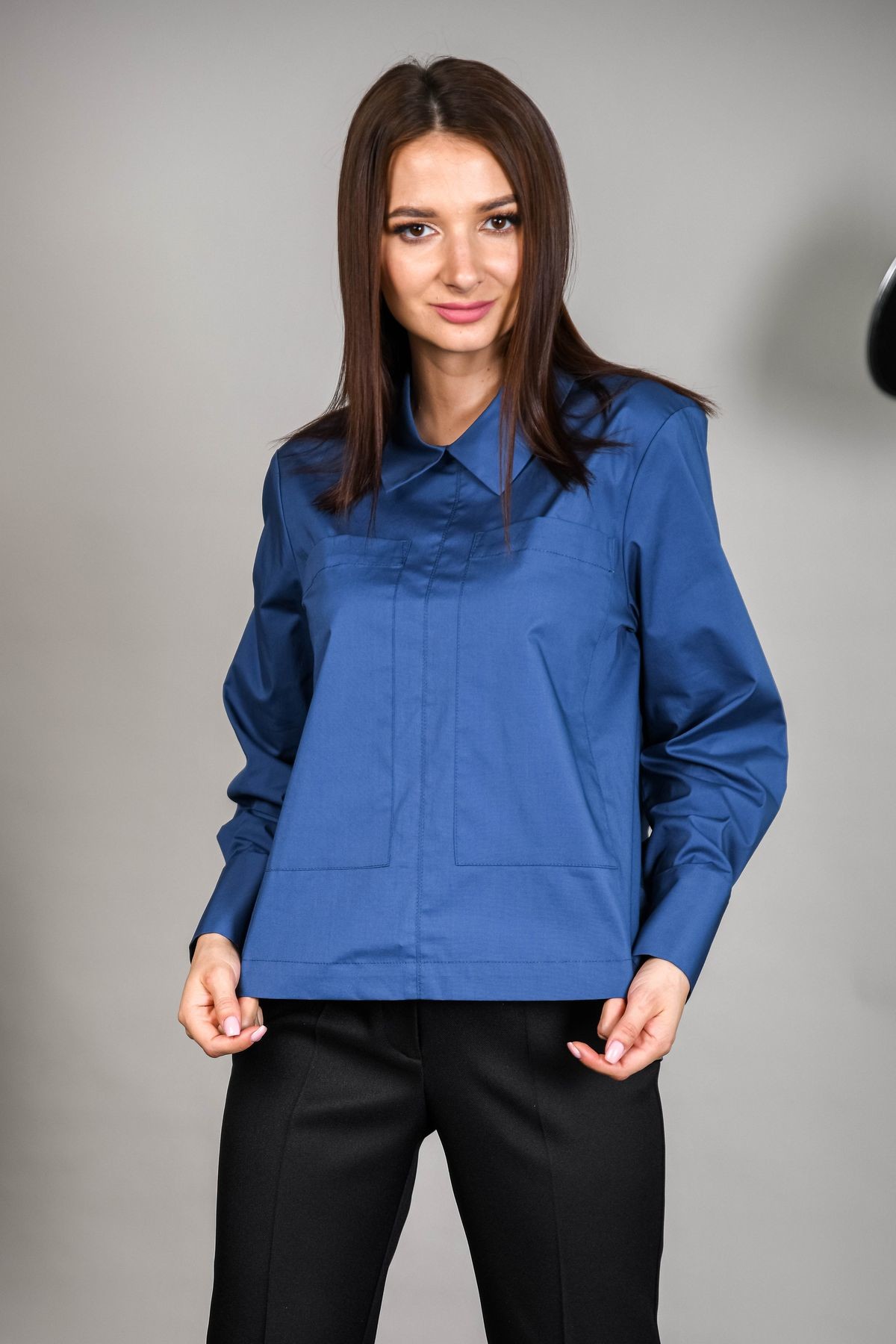 Блузка из хлопка прямого силуэта. На передней половинке накладные карманы. Изделие с перепадом длины - спинка длиннее. Отложной воротник, рукава обработаны манжетами.