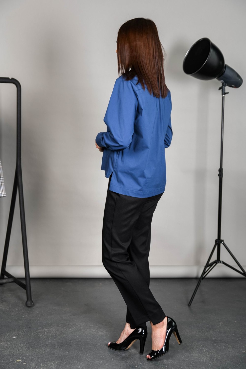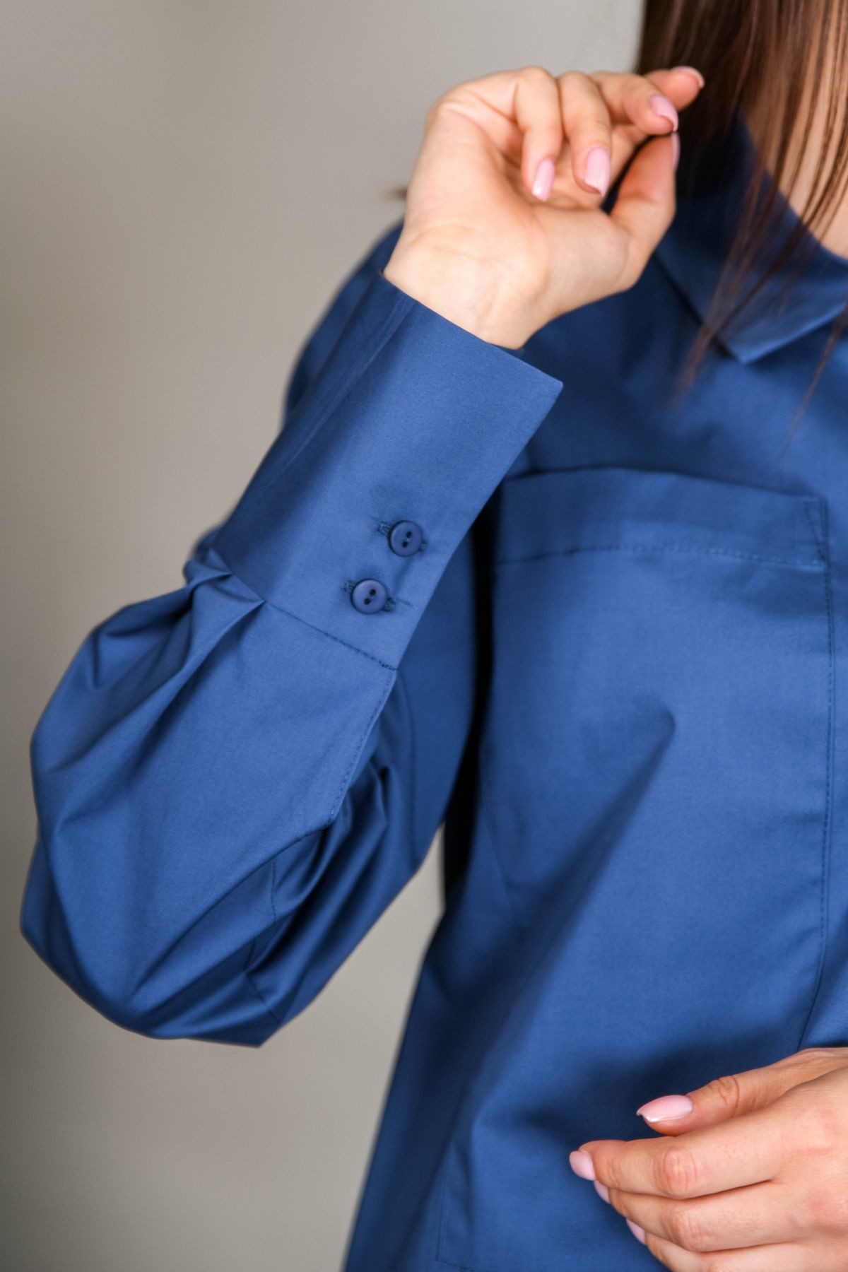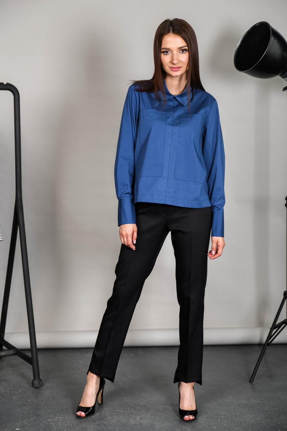 Блузка из хлопка прямого силуэта. На передней половинке накладные карманы. Изделие с перепадом длины - спинка длиннее. Отложной воротник, рукава обработаны манжетами.