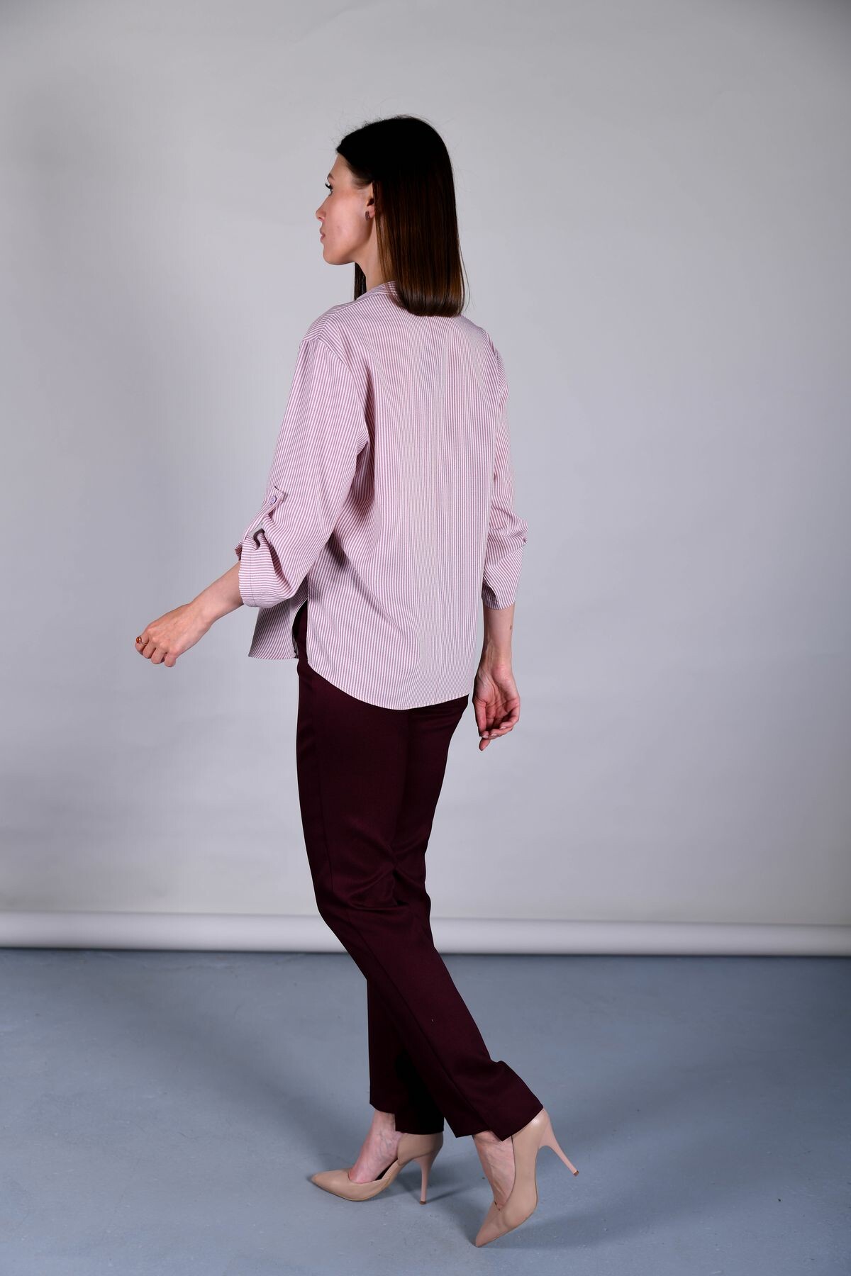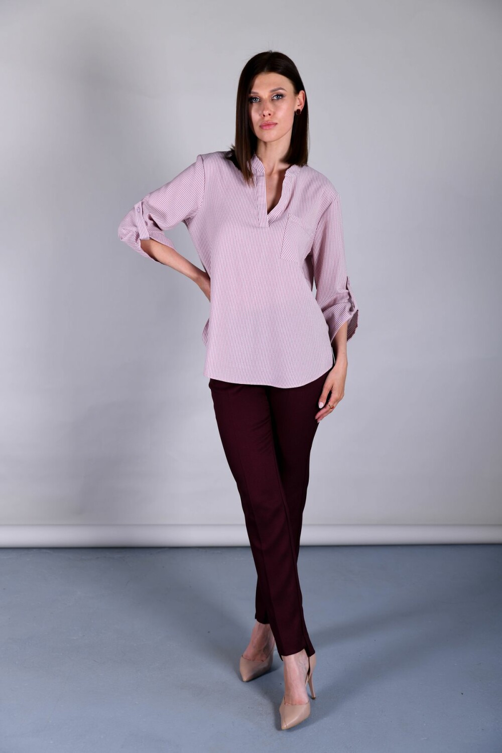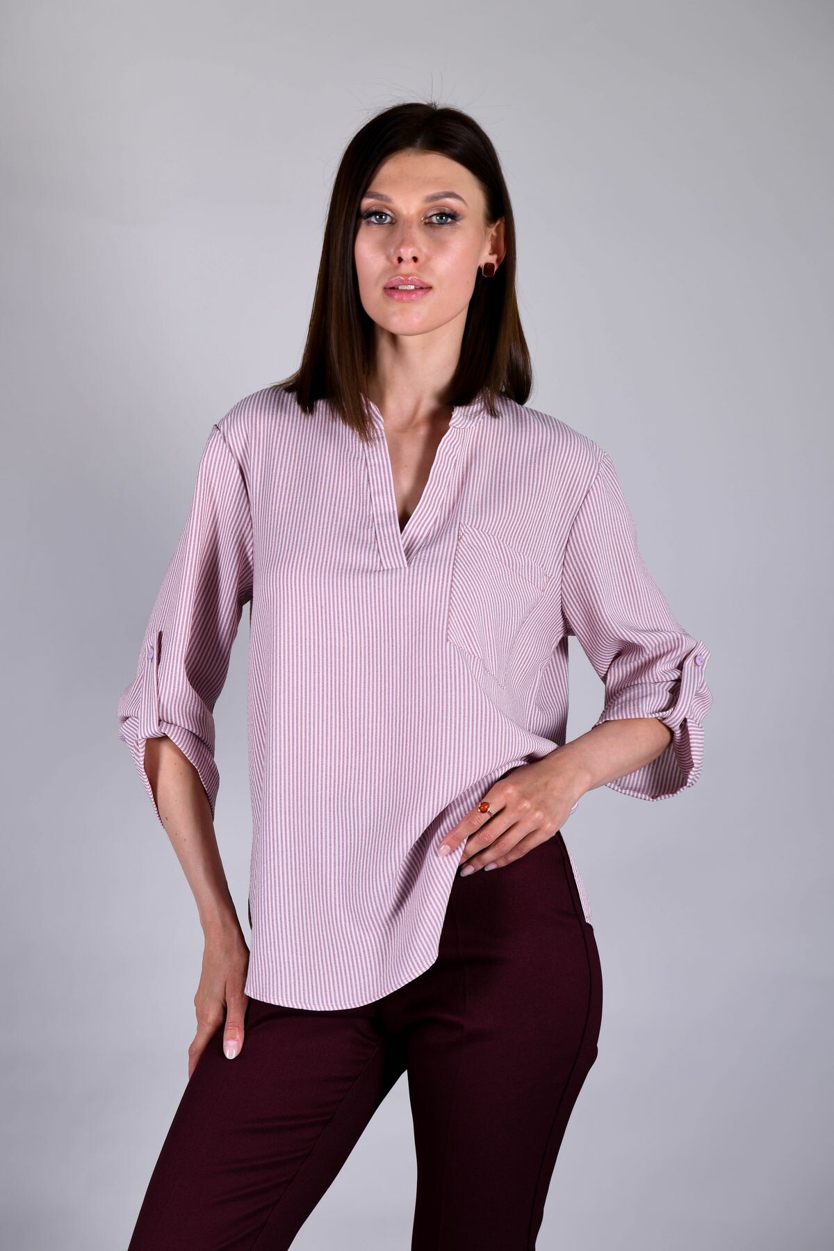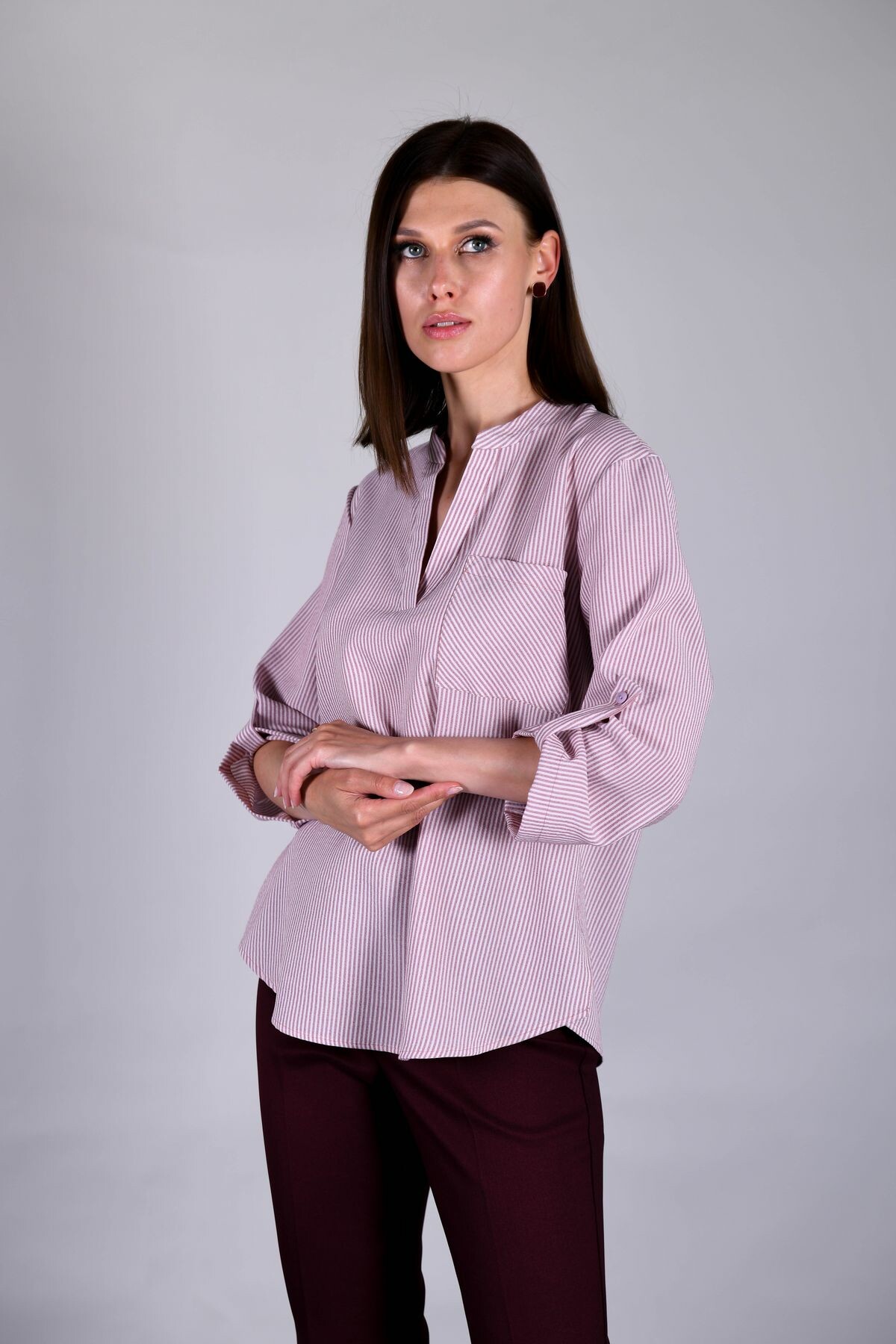 Блузка прямого силуэта. Воротник-стойка, переходящий в "галочку", накладной карман.