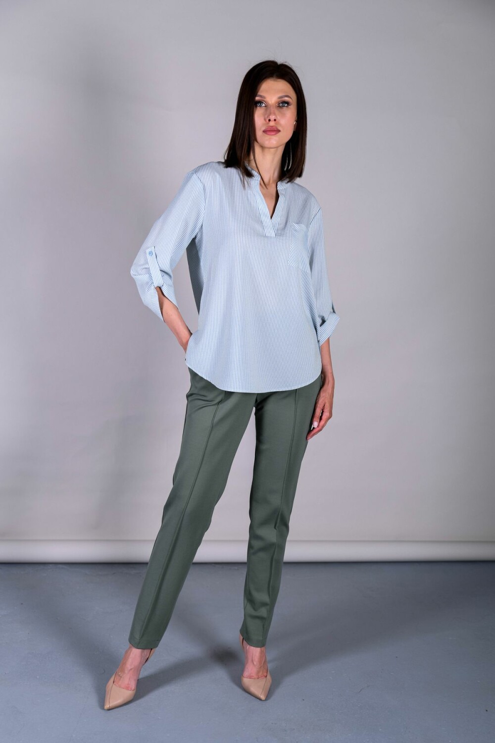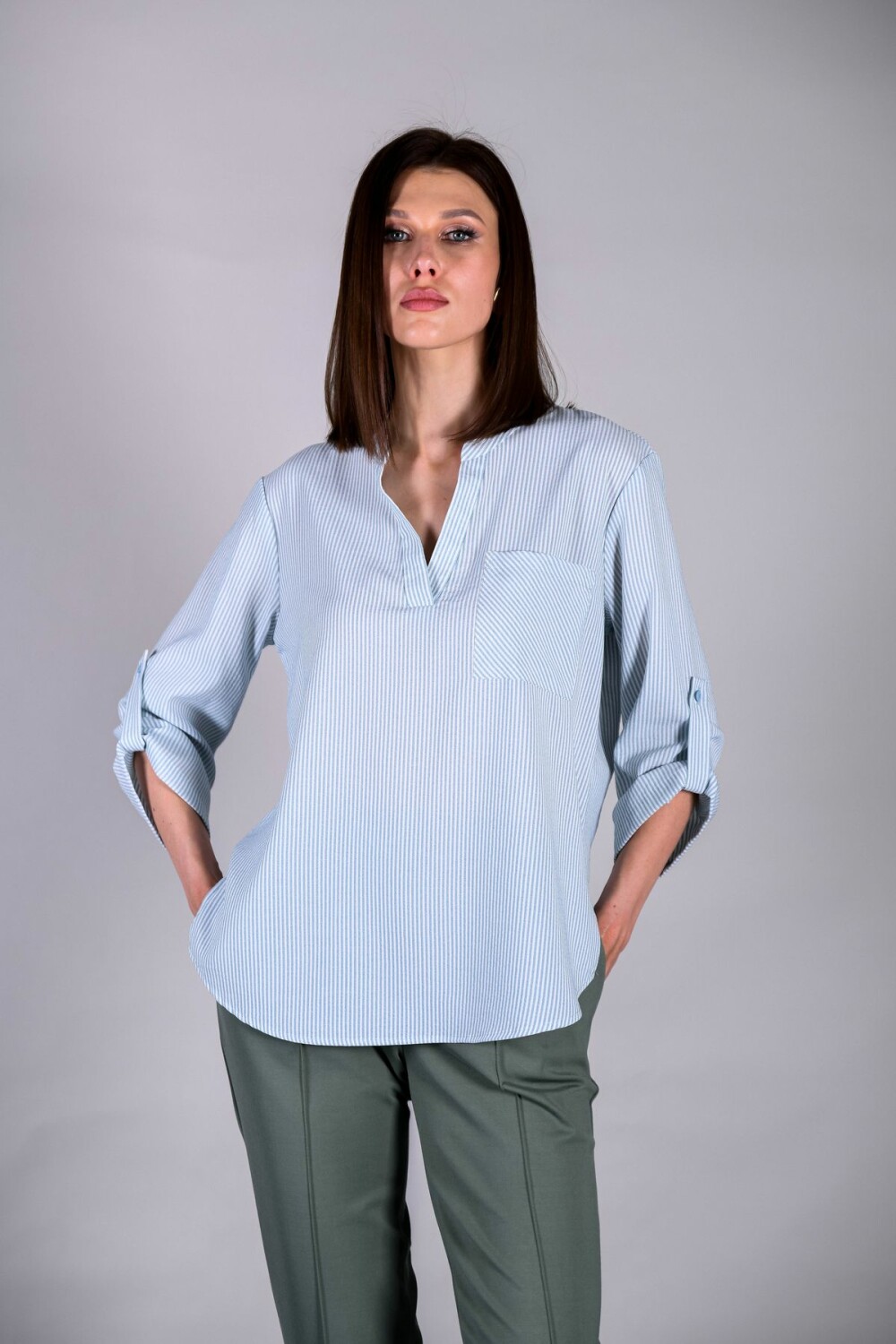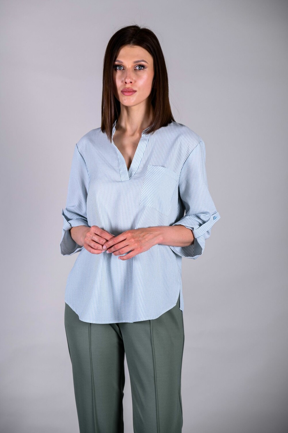 Блузка прямого силуэта. Воротник-стойка, переходящий в "галочку", накладной карман.