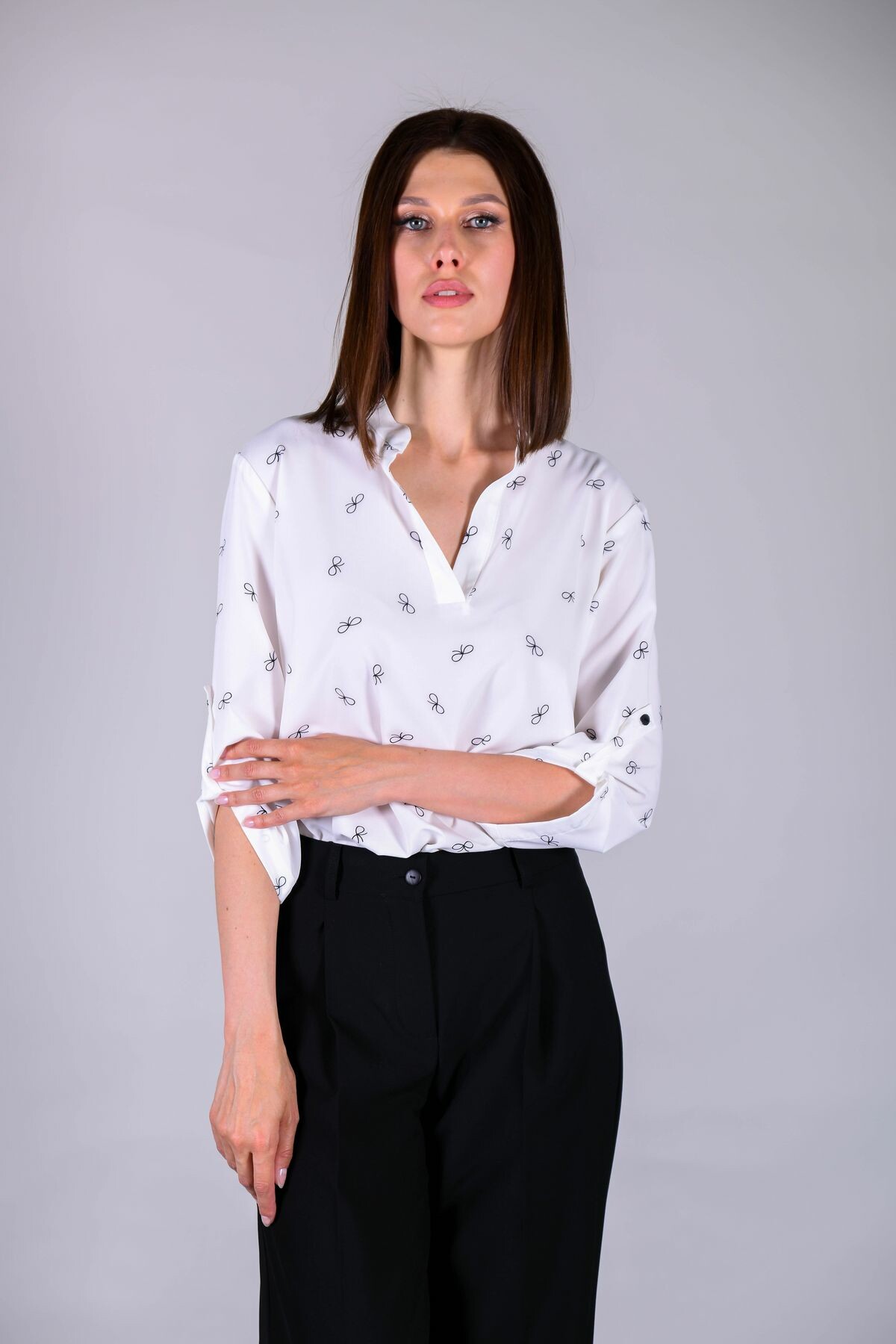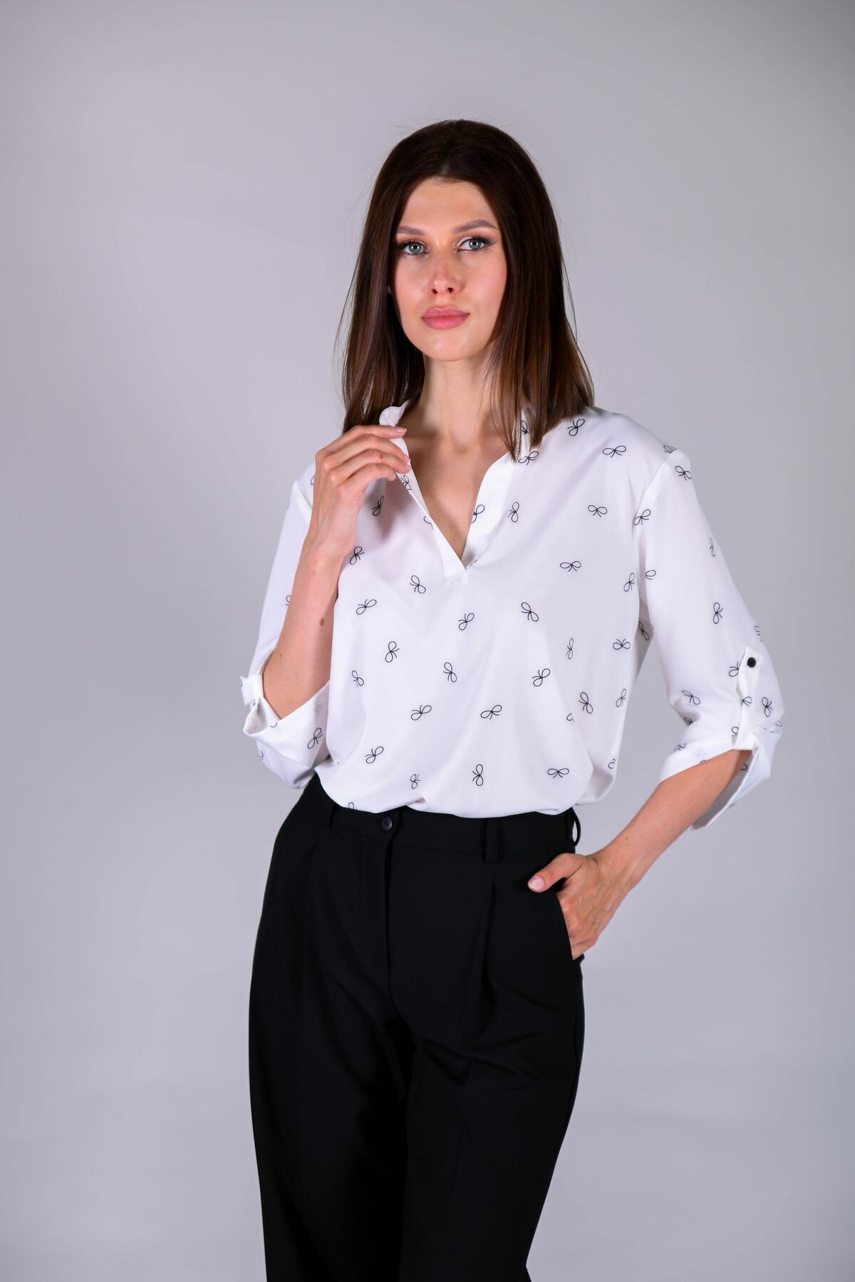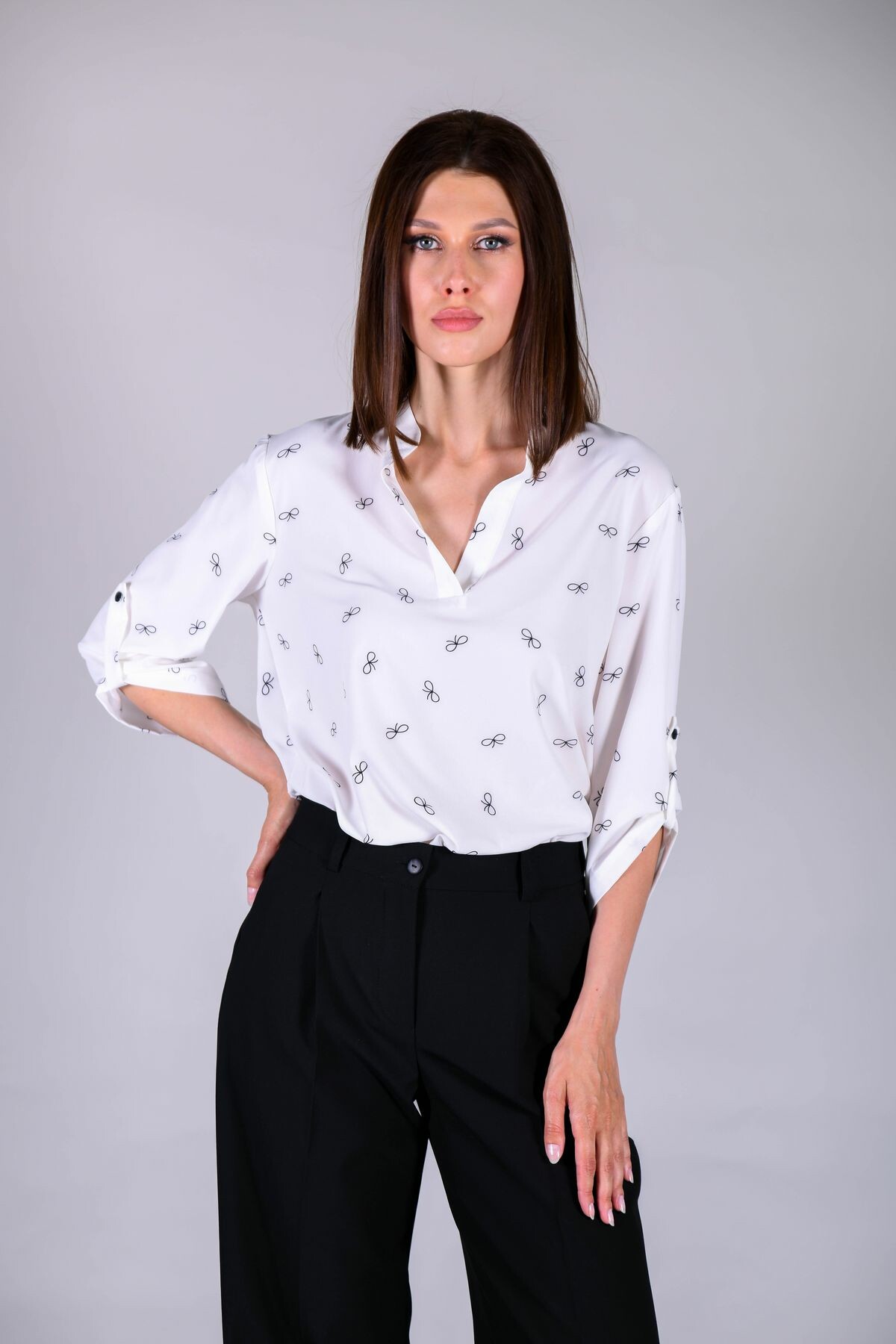 Туника прямого свободного силуэта. Воротник-стойка, переходящий в разрез. Регулировка рукава на пату, низ модели закруглен.