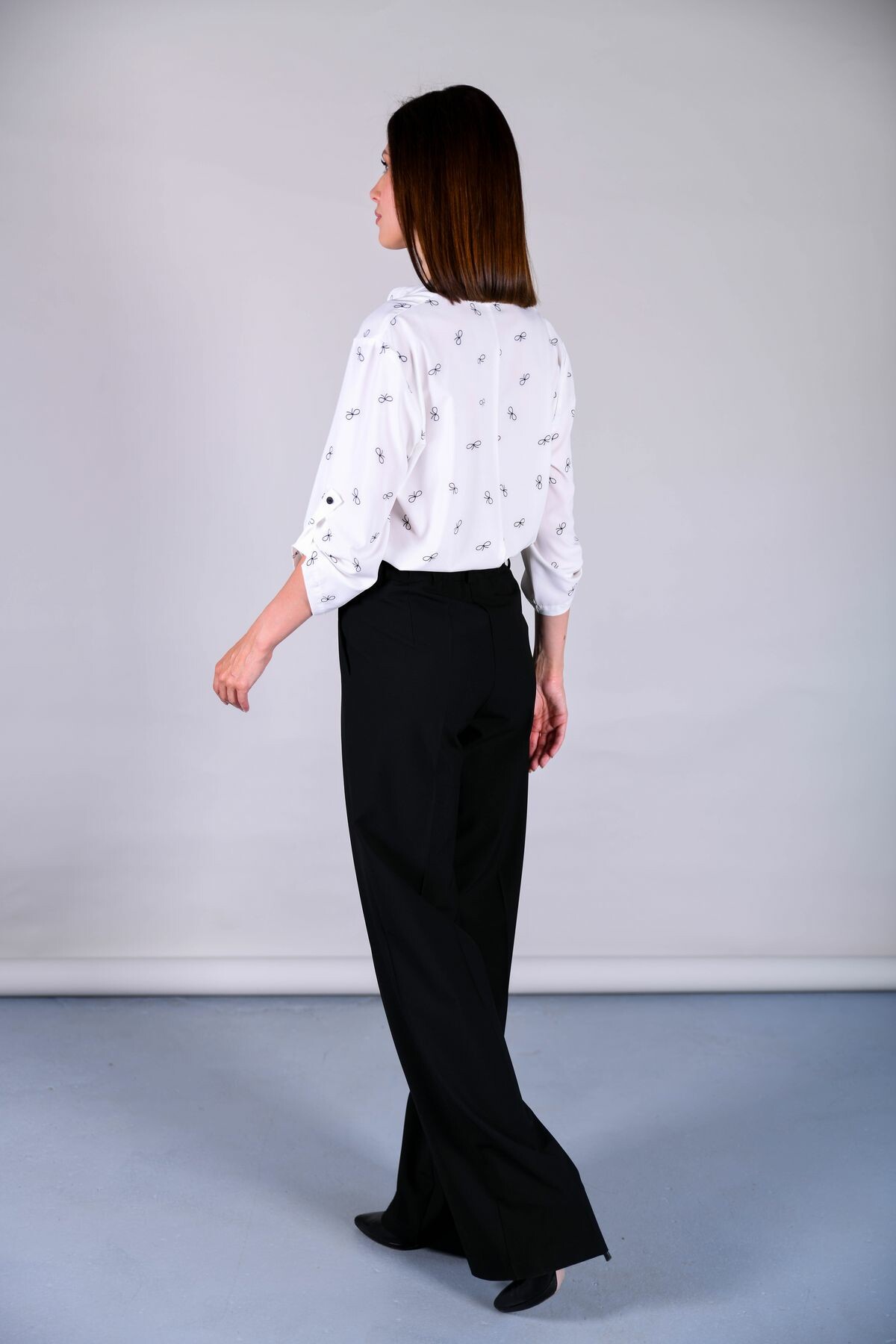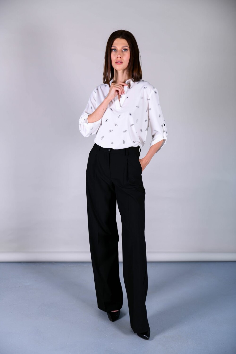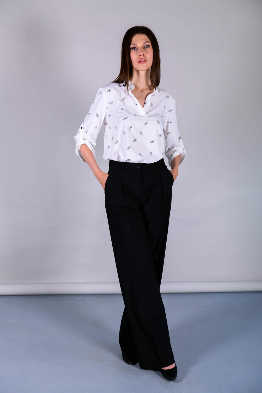 Туника прямого свободного силуэта. Воротник-стойка, переходящий в разрез. Регулировка рукава на пату, низ модели закруглен.