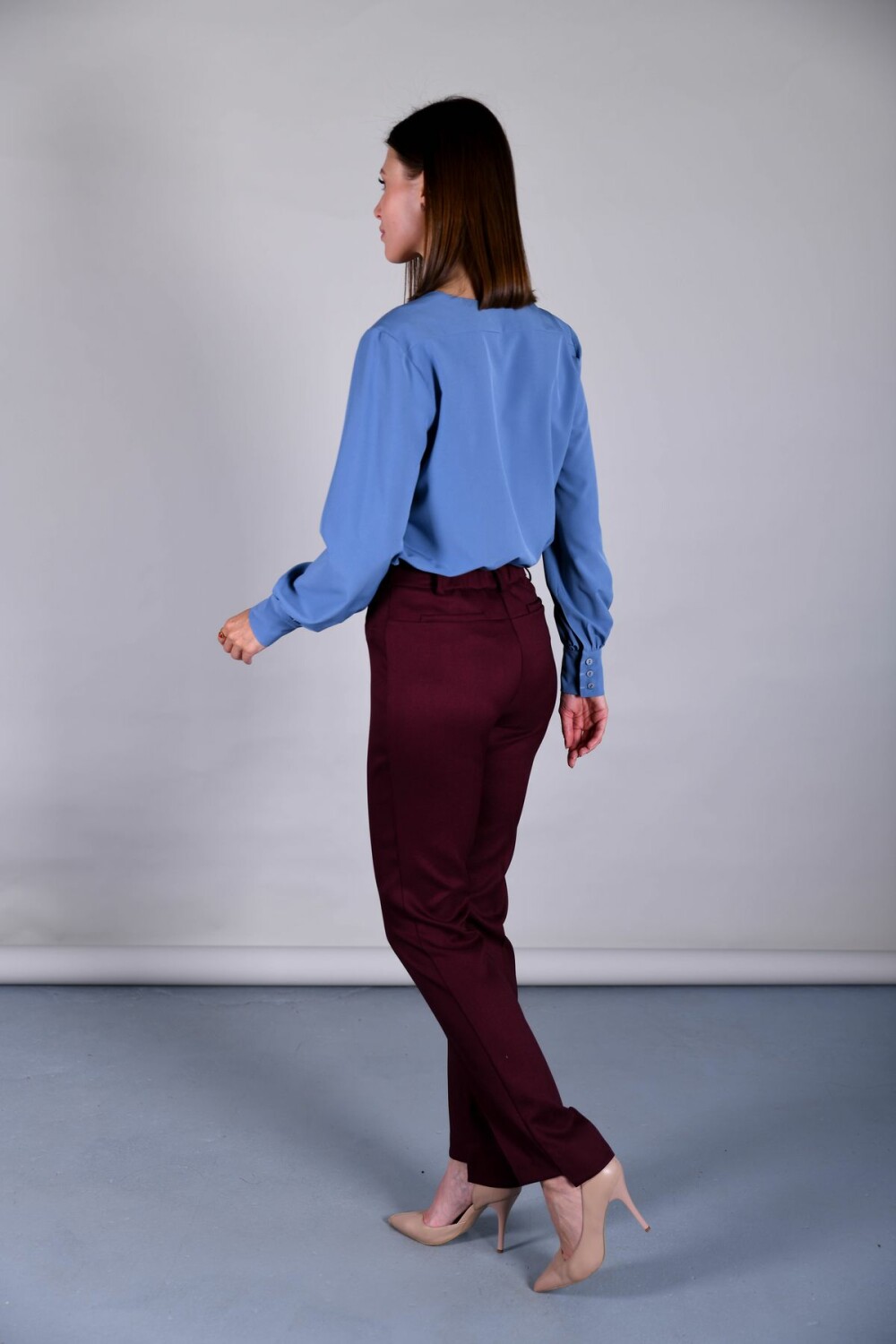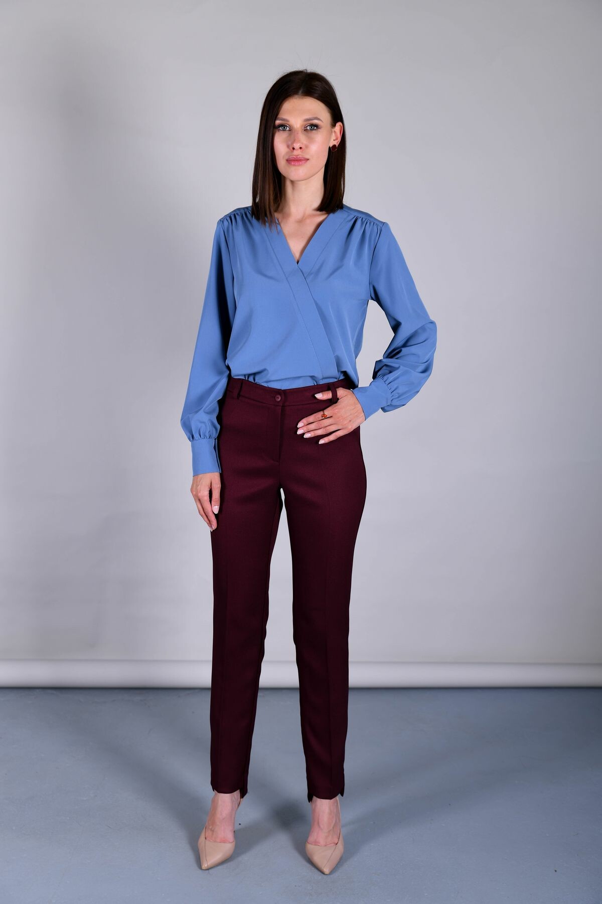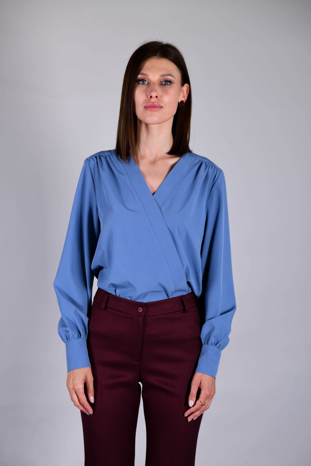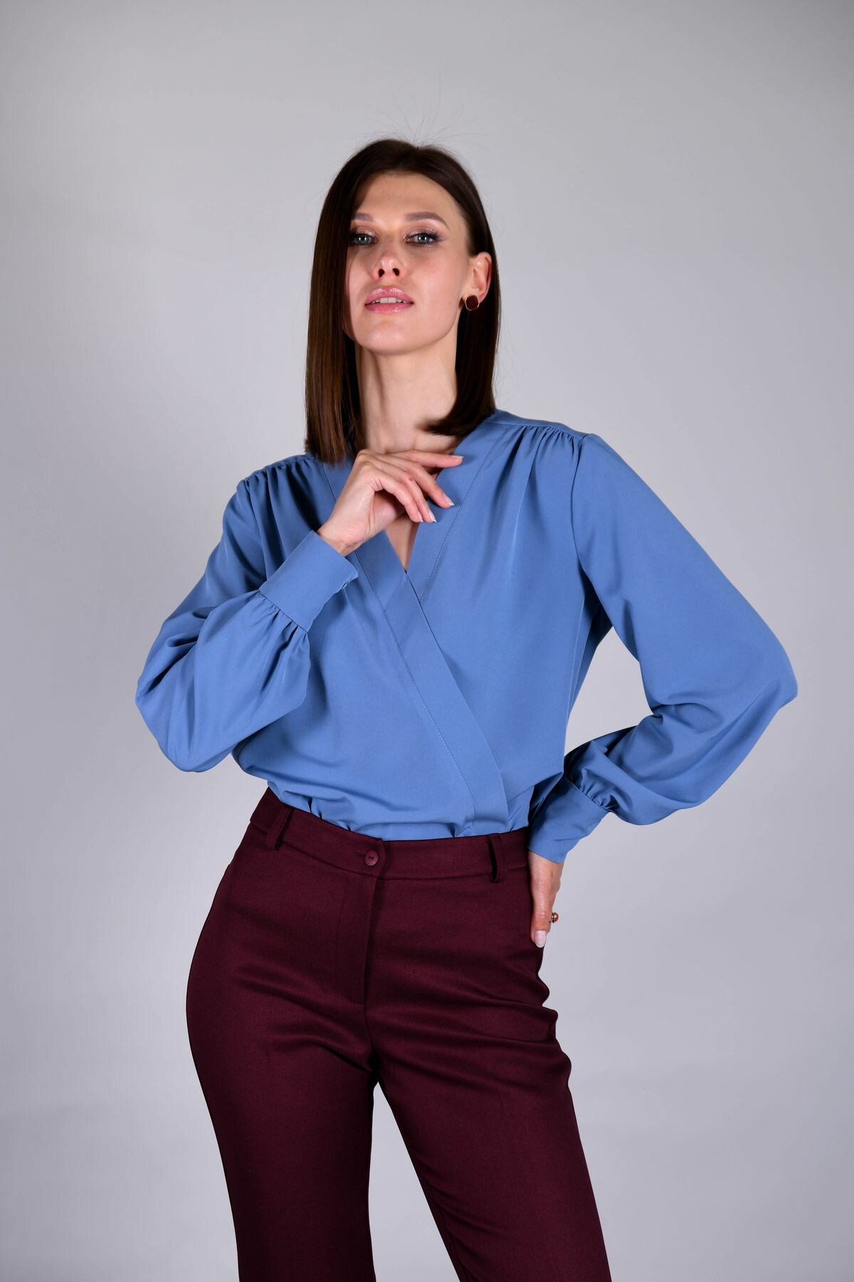 Блузка прямого силуэта с имитацией запАха. Отделка изделия выполнена из контрастного полотна с принтом (в зависимости от расцветки). Длинный втачной рукав обработан манжетой.